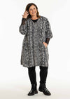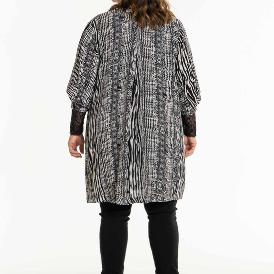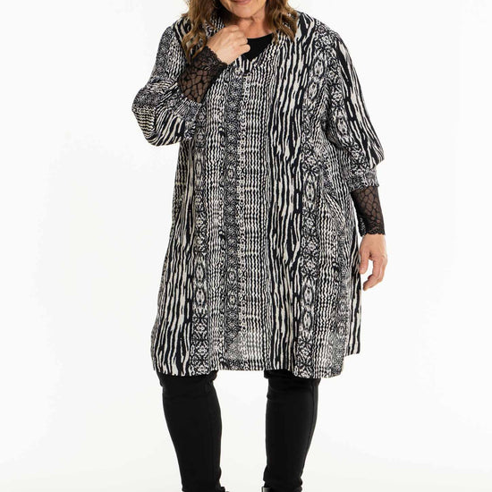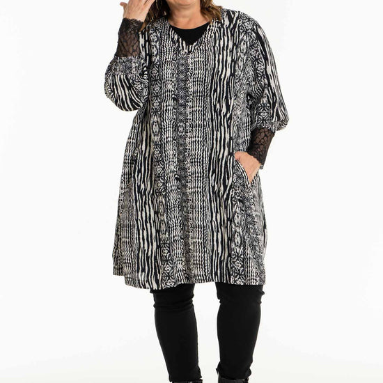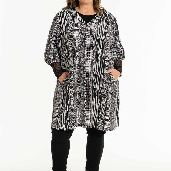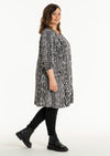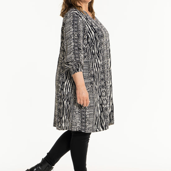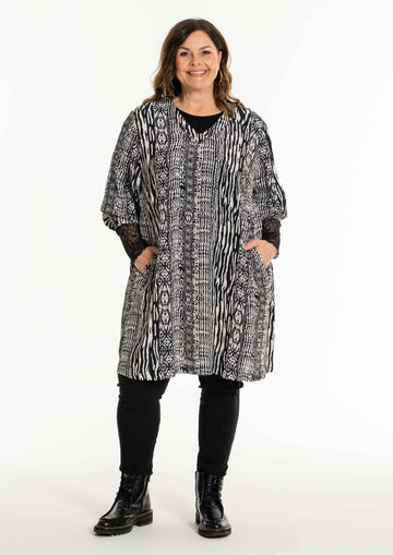 Denne tunic i størrelse M har en halv brystmål på 65 cm og en længde på 97 cm, hvilket sikrer en behagelig og rummelig pasform. Tilgængelig i størrelserne S, M, L og XL, kan alle finde deres perfekte match. Farvekombinationen af sort og off-white gør den nem at style med dine yndlings plus-size bukser eller en elegant nederdel for et sofistikeret hverdagslook eller en aften ude.