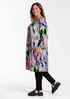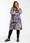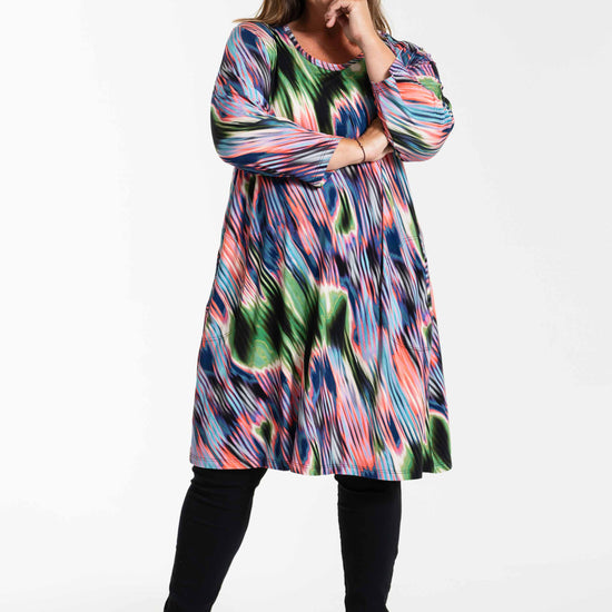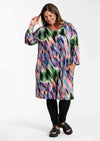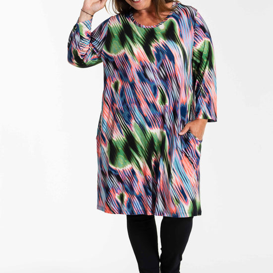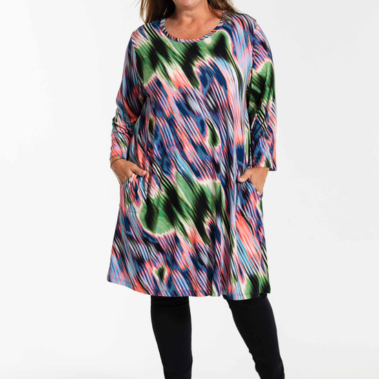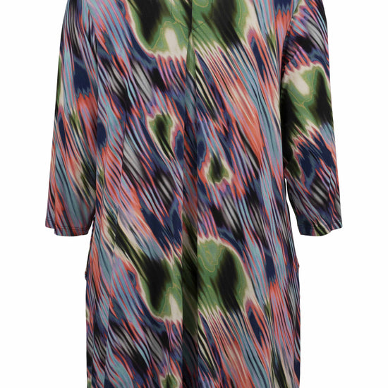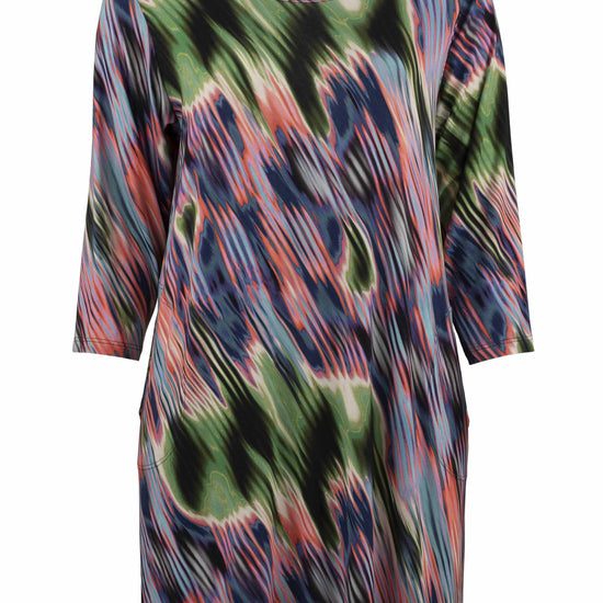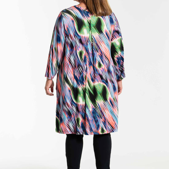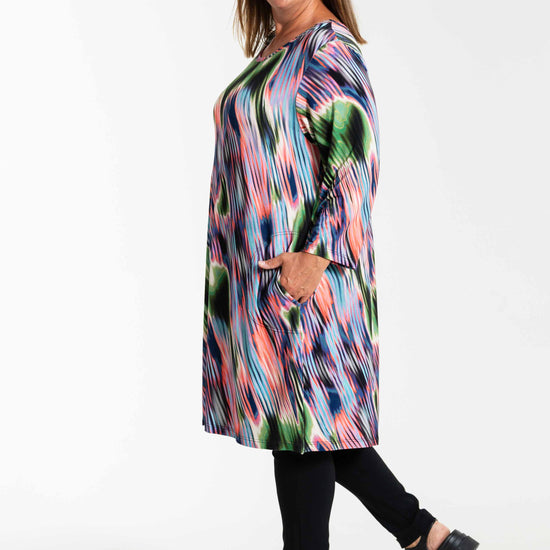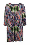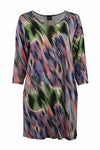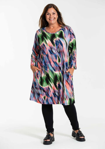 Denne tunika er fremstillet i en blød jerseykvalitet med 95% viskose og 5% elastan, hvilket sikrer en behagelig pasform med masser af stræk. Med dens flerfarvede print og afslappede snit er den et perfekt valg til enhver garderobe.