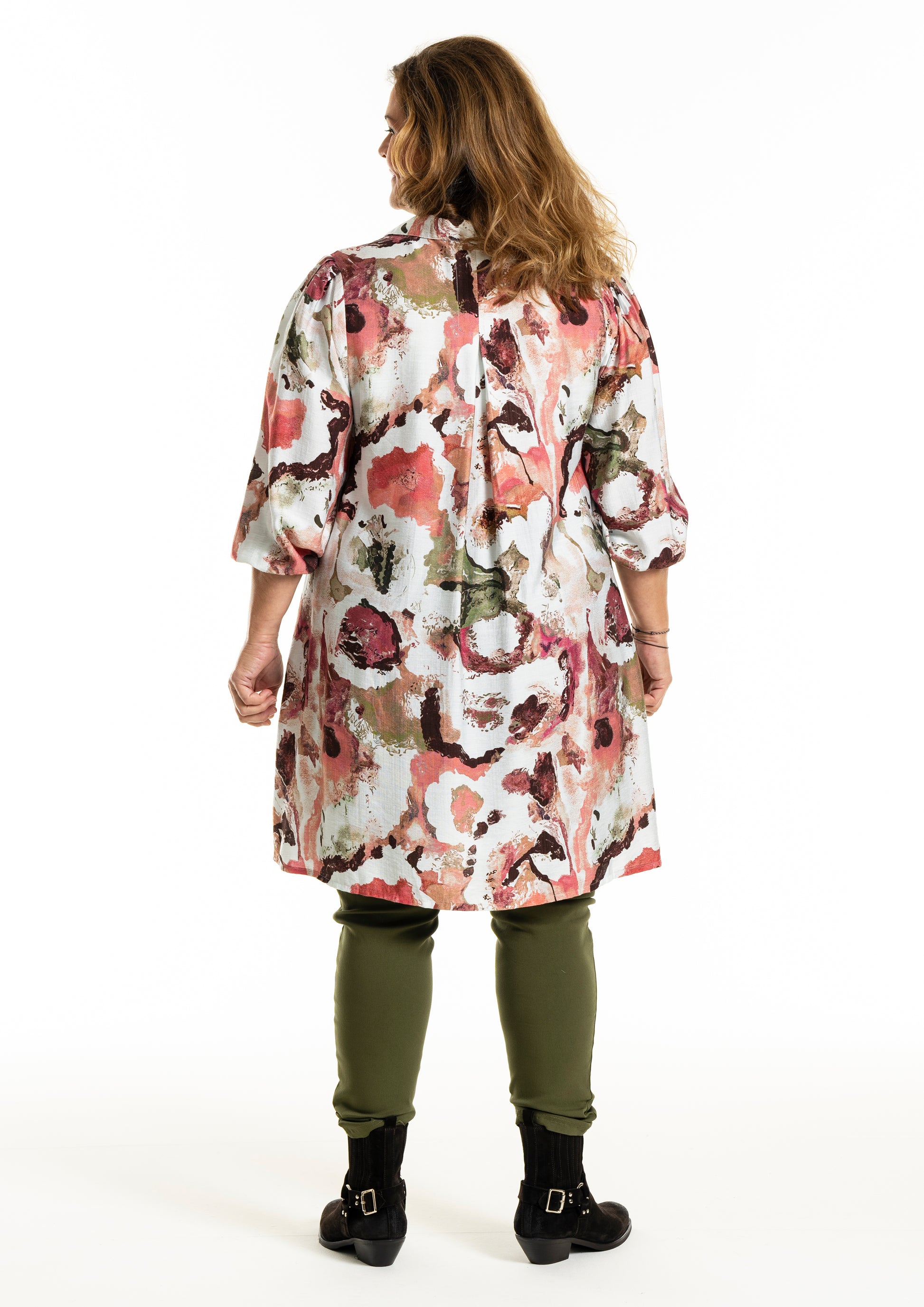 Med en halv brystvidde på 65 cm og en længde på 97 cm i størrelse M, tilbyder denne tunika en flatterende pasform. Den stilfulde skjortekrave afsluttes i en V-udskæring, mens de lange ærmer med tynde elastiske manchetter tilføjer en feminin detalje. Denne tunika er ideel til både hverdag og festlige lejligheder, og du kan nemt style den med et par leggings eller jeans for et komplet look.