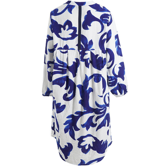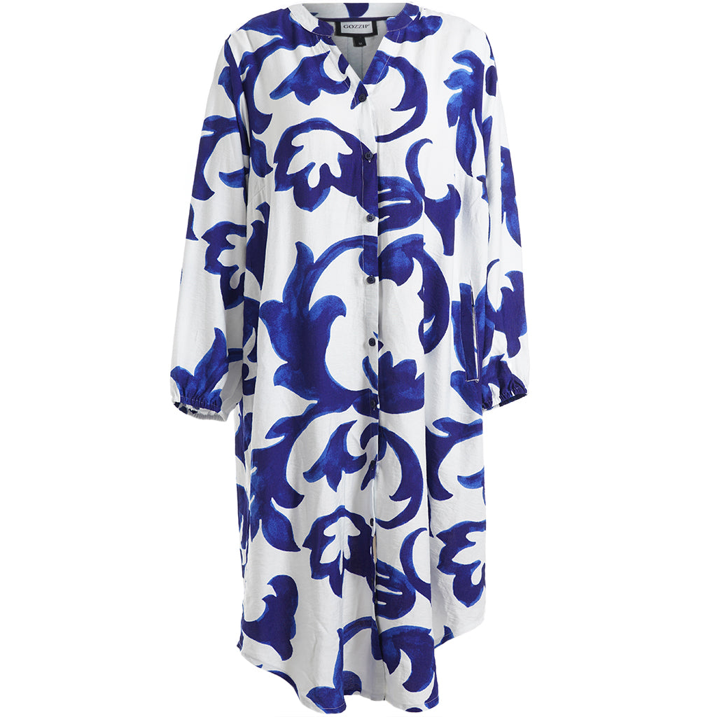 Denne elegante kjole fra Gozzip Woman fanger øjet med sit markante grafiske print i smukke blå nuancer på en klassisk offwhite baggrund. Designet byder på en feminin udstråling med en gennemgående knaplukning og en klædelig halsudskæring, der giver et let og luftigt udtryk. Modellen har lange ærmer med en let samling ved håndleddet samt en flot afrundet kant forneden, der skaber et moderne snit. Kjolen har en behagelig A-form, der giver masser af plads og gør den oplagt til at style med kjoler i store størrelser til både hverdag og fest.