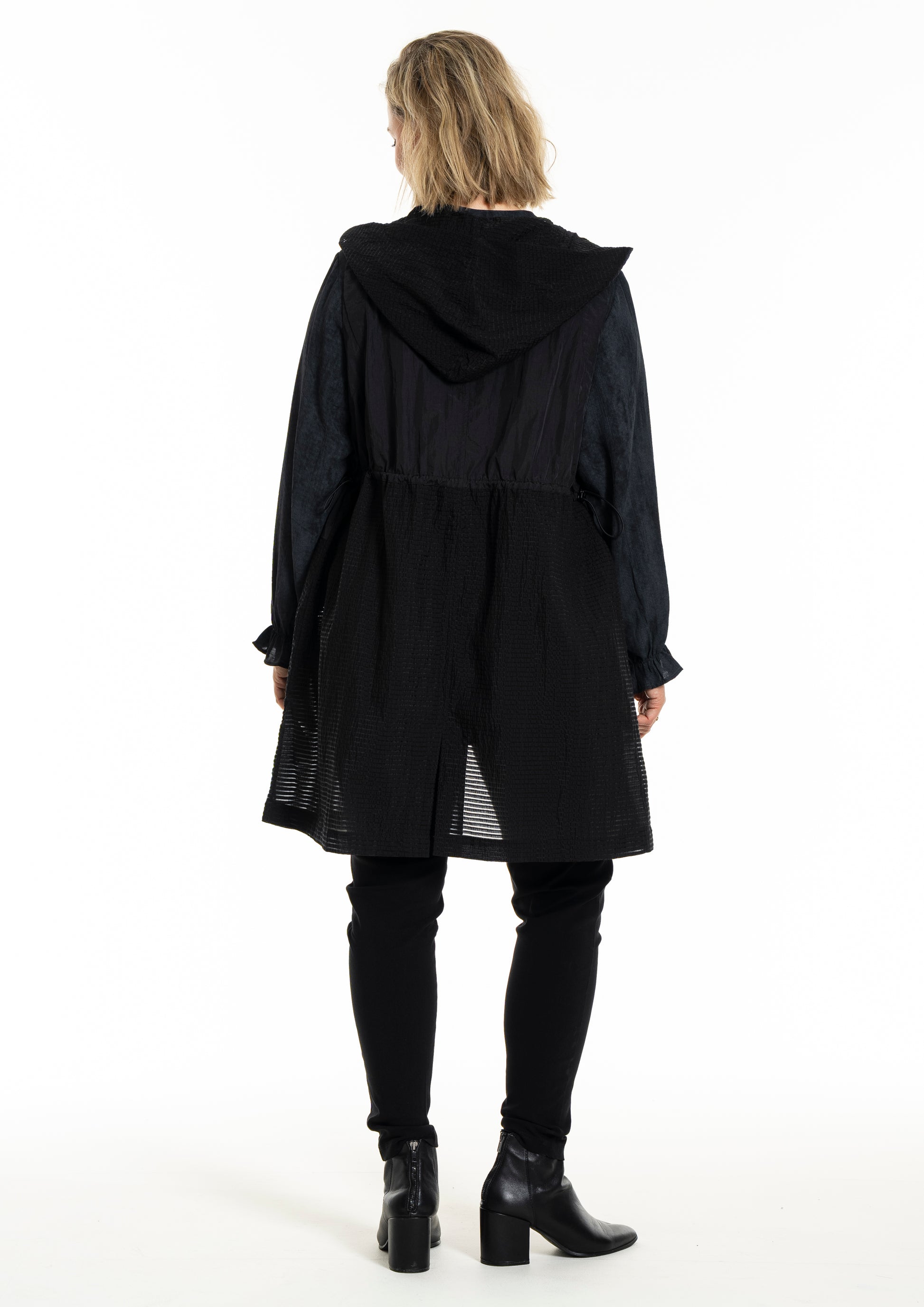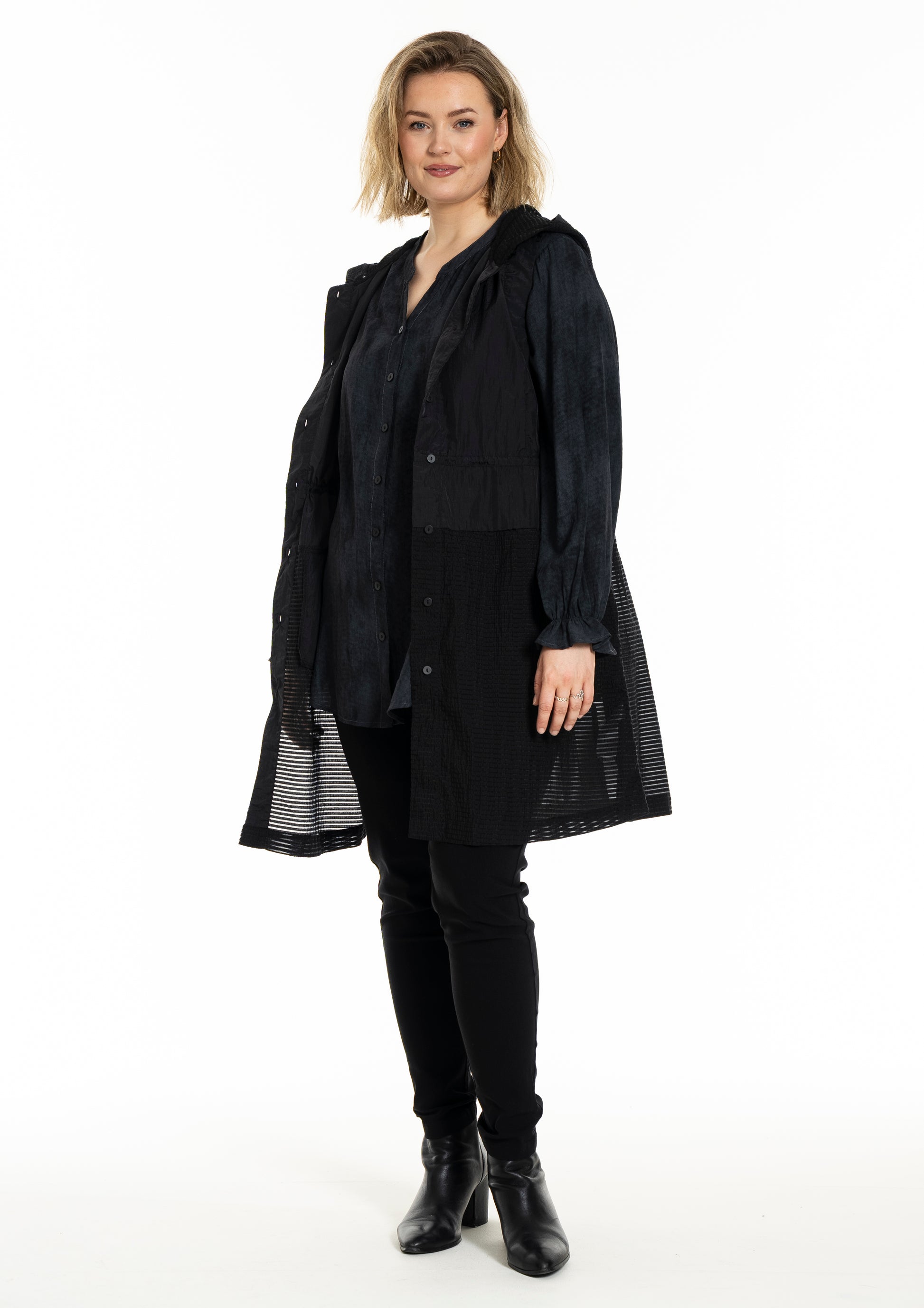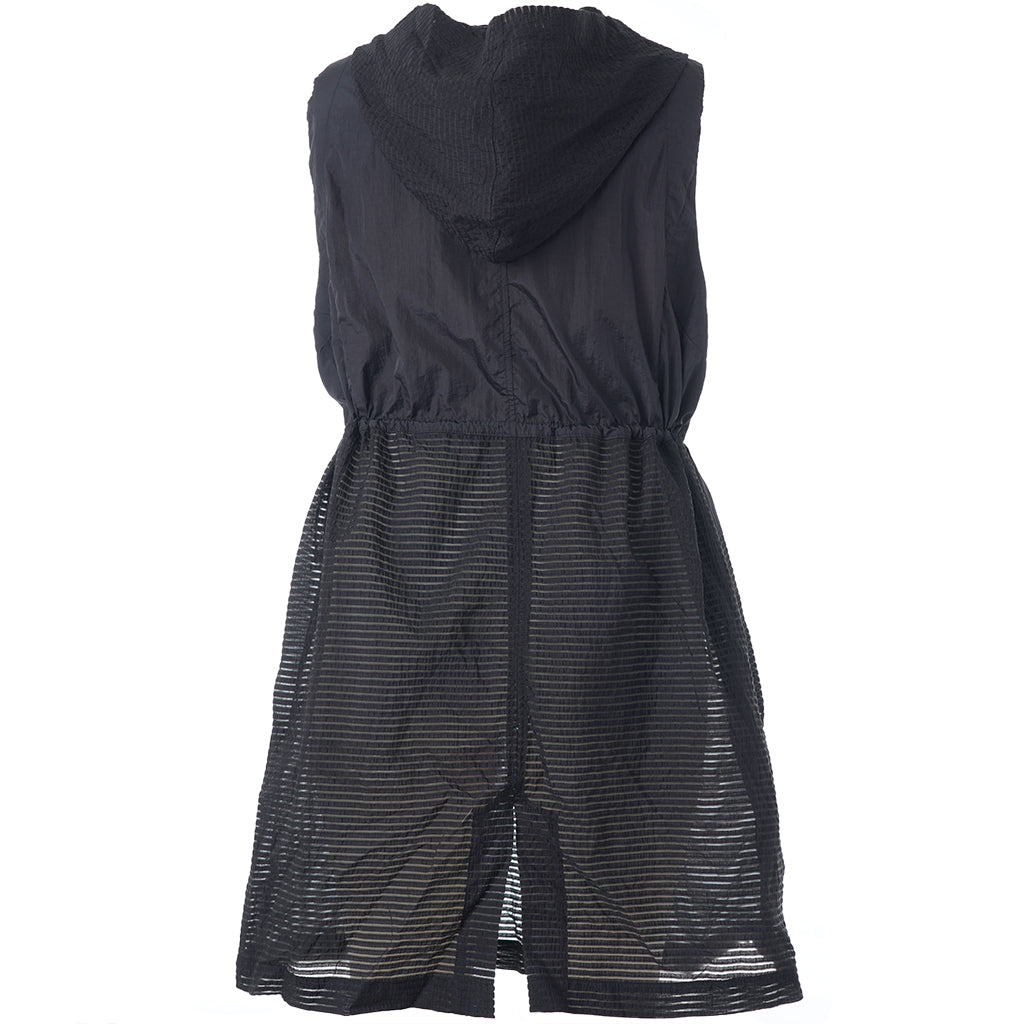 Denne elegante sorte vest er designet til at give dit outfit kant og personlighed. Modellen er fremstillet i en blød blanding af bomuld og nylon, hvilket sikrer en behagelig komfort og en flot struktur i stoffet. På ryggen ses en fin detalje med snøre, der giver mulighed for at markere taljen, samt en hætte der tilfører et afslappet look. De vigtigste detaljer omfatter: