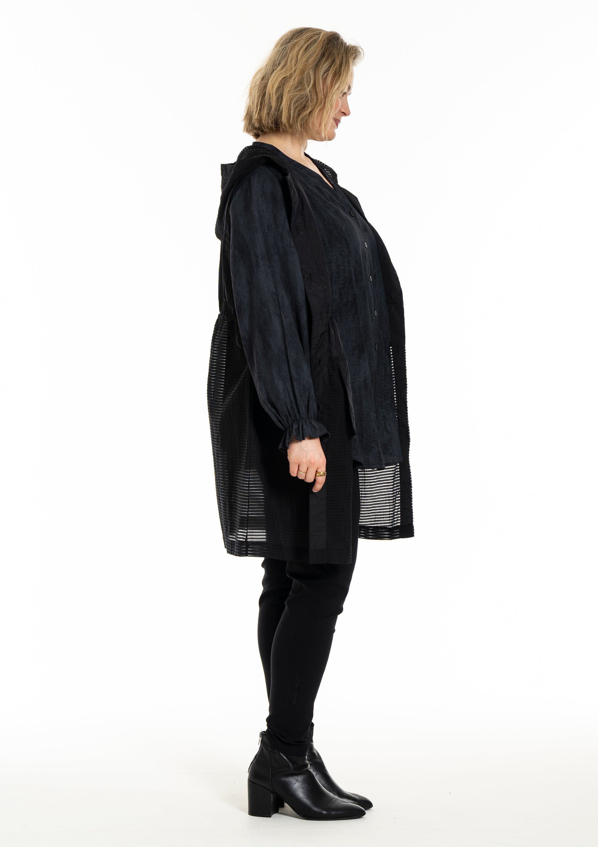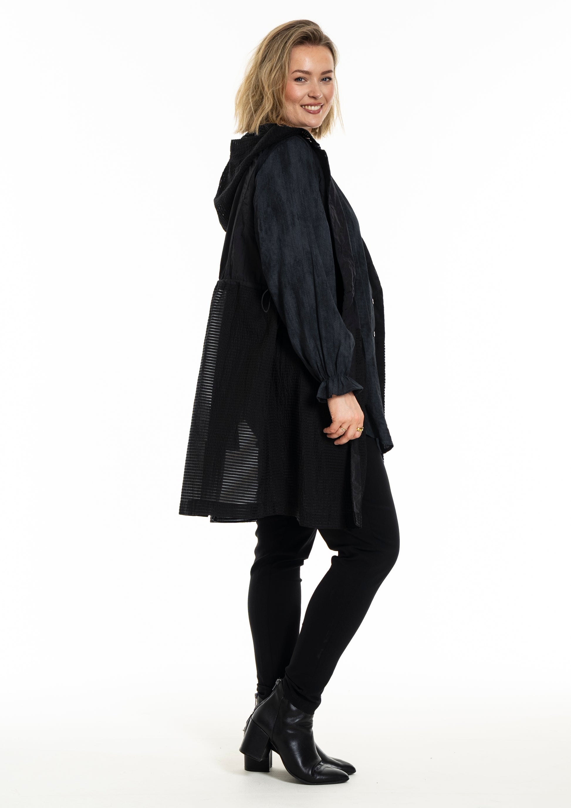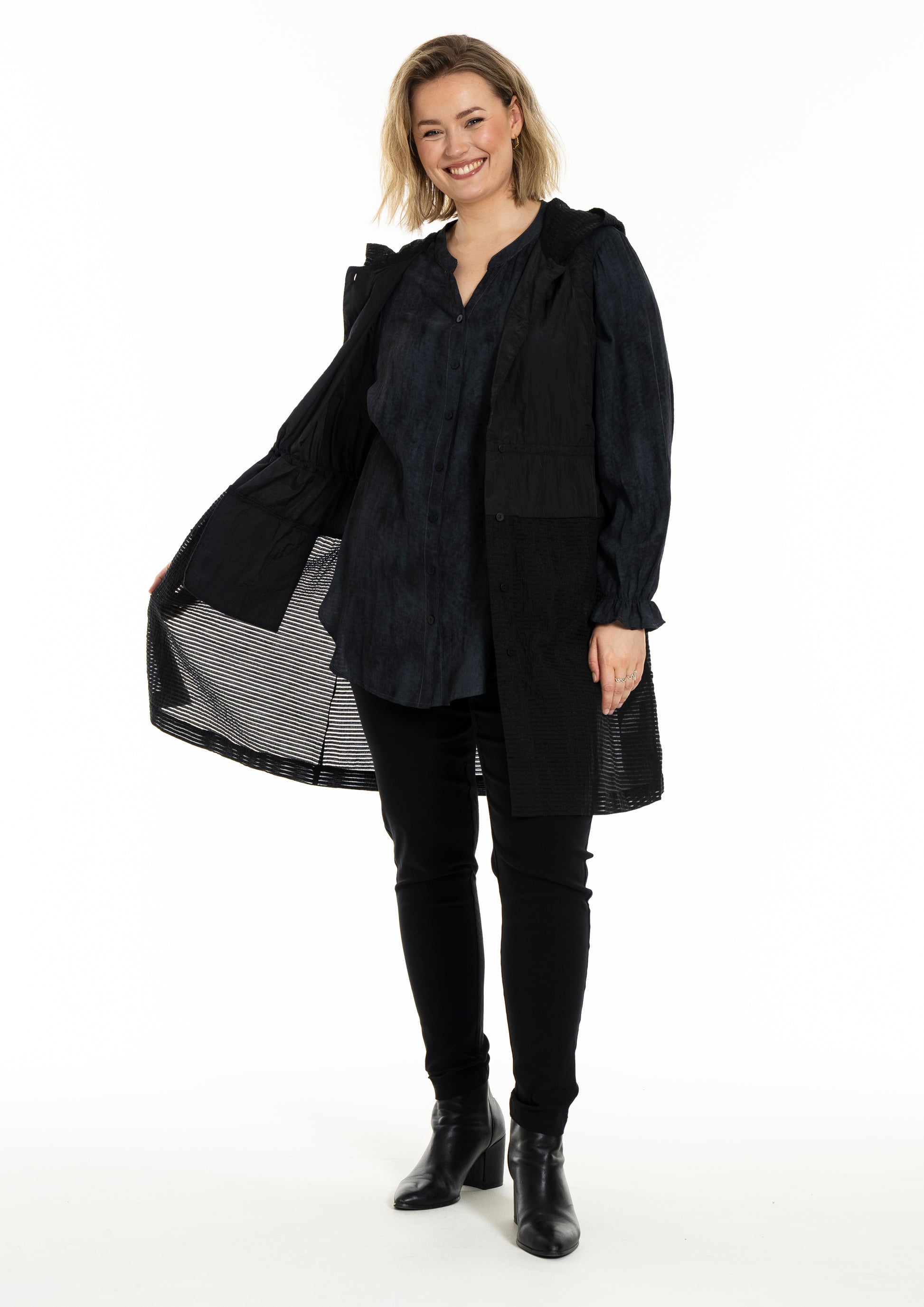 Denne elegante sorte vest er designet til at give dit outfit kant og personlighed. Modellen er fremstillet i en blød blanding af bomuld og nylon, hvilket sikrer en behagelig komfort og en flot struktur i stoffet. På ryggen ses en fin detalje med snøre, der giver mulighed for at markere taljen, samt en hætte der tilfører et afslappet look. De vigtigste detaljer omfatter: