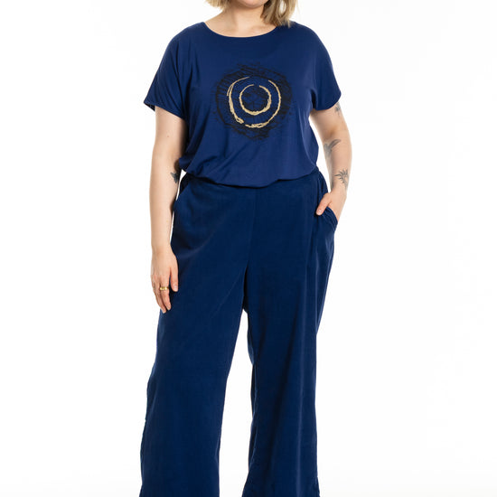 Disse lækre bukser i plus size er fremstillet af ren bomuld, hvilket sikrer en fantastisk komfort og åndbarhed dagen lang. Modellen har en behagelig elastikkant i taljen, som giver en fleksibel pasform, der ikke strammer, men former sig efter kroppen. De lige ben giver et roligt og flatterende udtryk, der passer perfekt ind i enhver garderobe.