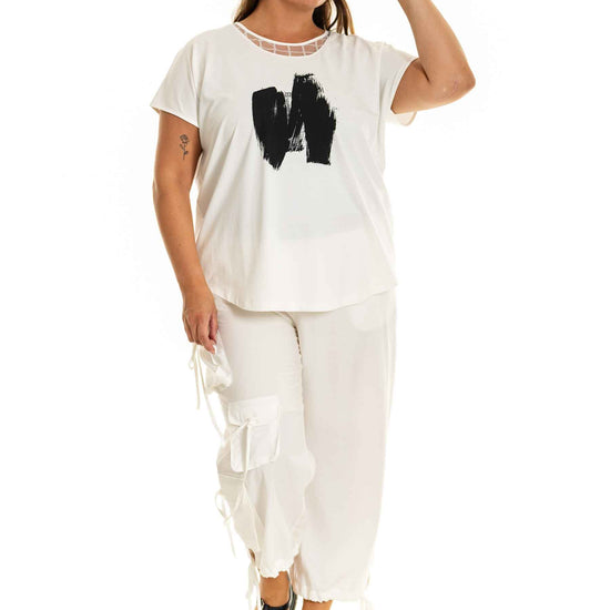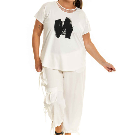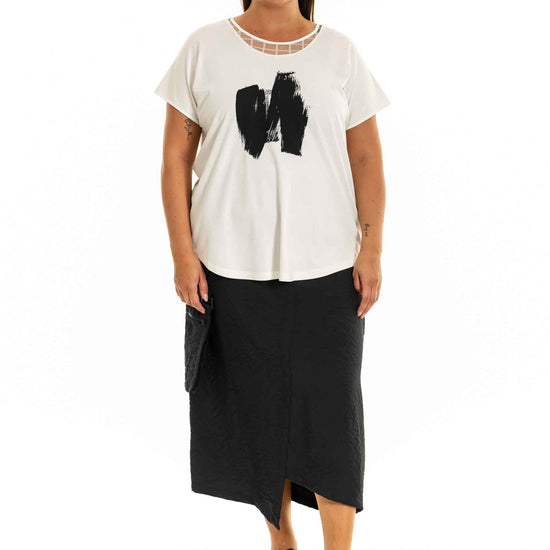 Denne klassiske og komfortable T-shirt fra Gozzip Woman er fremstillet i en blød og strækbar kvalitet bestående af 60 % viskose, 28 % nylon og 12 % elastan, hvilket sikrer en behagelig pasform og bevægelsesfrihed hele dagen. Med sit unikke og iøjnefaldende print af kontrasterende penselstrøg på brystet, tilføjer denne T-shirt et flot touch til ethvert outfit.