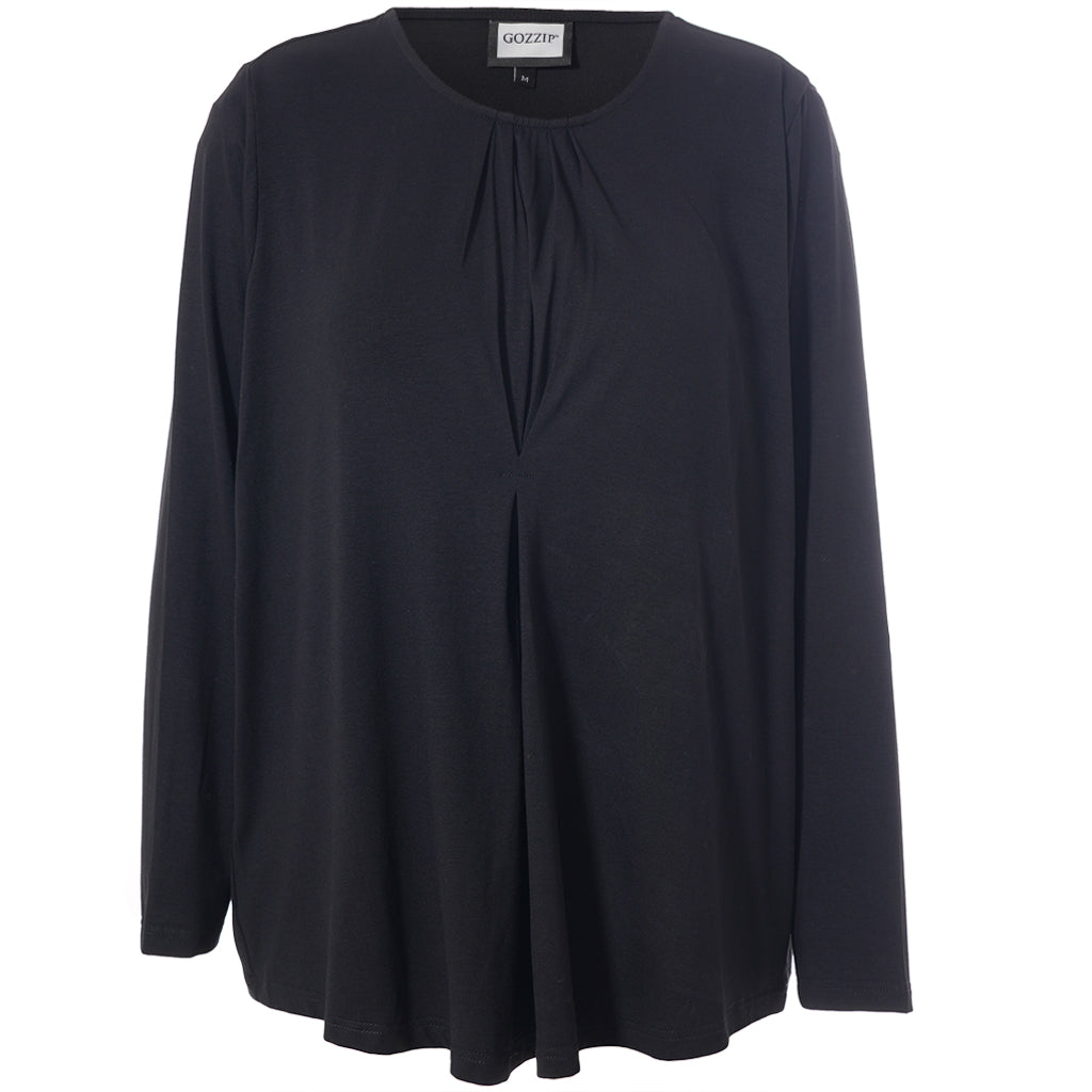 Denne skønne bluse fra Gozzip er det perfekte valg til kvinden, der ønsker både komfort og stil i hverdagen. Den er fremstillet i en blød og strækbar viskose jersey, der falder smukt omkring kroppen og sikrer optimal bevægelsesfrihed. Modellens enkle udtryk brydes af et fint læg foran, som giver en flatterende pasform og ekstra vidde over maven: