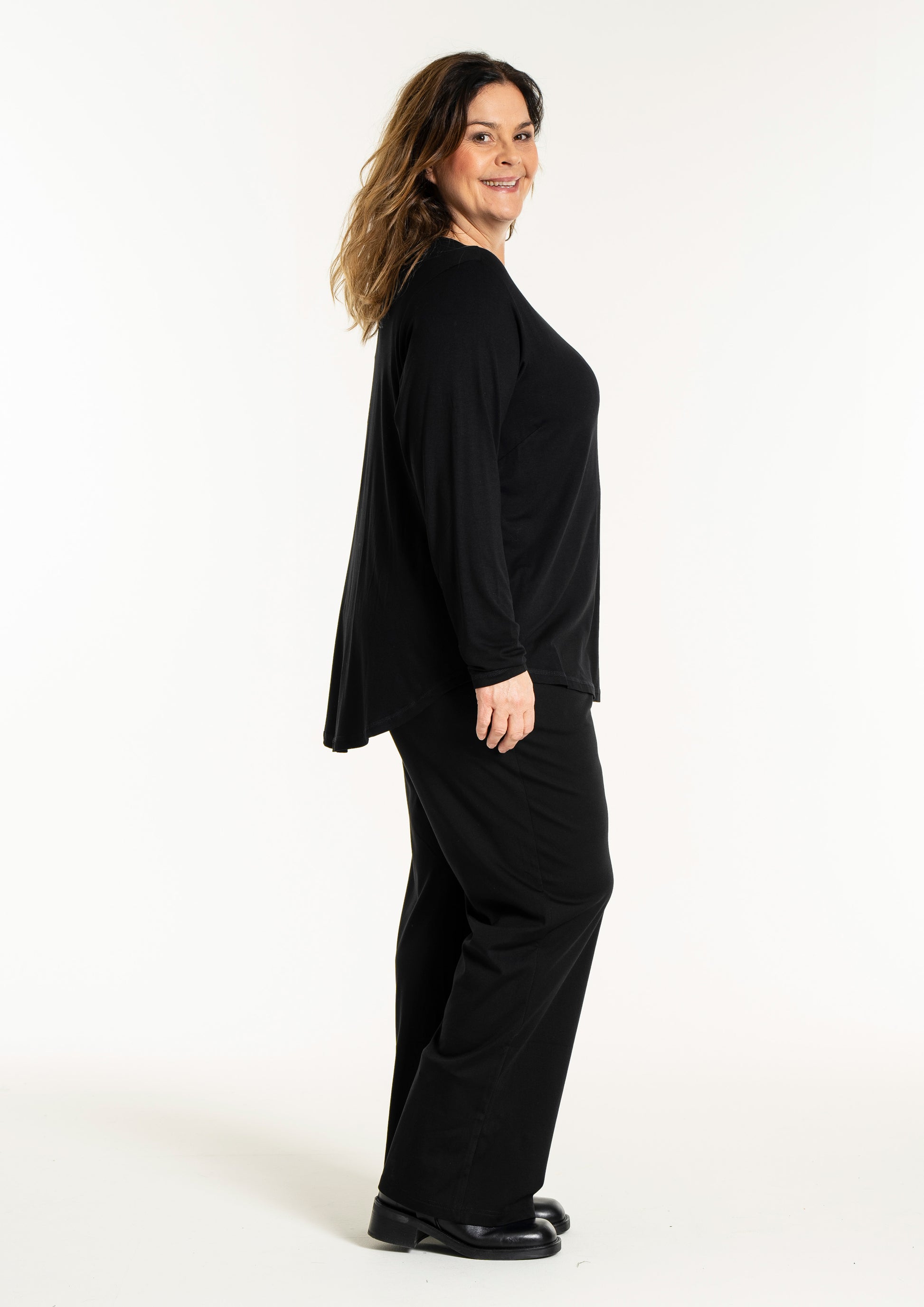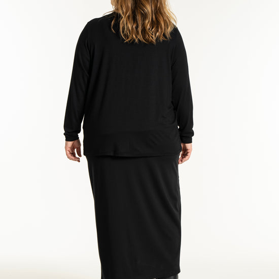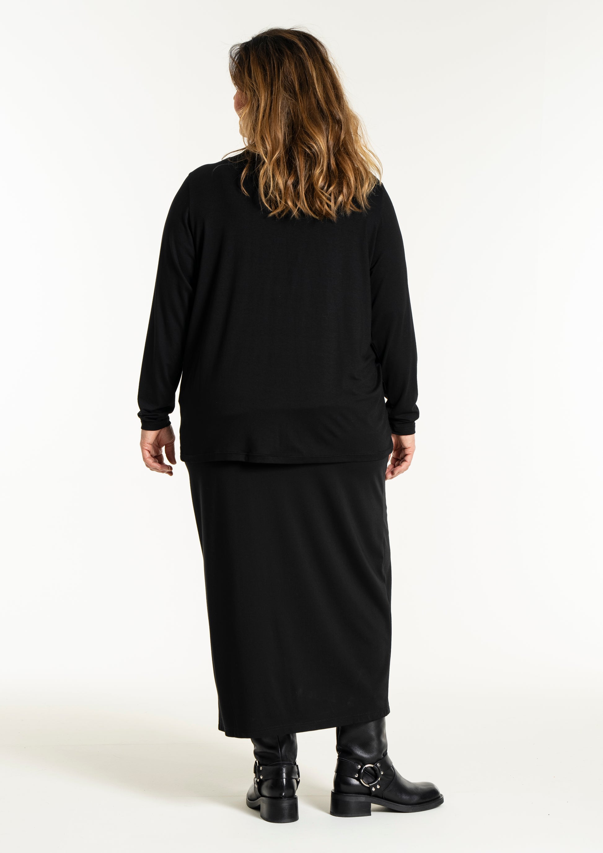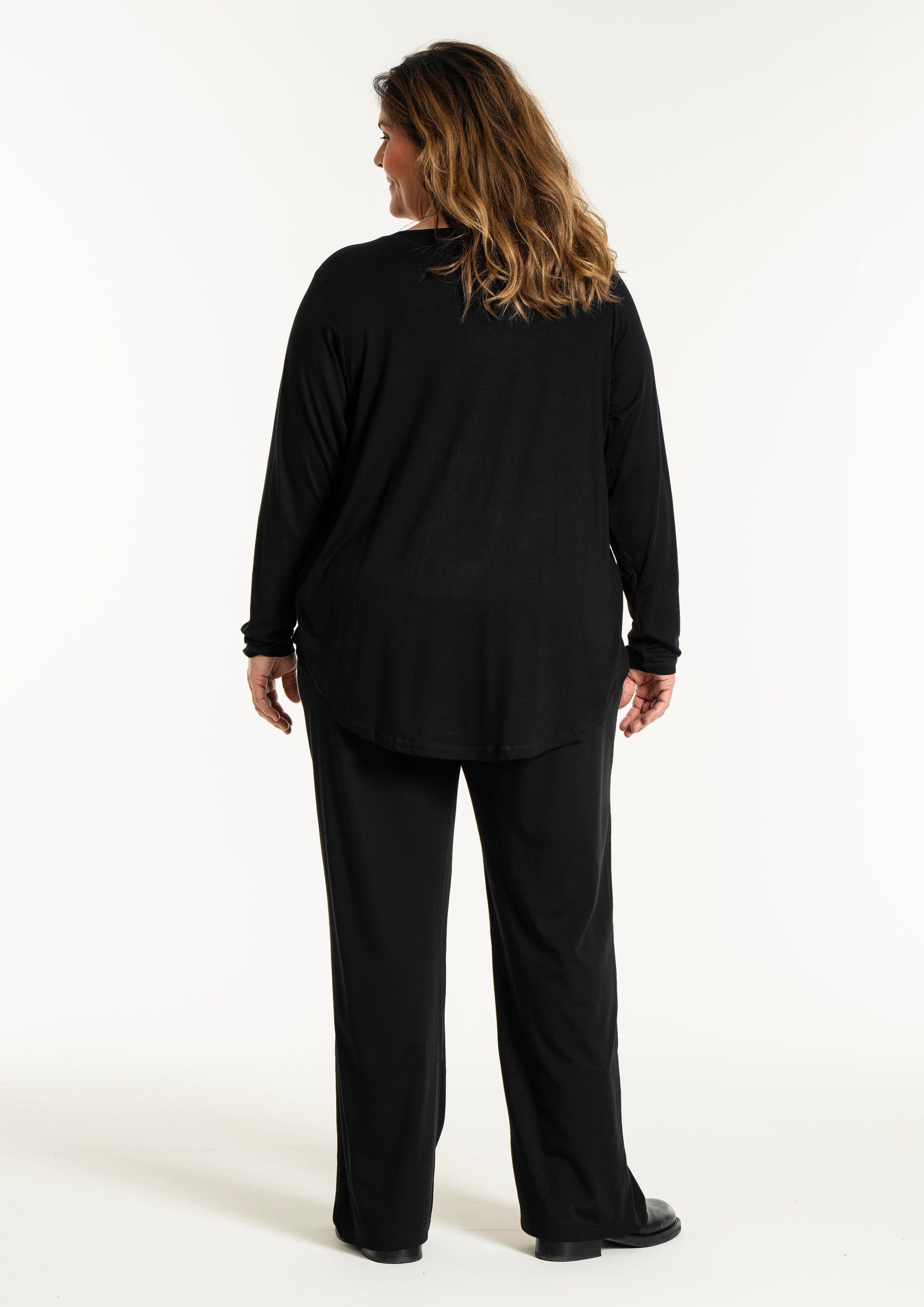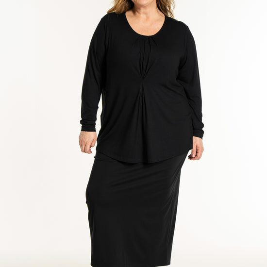 Det tidløse snit gør denne overdel nem at style med resten af din garderobe, uanset om du er til bukser eller nederdele. På billedet ses blusen stylet med en lang underdel, hvilket skaber et sofistikeret og sammenhængende look, men den fungerer mindst lige så godt til et par jeans for et mere afslappet udtryk. Du kan finde inspiration blandt vores mange plus size bluser for at se, hvordan en god basisvare kan løfte dit outfit. De lange ærmer og den runde halsudskæring gør den ideel som både en selvstændig overdel eller under en smart vest på køligere dage.