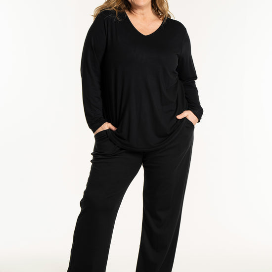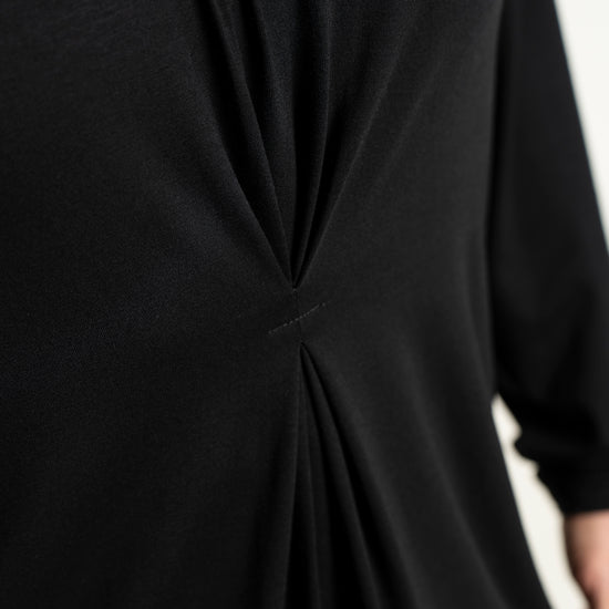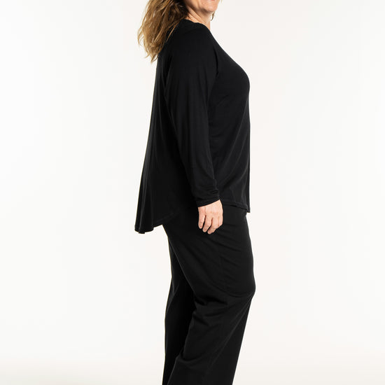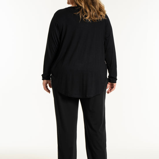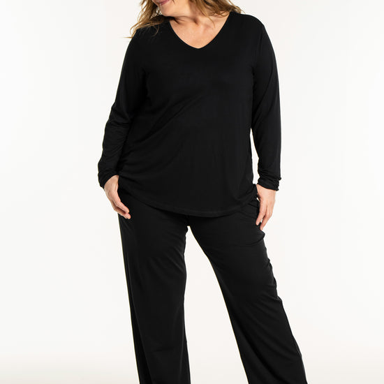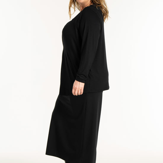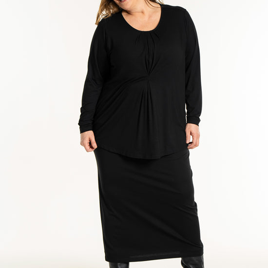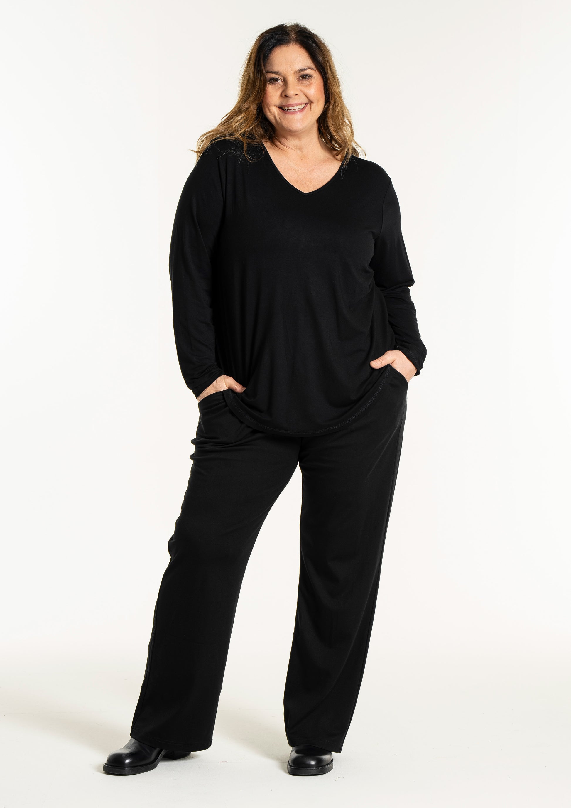 Det tidløse snit gør denne overdel nem at style med resten af din garderobe, uanset om du er til bukser eller nederdele. På billedet ses blusen stylet med en lang underdel, hvilket skaber et sofistikeret og sammenhængende look, men den fungerer mindst lige så godt til et par jeans for et mere afslappet udtryk. Du kan finde inspiration blandt vores mange plus size bluser for at se, hvordan en god basisvare kan løfte dit outfit. De lange ærmer og den runde halsudskæring gør den ideel som både en selvstændig overdel eller under en smart vest på køligere dage.