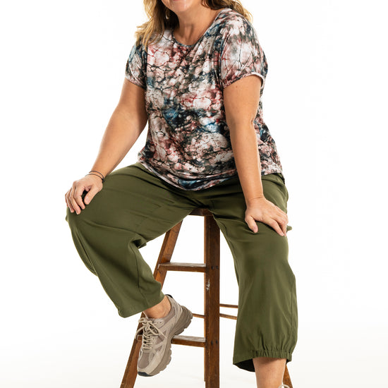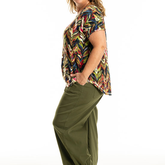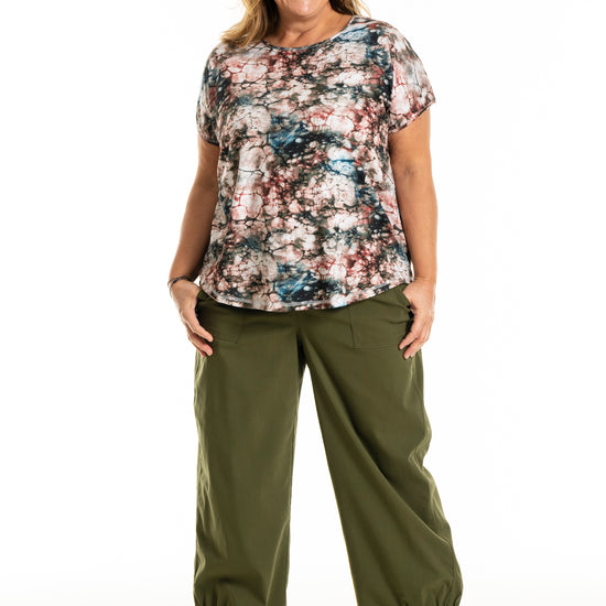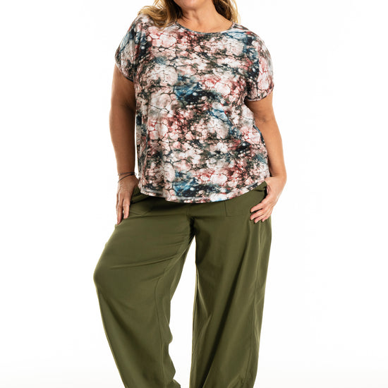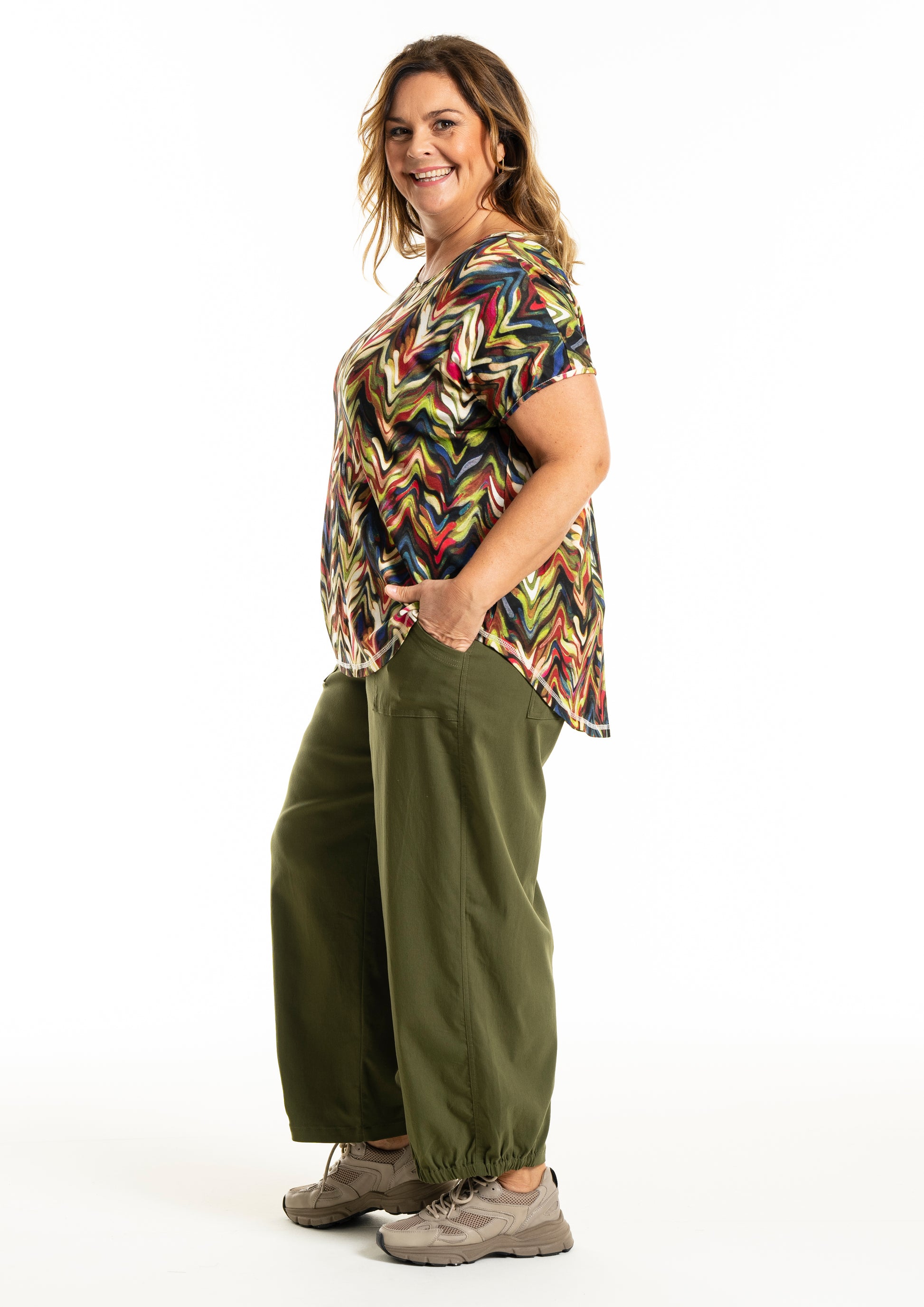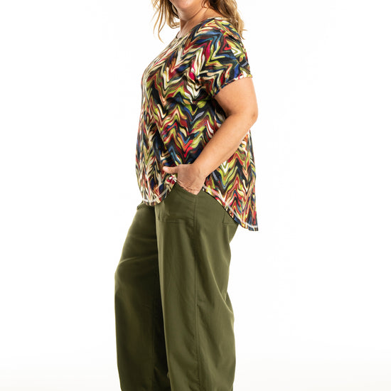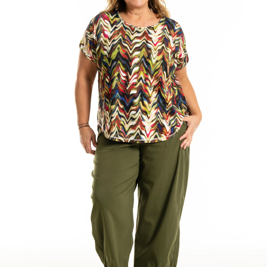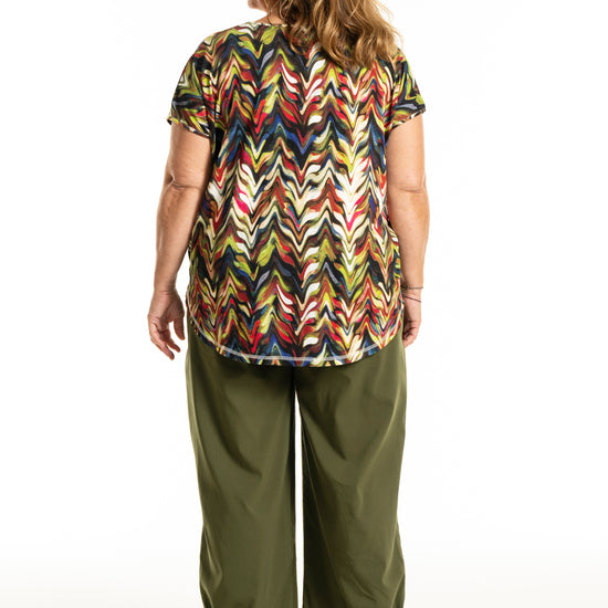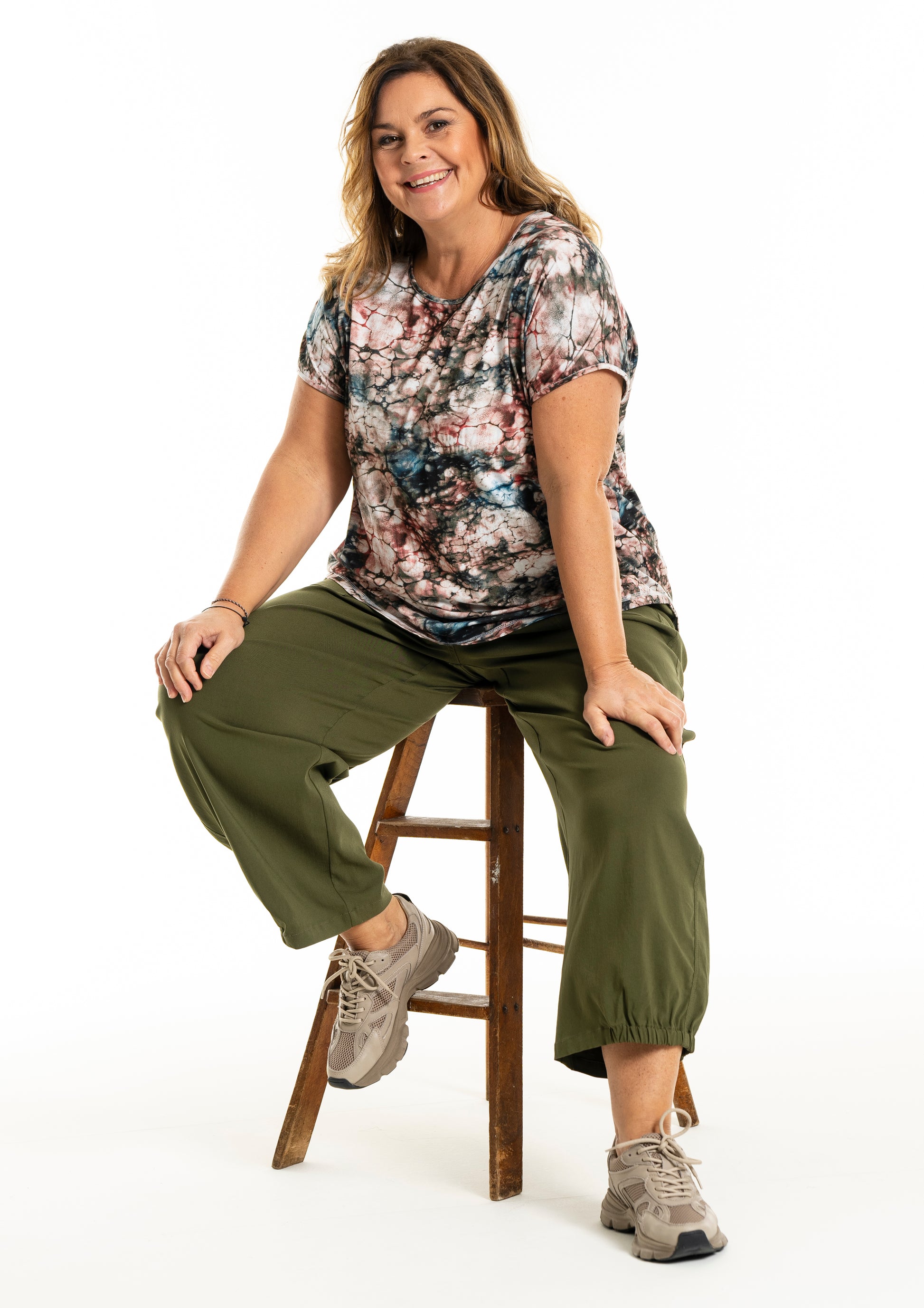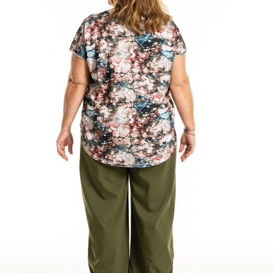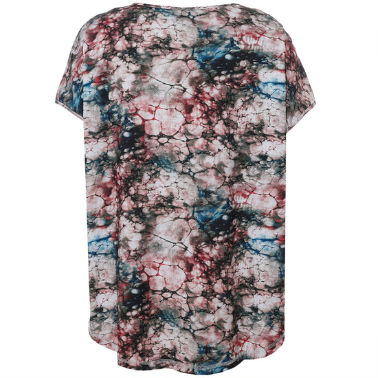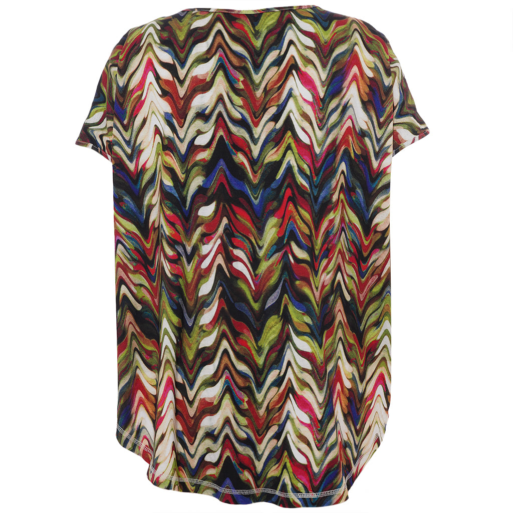 Oplev en T-shirt, der kombinerer stil og komfort perfekt. Det farverige print gør denne T-shirt til et iøjnefaldende valg, der kan pifte ethvert outfit op. Ideel til både hverdag og afslappede lejligheder.