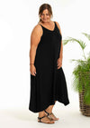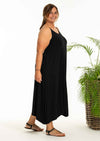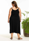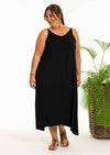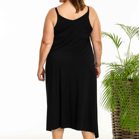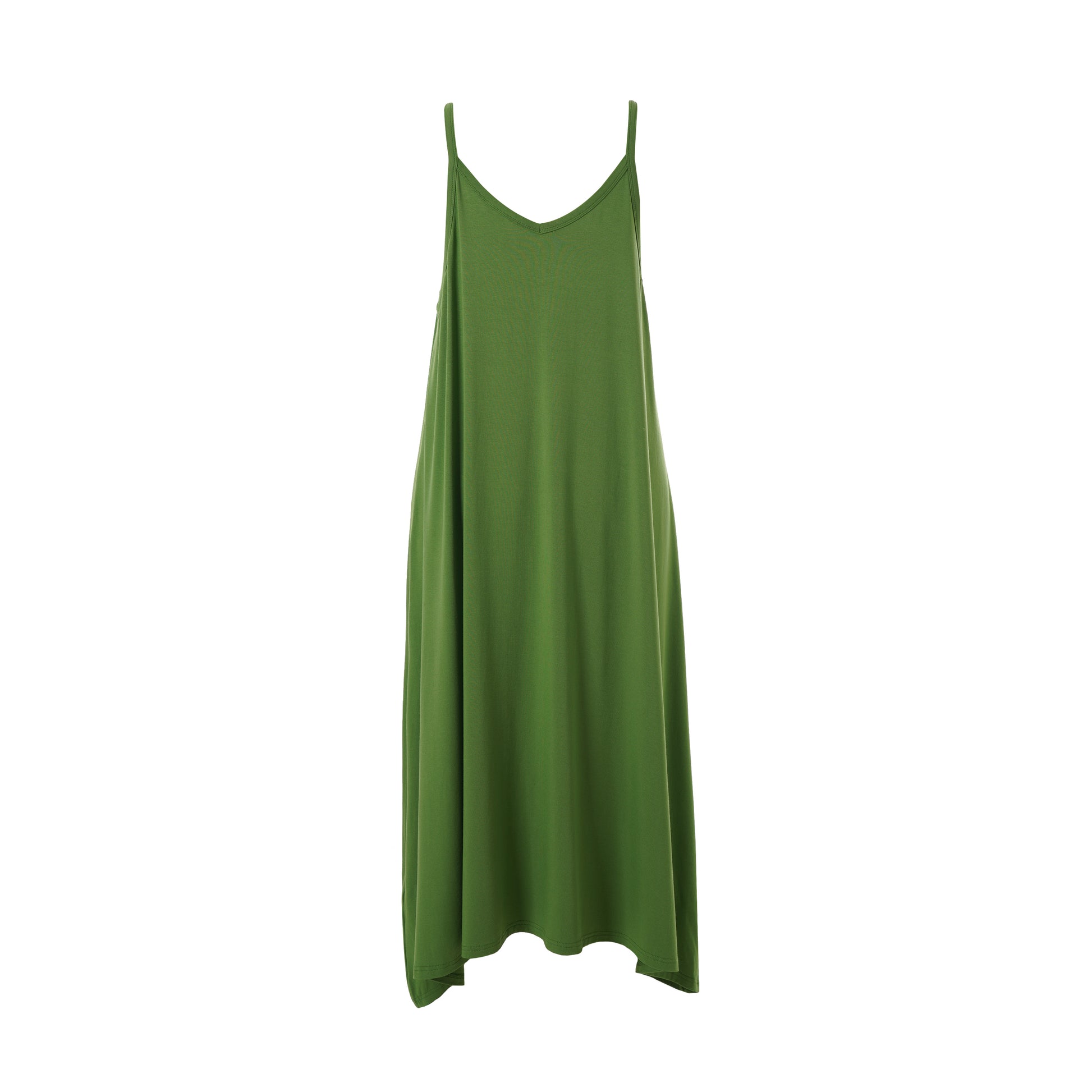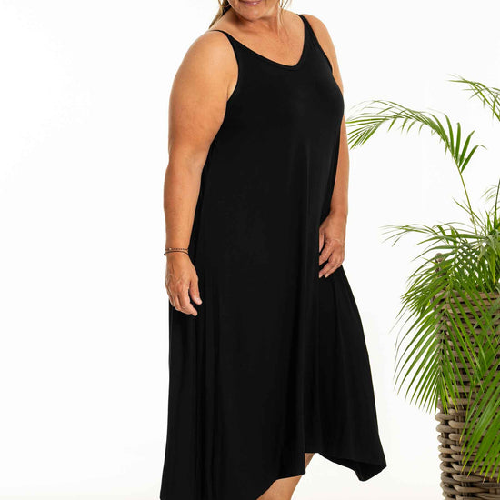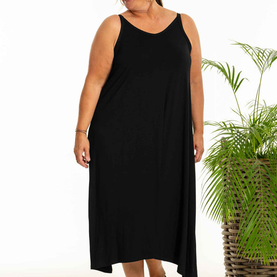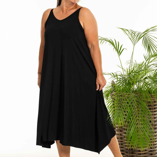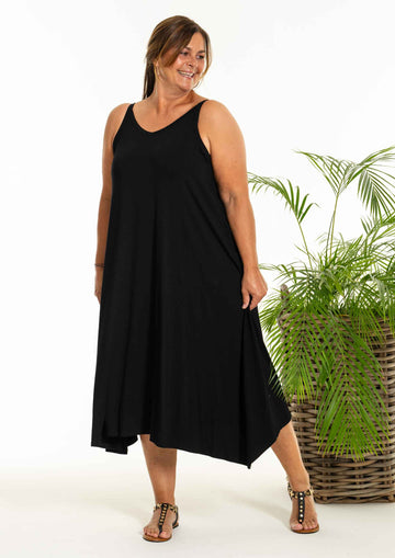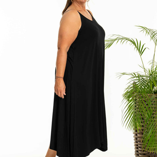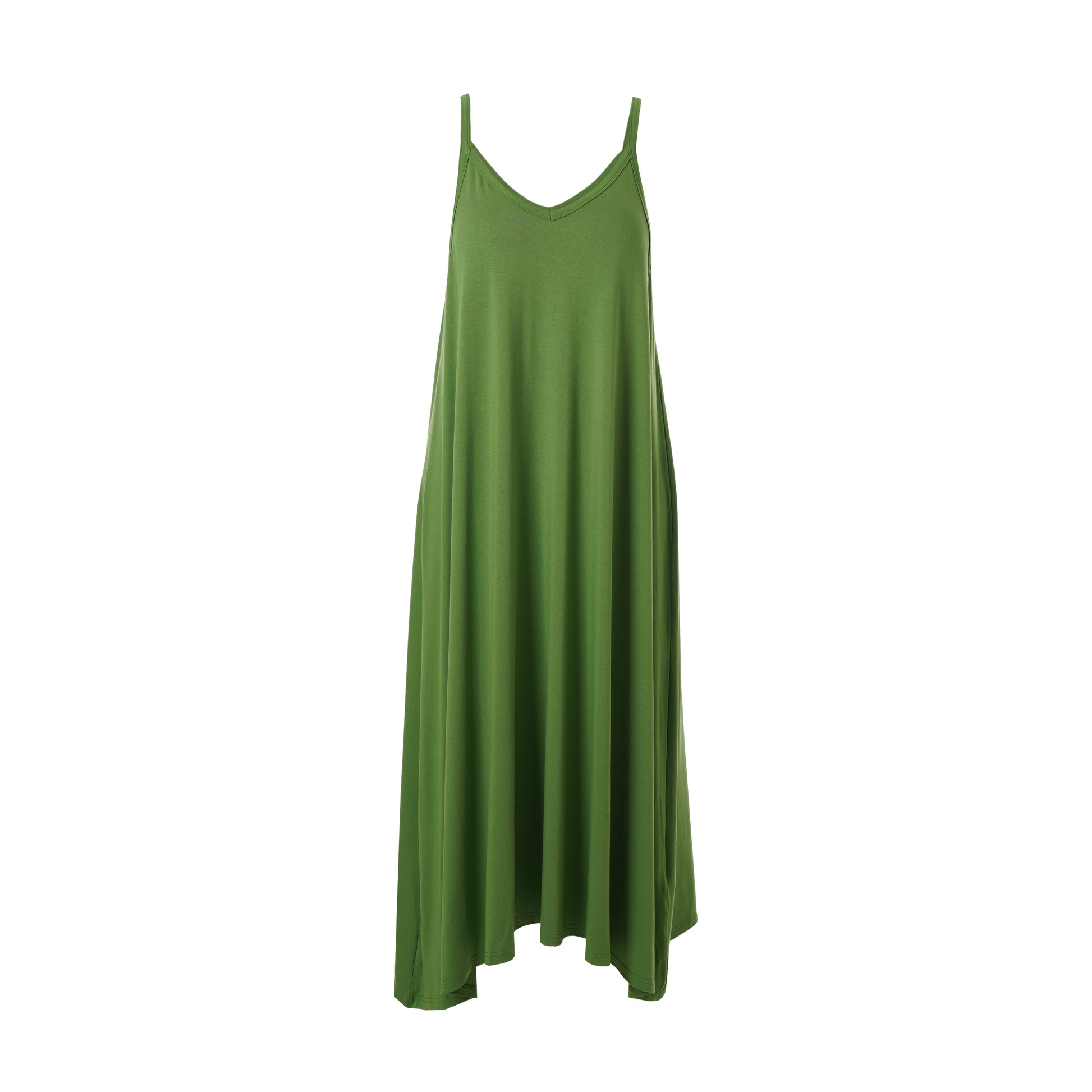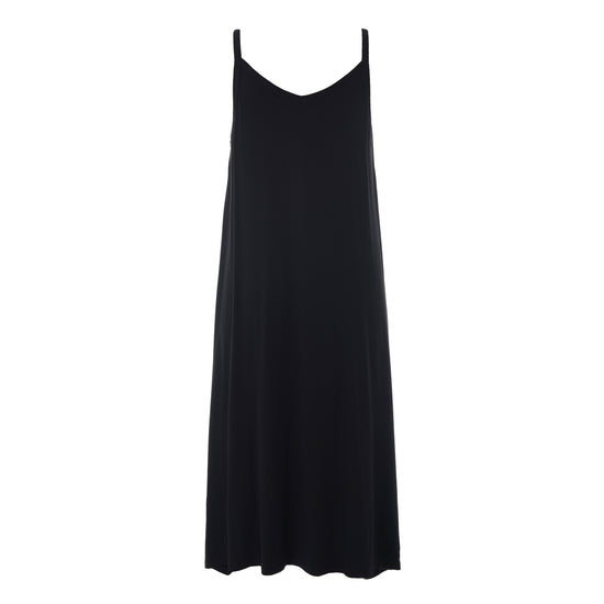 Gozzip Woman præsenterer en smuk og ensfarvet kjole, der kombinerer enkelthed med elegance. Denne kjole er fremstillet af en blød og strækbar blanding af 95% viskose og 5% elastan, hvilket sikrer en behagelig pasform og en flatterende silhuet. Med dens tynde stropper og V-udskæring både foran og bagtil, tilbyder kjolen et strejf af elegance til din stil. A-linjeformen og den afrundede kant, der er let forlænget i siderne, gør den ideel til enhver kropstype.