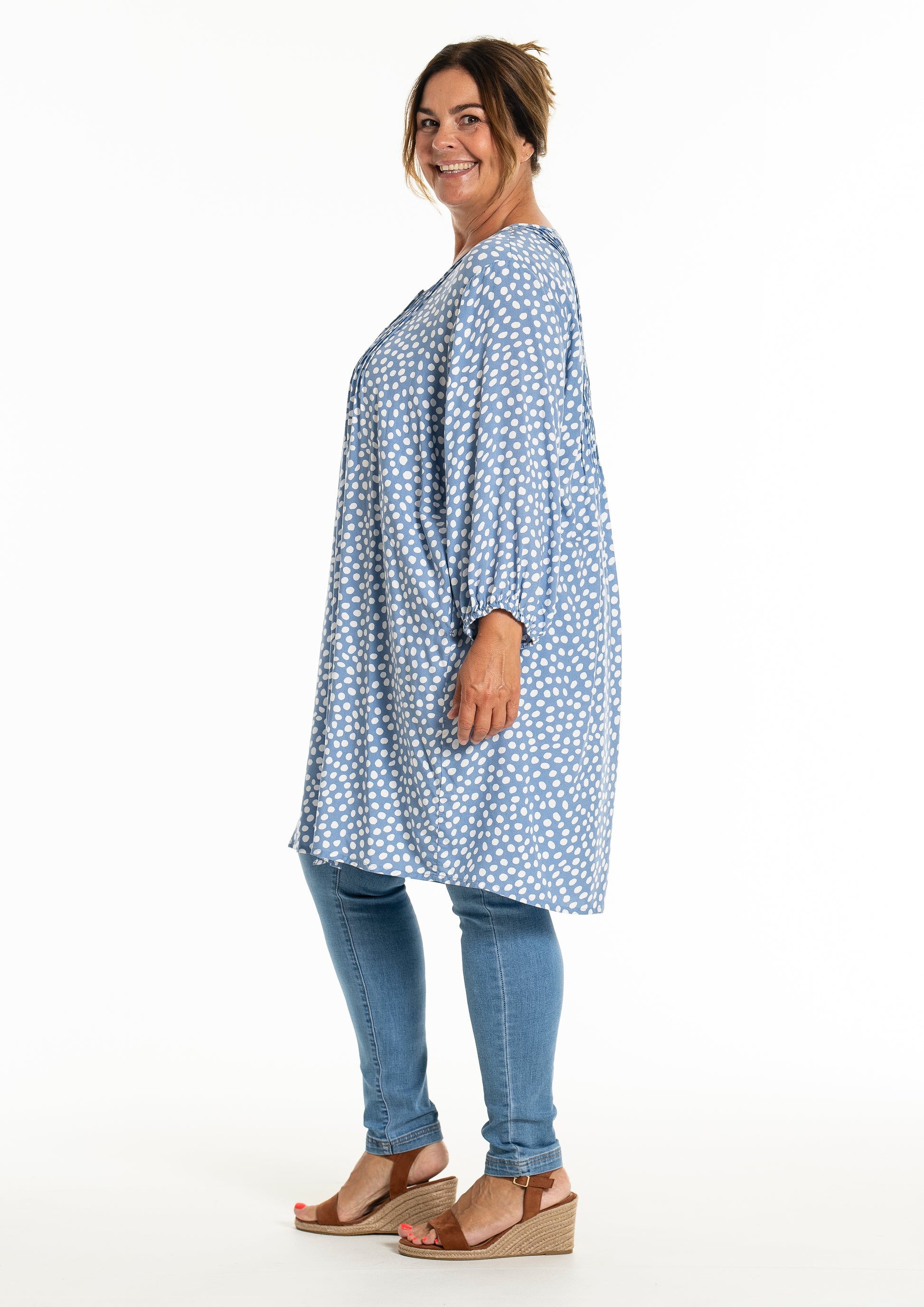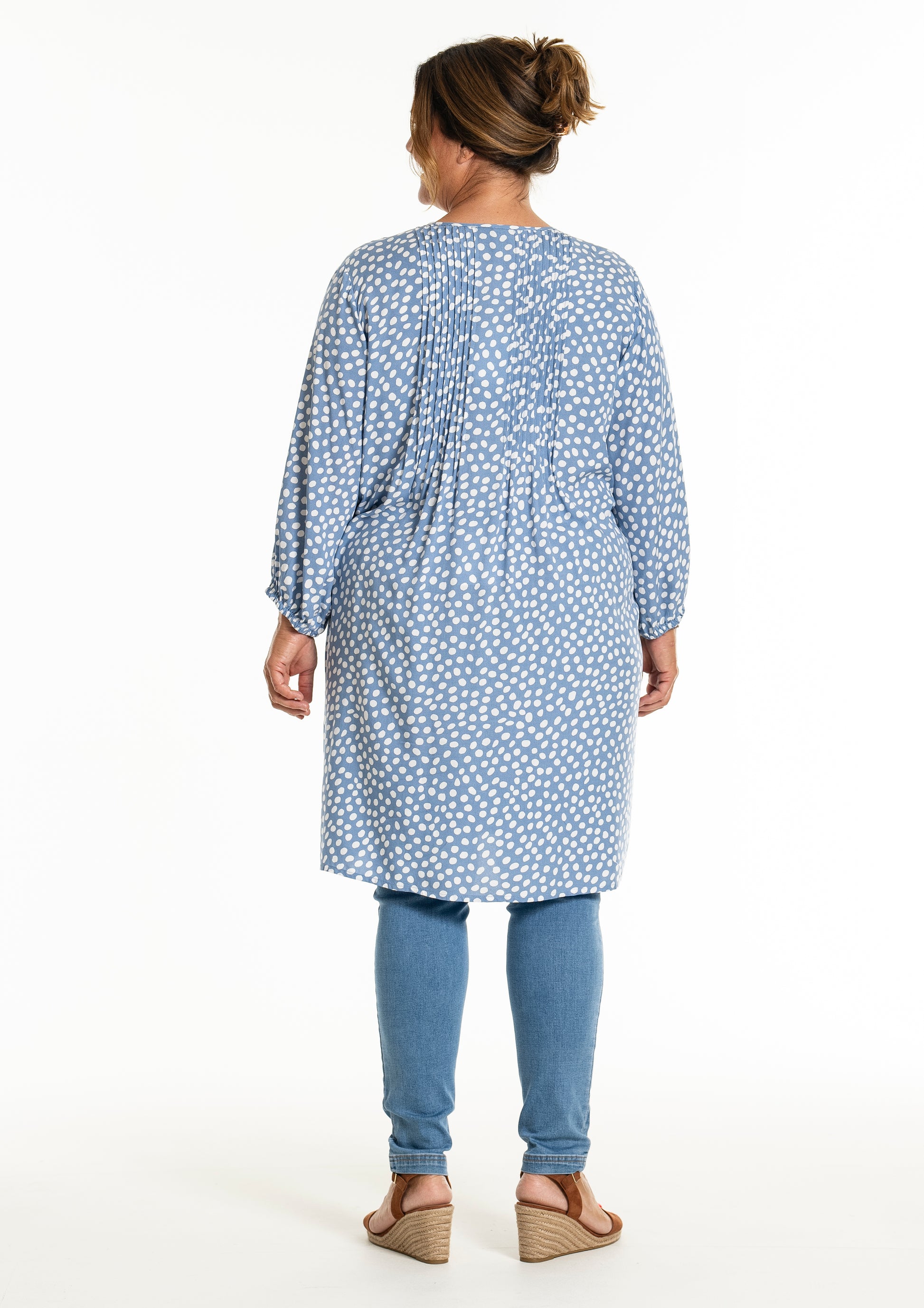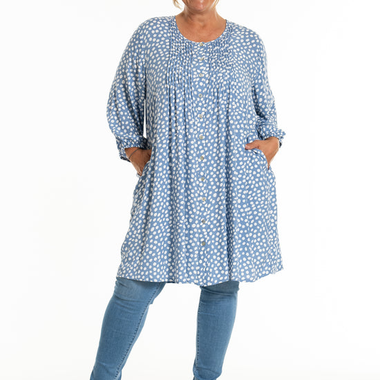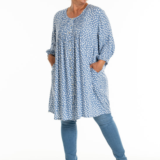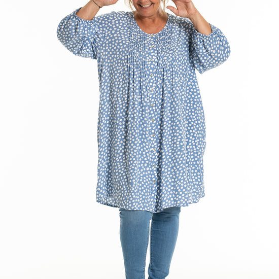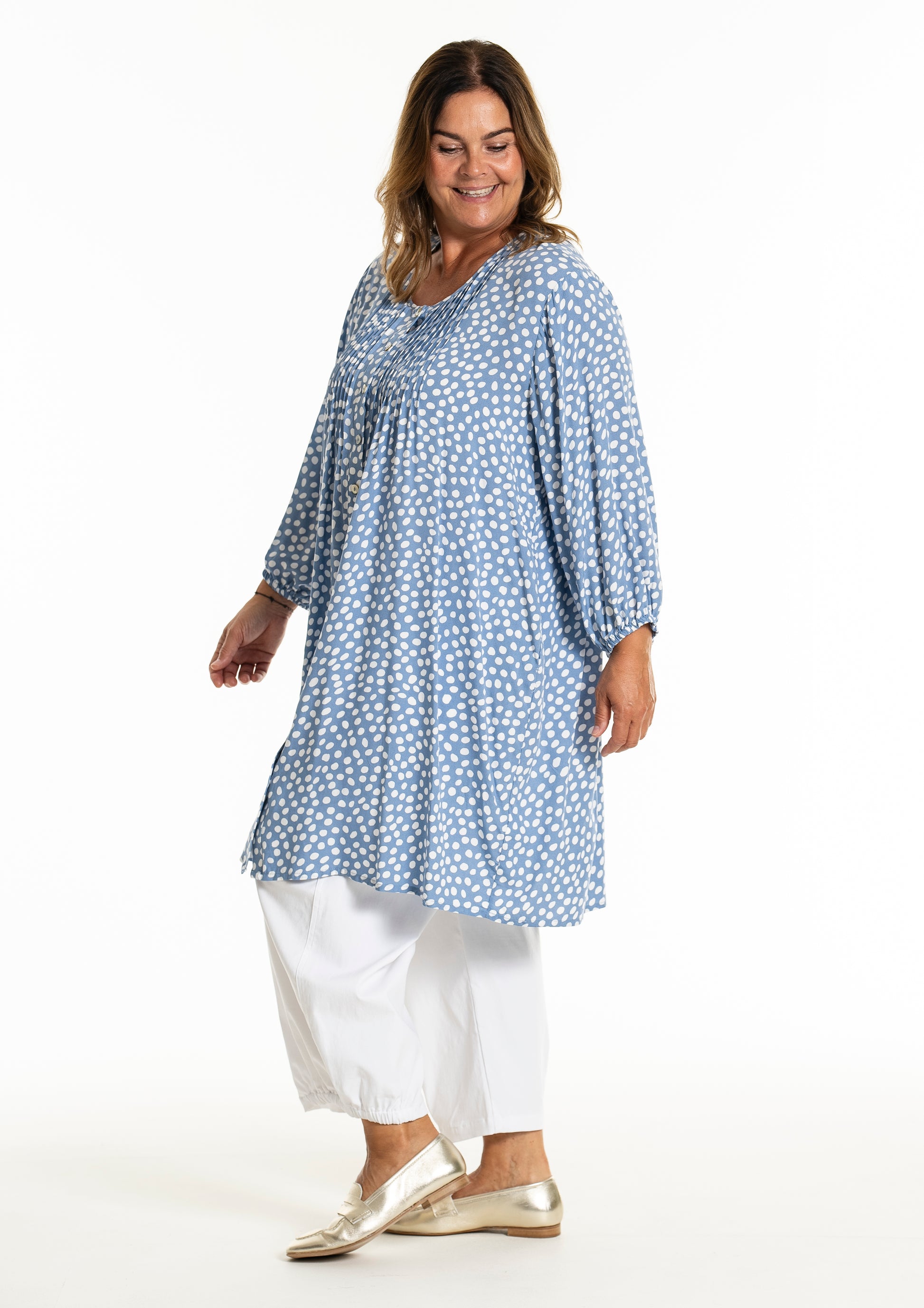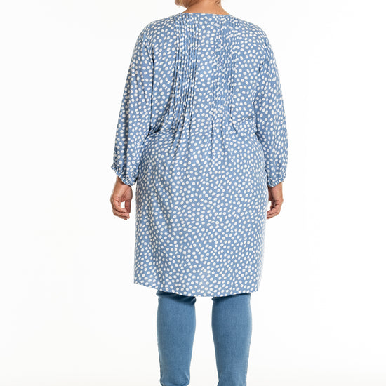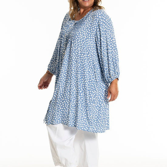 Oplev den stilfulde og komfortable tunika fra Gozzip Woman, der er designet til at give dig et moderne og elegant look. Denne tunika er fremstillet af 100% viskose, som sikrer en let og åndbar kvalitet, perfekt til både hverdag og festlige lejligheder. Det klassiske prikkede print tilføjer et tidløst touch, mens de fine læg på brystet og ryggen giver et smukt fald.