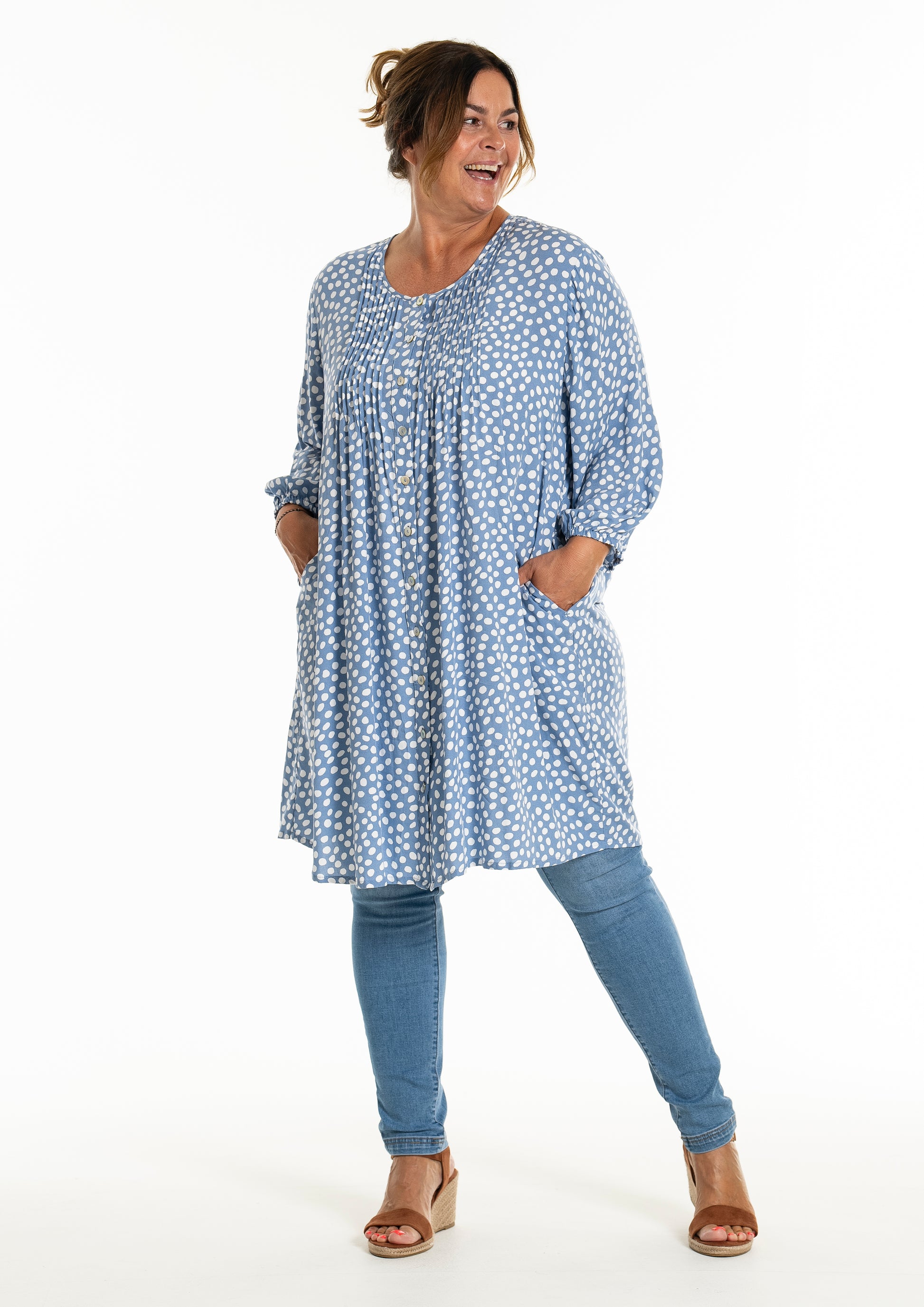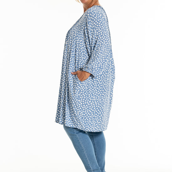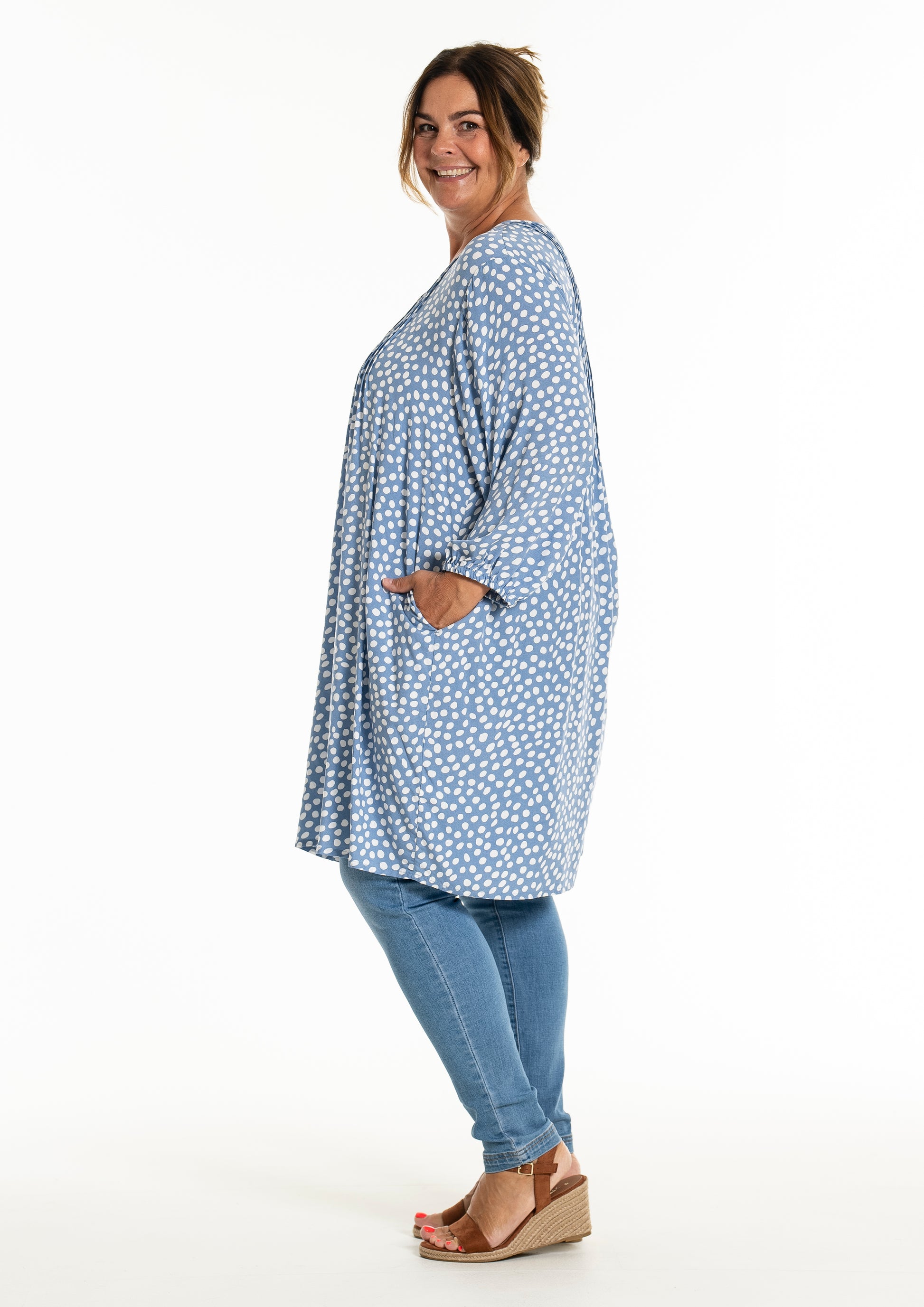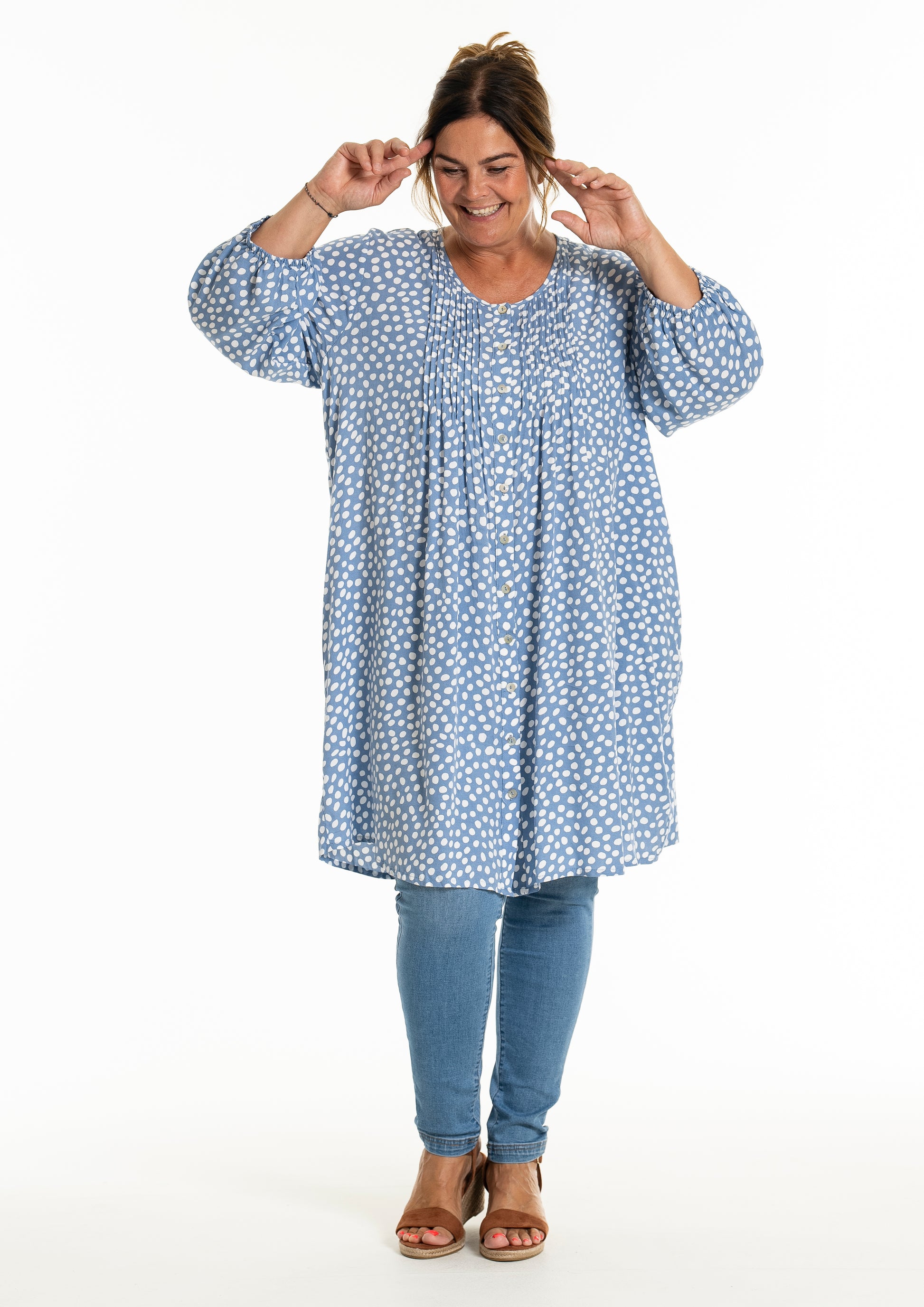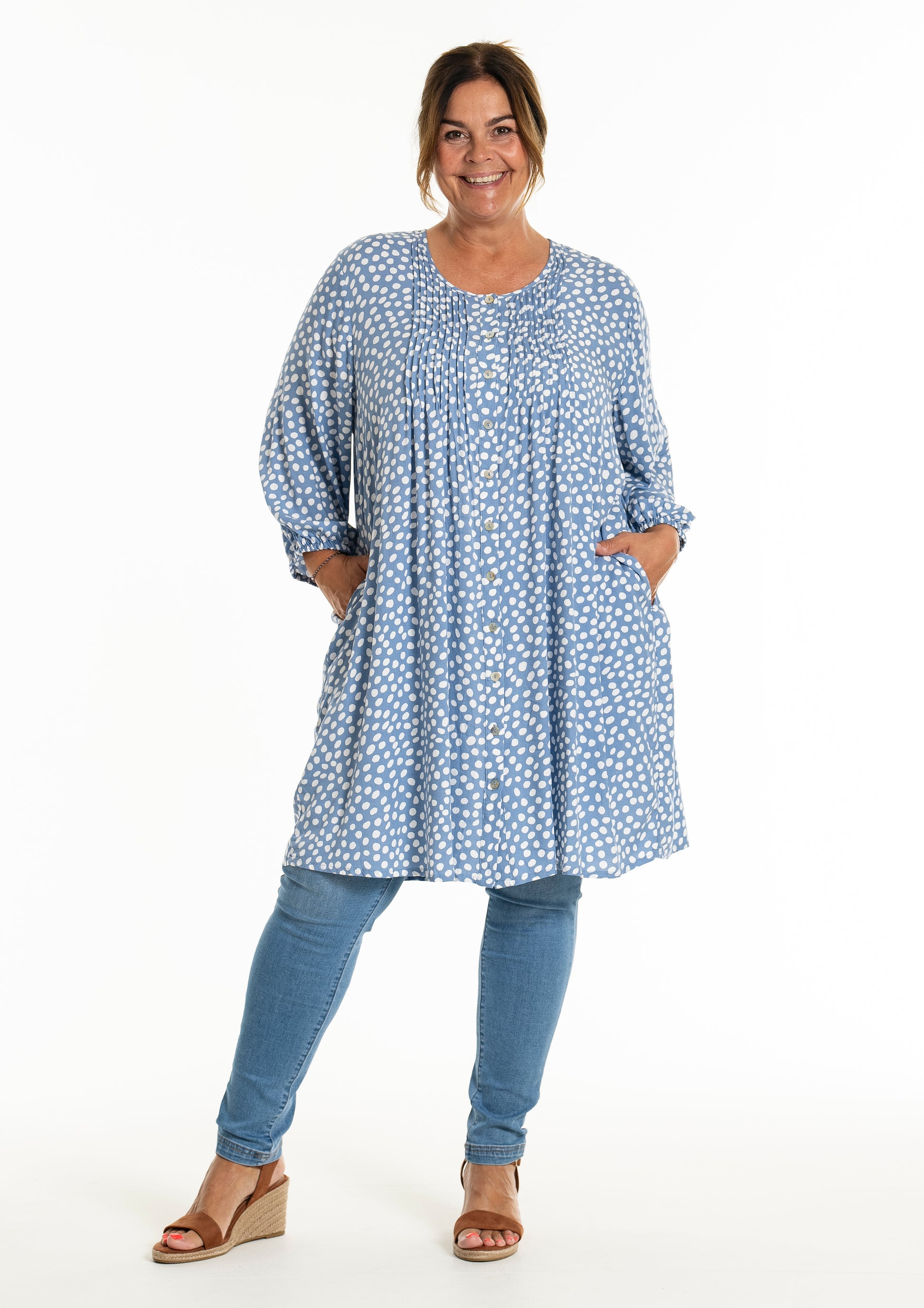 Oplev den stilfulde og komfortable tunika fra Gozzip Woman, der er designet til at give dig et moderne og elegant look. Denne tunika er fremstillet af 100% viskose, som sikrer en let og åndbar kvalitet, perfekt til både hverdag og festlige lejligheder. Det klassiske prikkede print tilføjer et tidløst touch, mens de fine læg på brystet og ryggen giver et smukt fald.