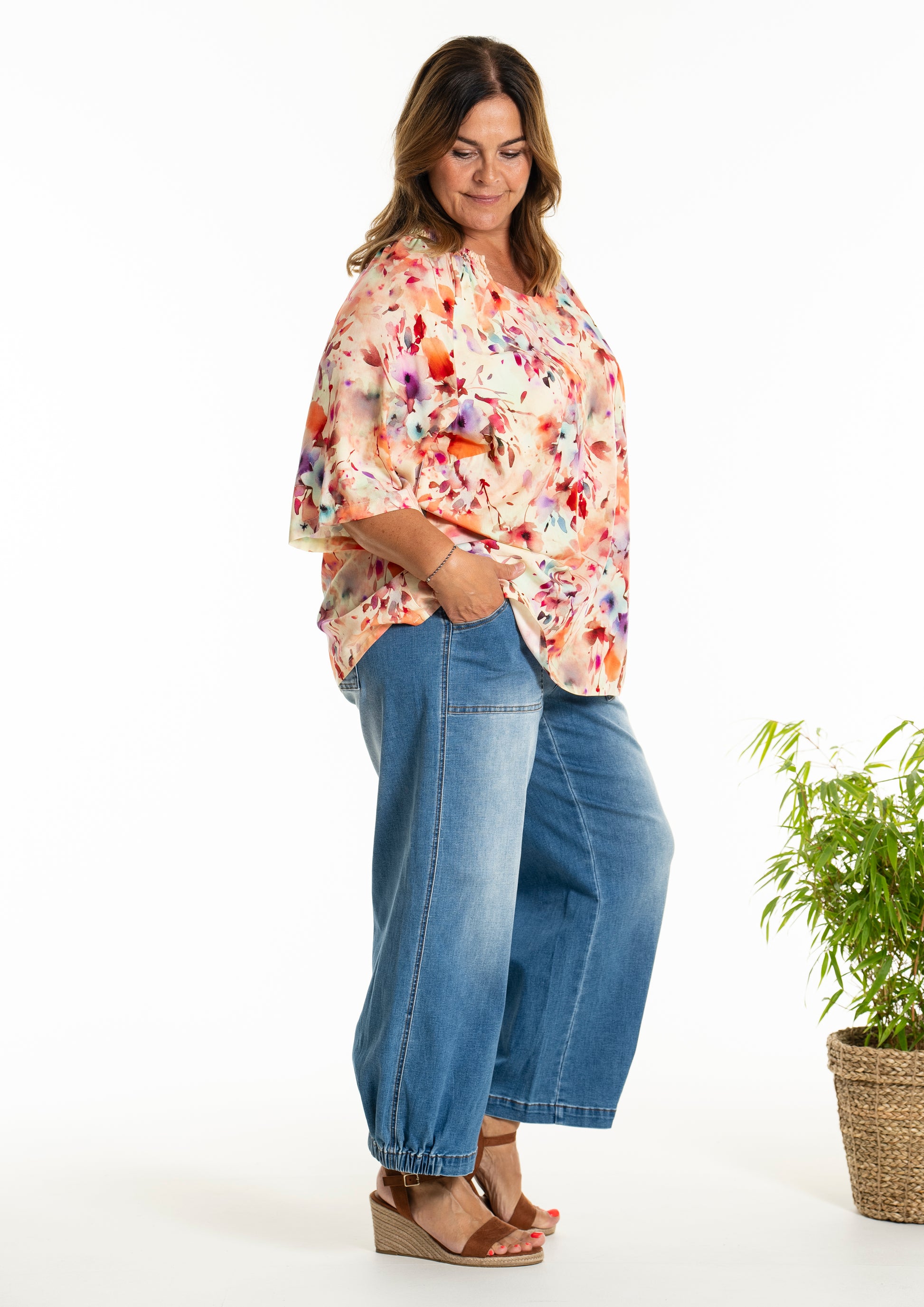 Blusens smockede krave og V-halsudskæring tilføjer et sofistikeret touch, mens de albuelange ærmer giver den et moderne udtryk. Perfekt til både hverdag og festlige lejligheder, kan denne bluse styles med et par plus size jeans eller en plus size nederdel for et komplet look.