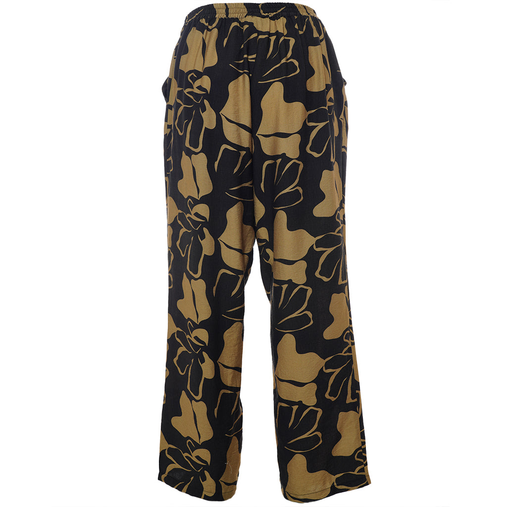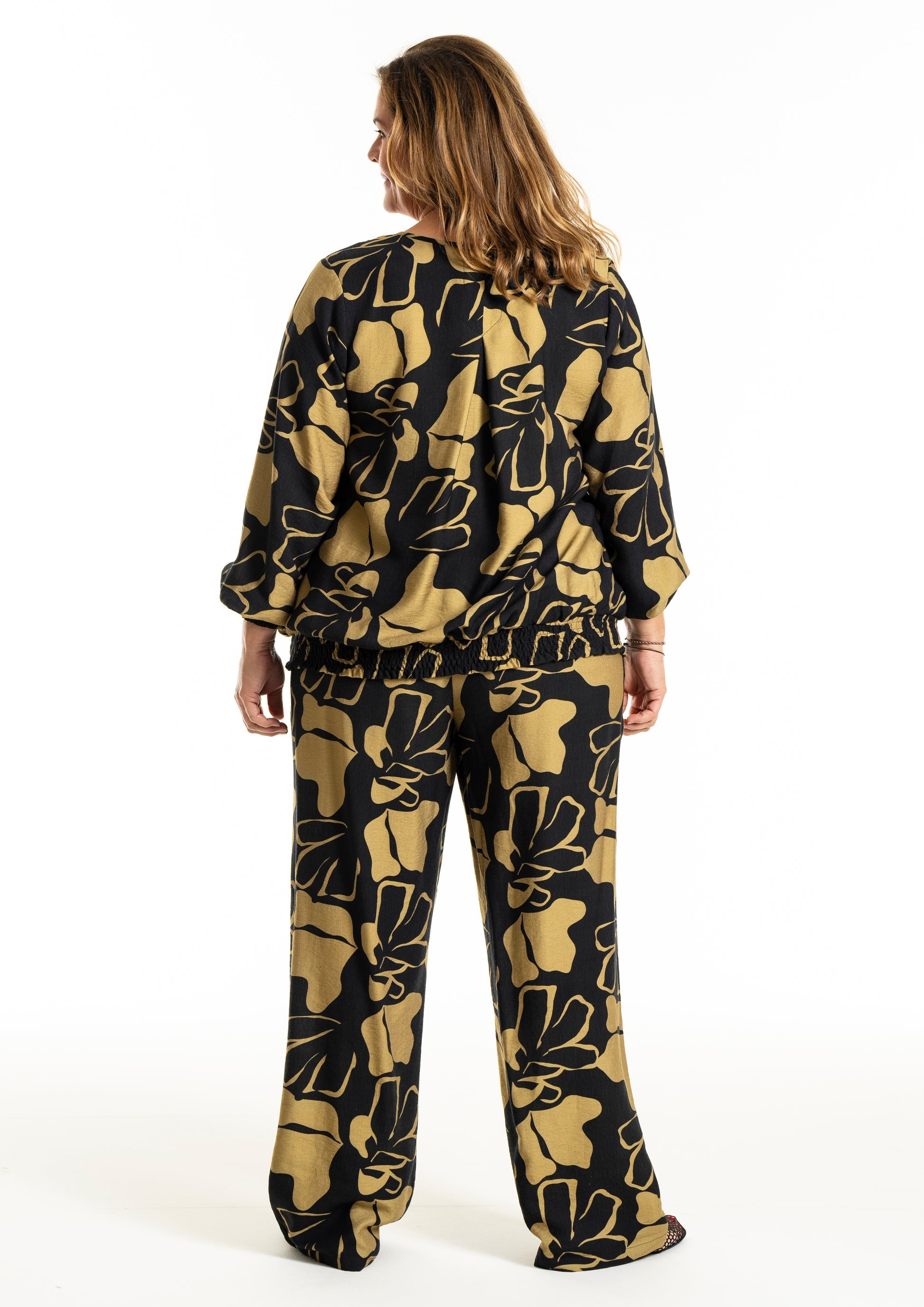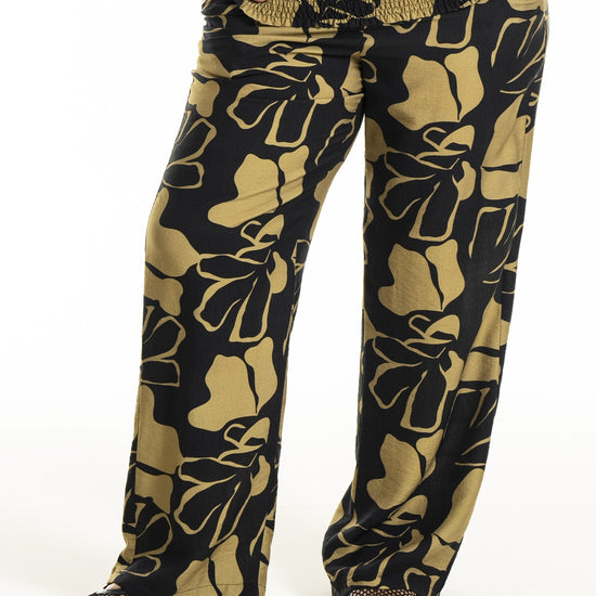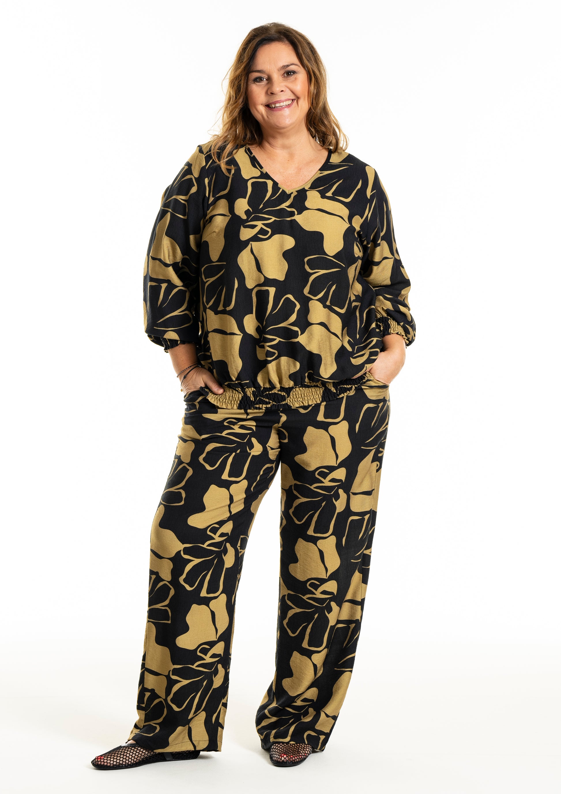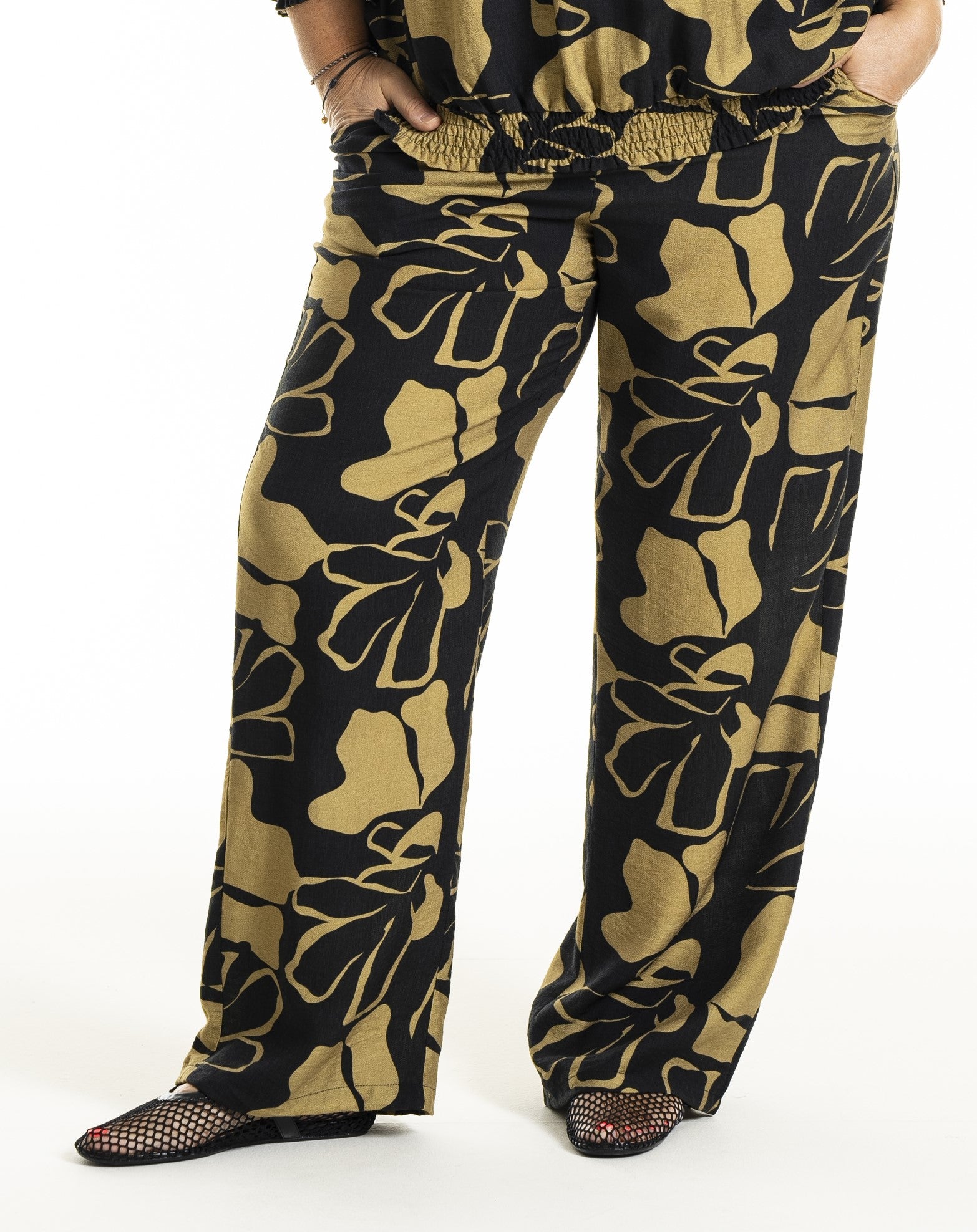 Med sit kunstneriske og iøjnefaldende print i gyldne nuancer på en sort baggrund, er disse bukser et stilsikkert valg til garderoben. De kommer fra Gozzip og byder på en fantastisk blød kvalitet med viskose, der falder tungt og flot om benene. Modellen er designet med stor opmærksomhed på både udseende og komfort: