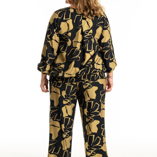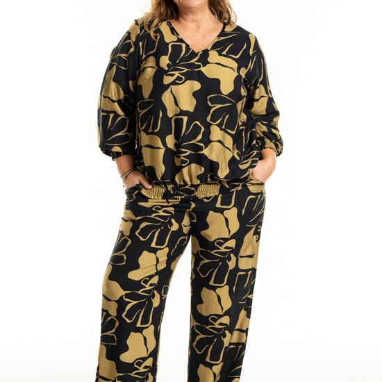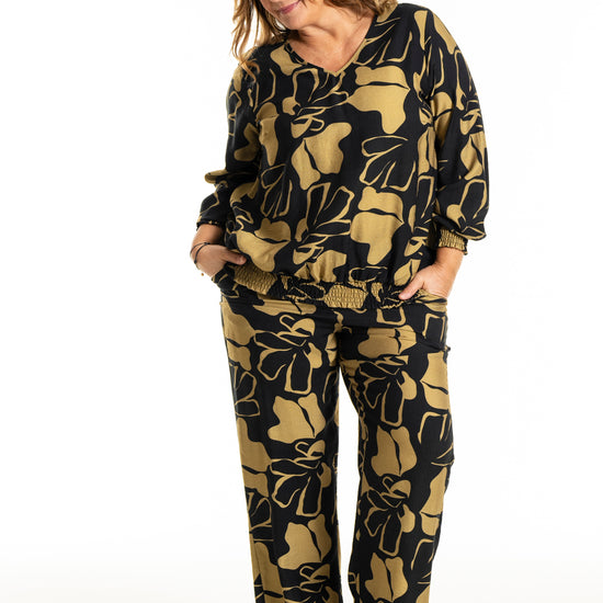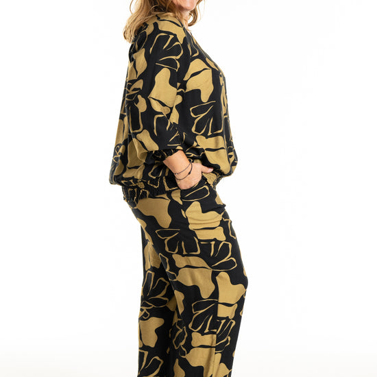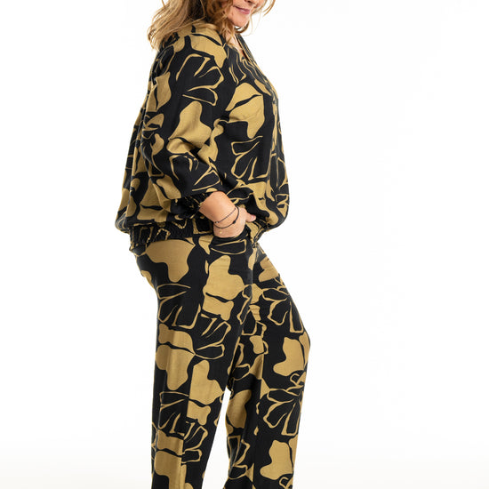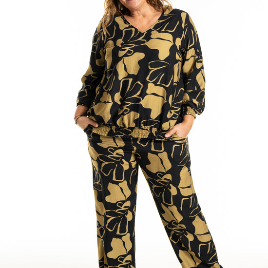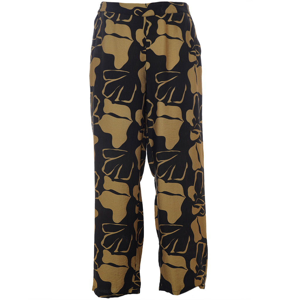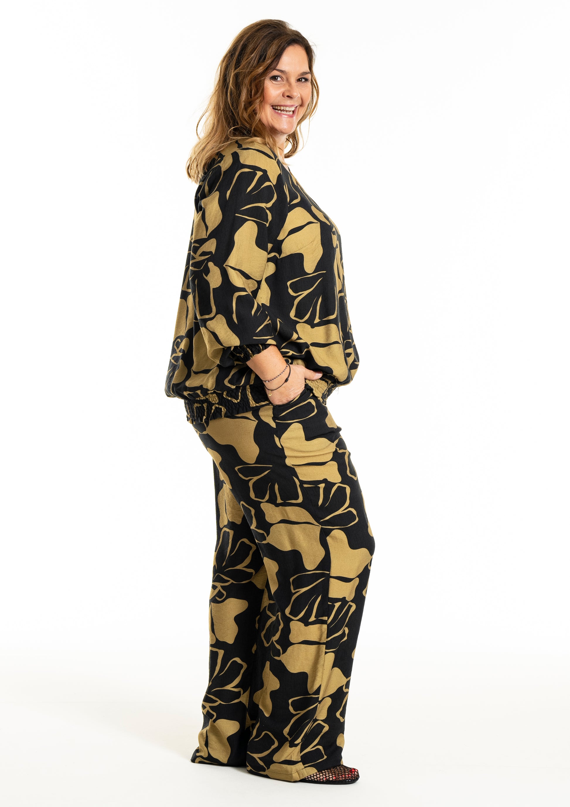 Med sit kunstneriske og iøjnefaldende print i gyldne nuancer på en sort baggrund, er disse bukser et stilsikkert valg til garderoben. De kommer fra Gozzip og byder på en fantastisk blød kvalitet med viskose, der falder tungt og flot om benene. Modellen er designet med stor opmærksomhed på både udseende og komfort: