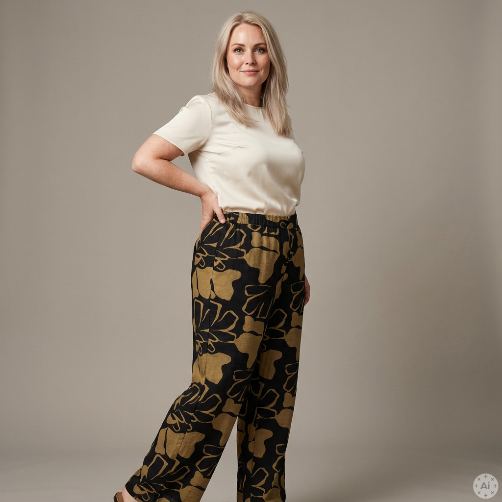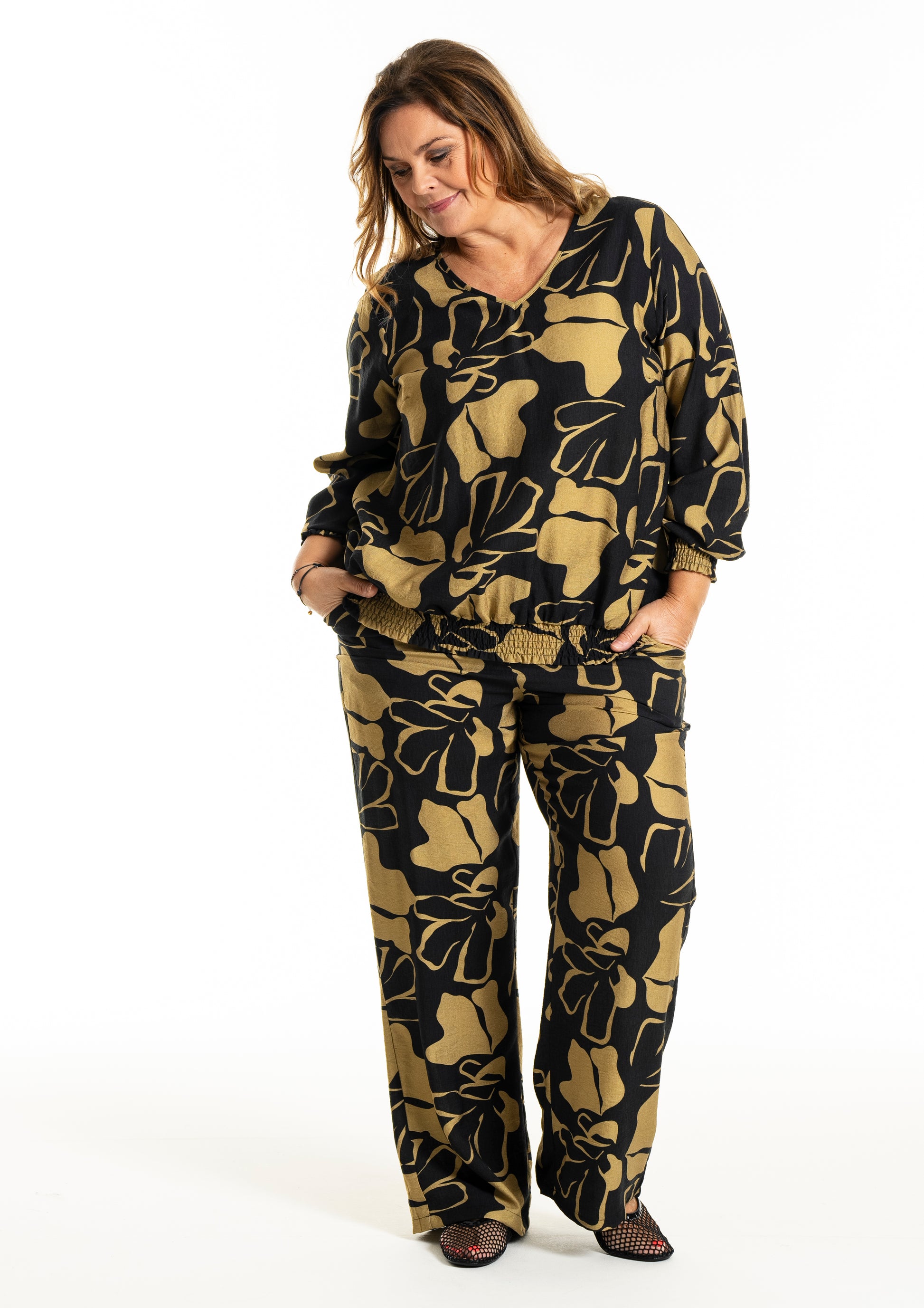 Den løse pasform skaber et elegant og afslappet udtryk, der nemt kan bruges til både hverdag og festlige lejligheder. Den smarte elastik bagpå giver god fleksibilitet og en behagelig pasform, mens den faste linning foran sikrer et struktureret look. Du kan nemt style disse bukser med en ensfarvet top for at lade det store, smukke bladprint være i fokus.