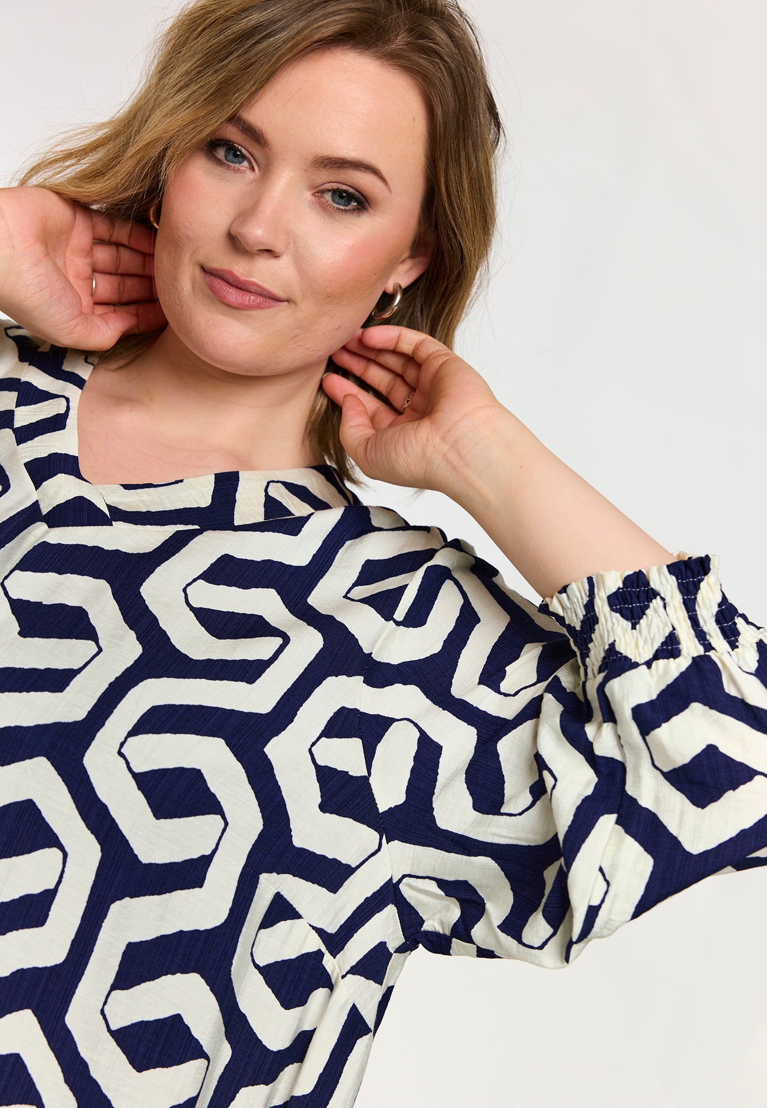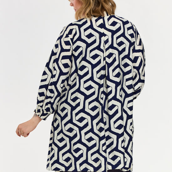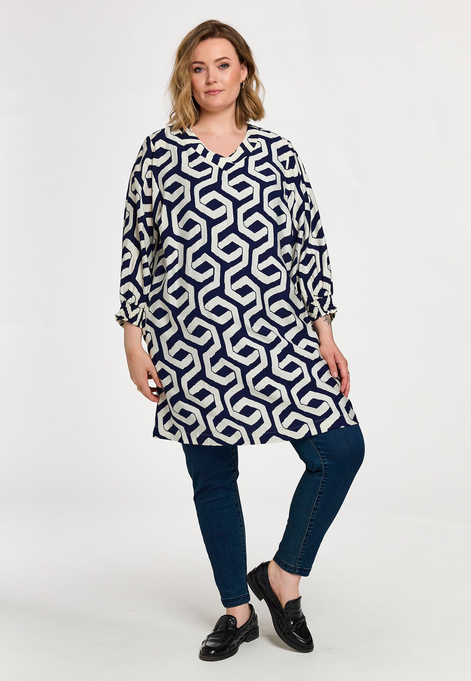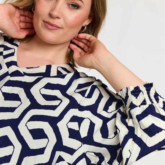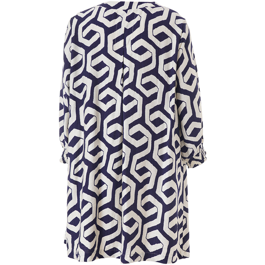 Denne elegante model fra Gozzip er udført i en let kvalitet med et moderne, grafisk mønster i blå og offwhite nuancer. Tunikaen byder på fine detaljer som praktiske sidelommer og 3/4-ærmer, der afsluttes med en feminin smock-kant for ekstra effekt.