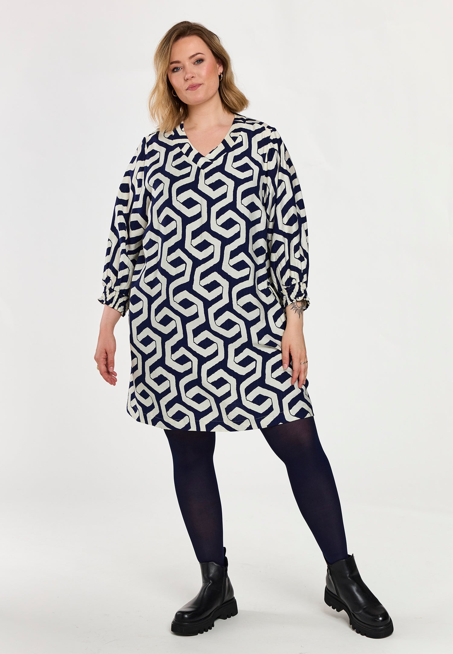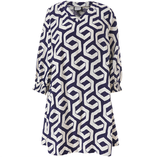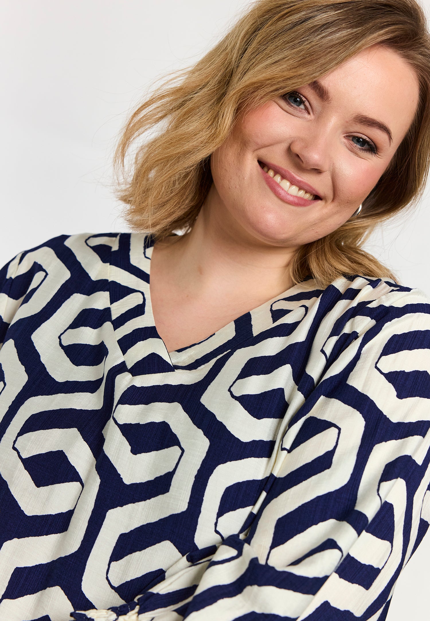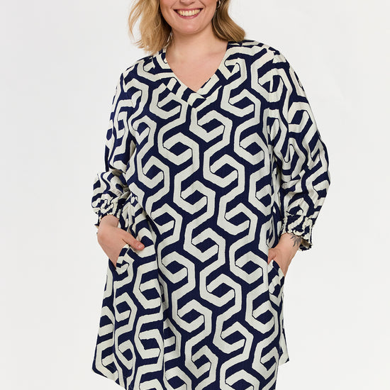 Denne elegante model fra Gozzip er udført i en let kvalitet med et moderne, grafisk mønster i blå og offwhite nuancer. Tunikaen byder på fine detaljer som praktiske sidelommer og 3/4-ærmer, der afsluttes med en feminin smock-kant for ekstra effekt.