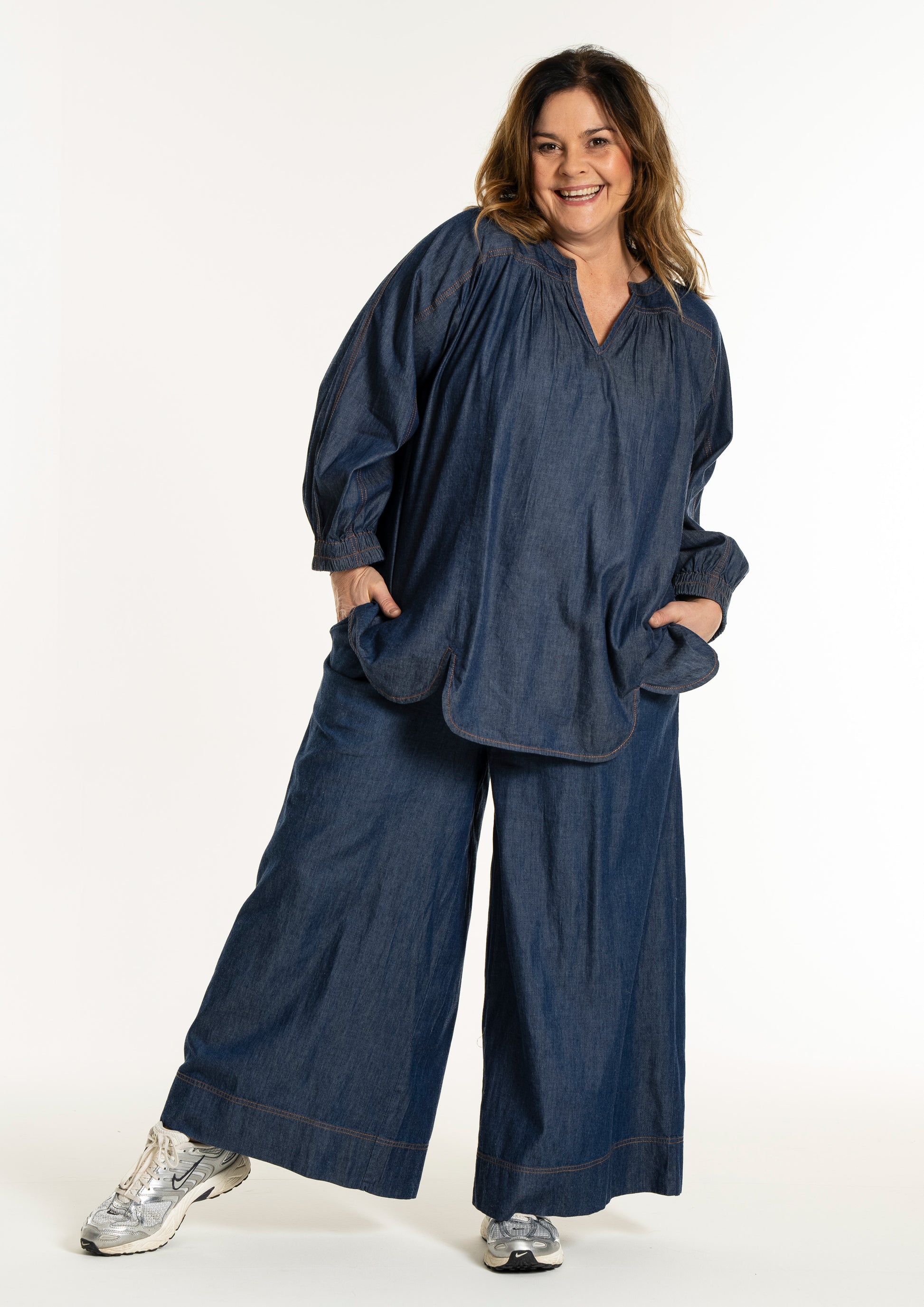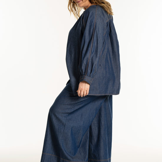 Blusen har en afslappet pasform, som gør den behagelig at have på hele dagen. Mål for str. M: halv brystvidde 64 cm og længde 74 cm. Fås i størrelser S-XL og i mørkeblå denim. En ideel bluse til dig, der ønsker både komfort og et feminint udtryk i garderoben.
