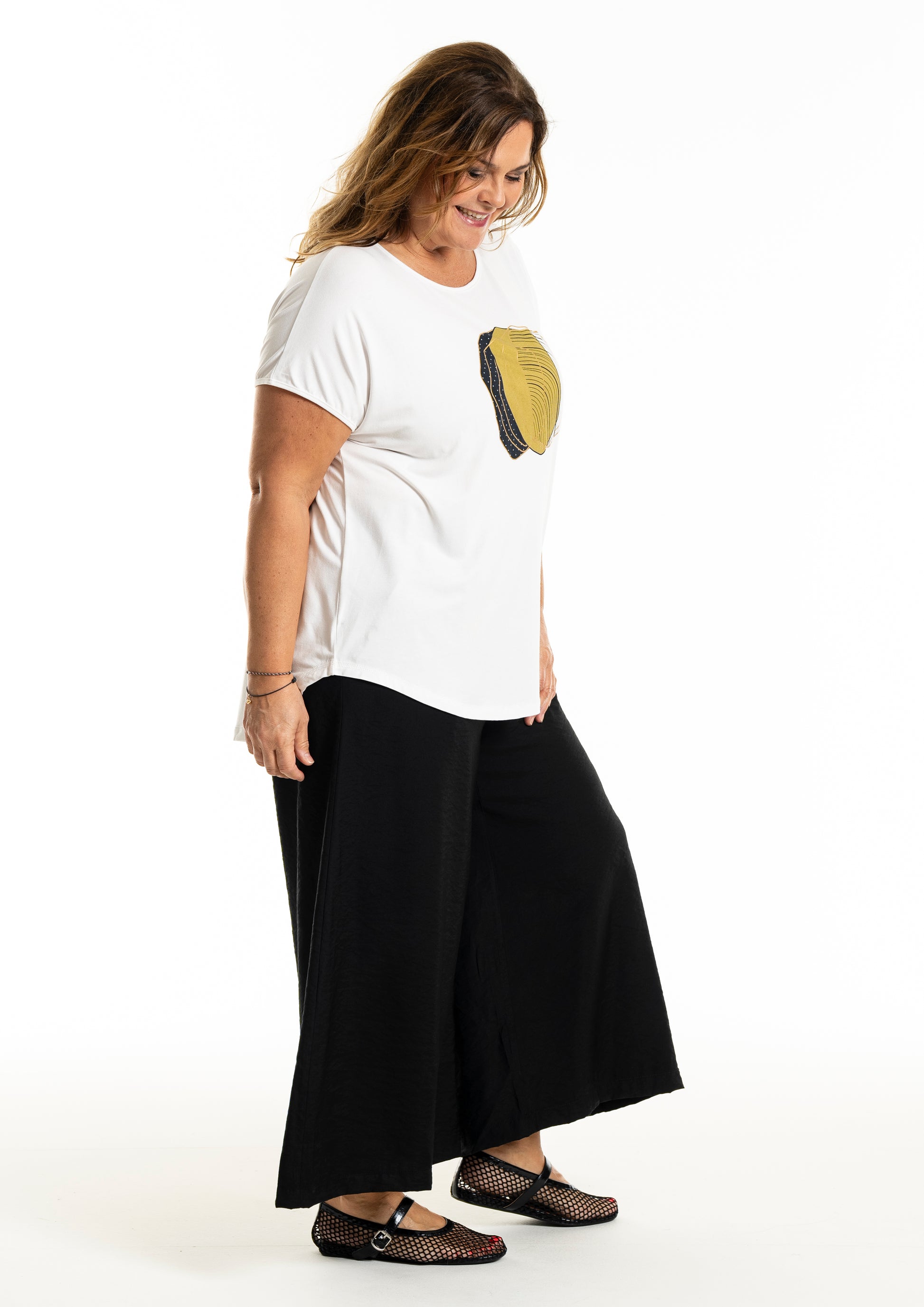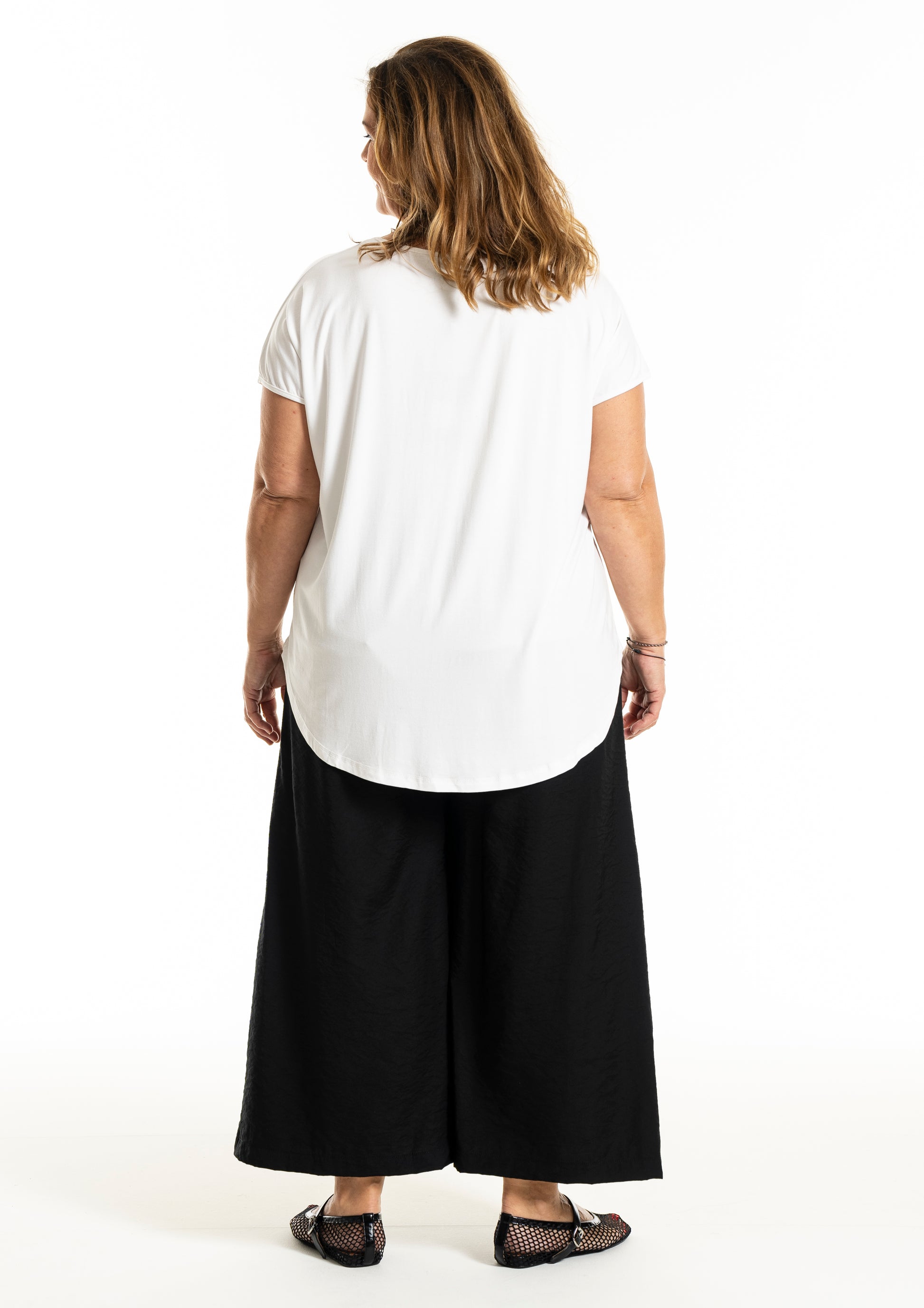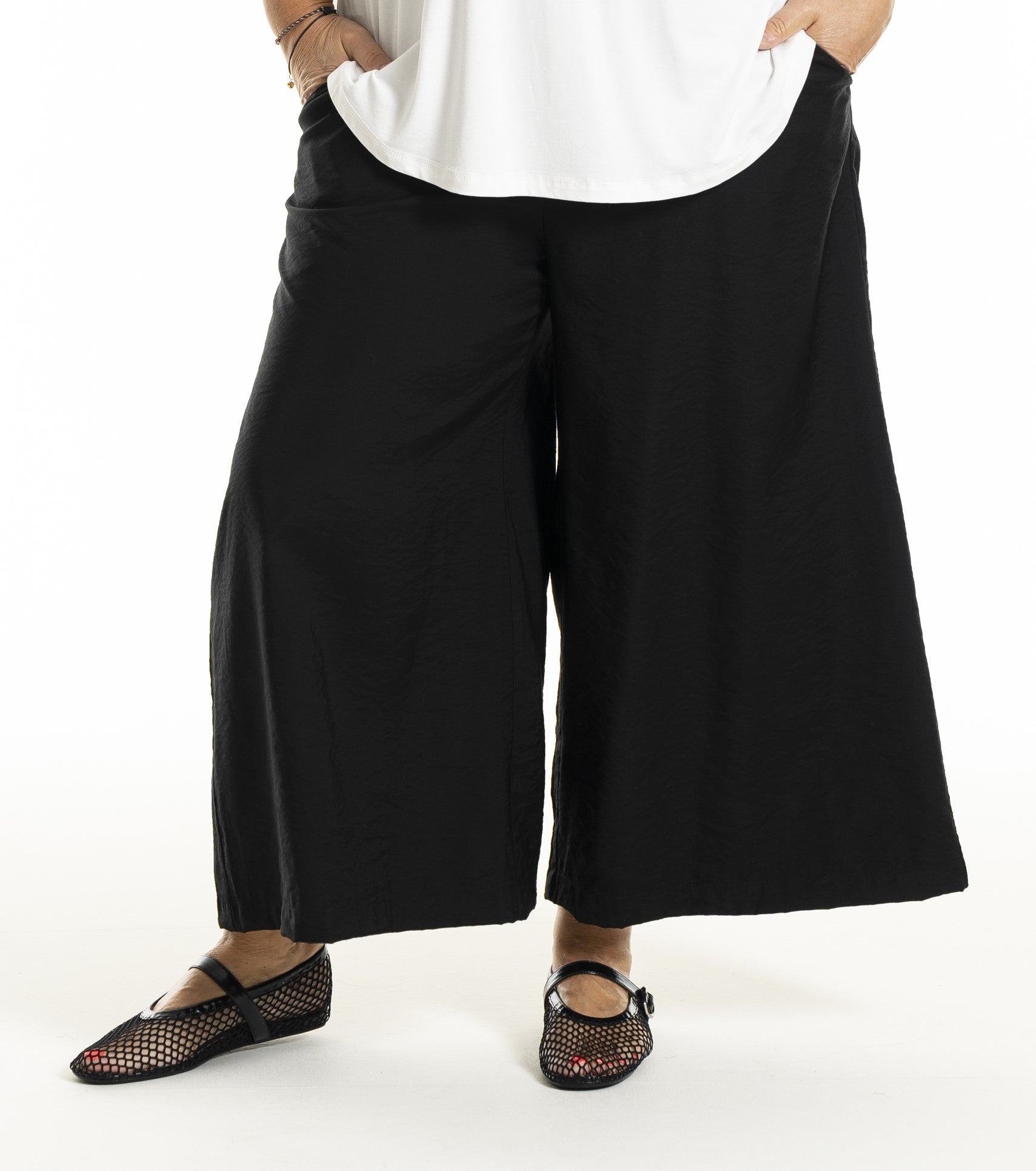 Disse bukser er ideelle til både afslappede og formelle begivenheder, med deres enkle og tidløse design, der gør dem lette at kombinere med forskellige toppe og skjorter. De brede ben og elastiske talje sikrer en behagelig pasform, mens de diskrete sidelommer tilføjer funktionalitet. Gozzip Woman bukser er et must-have i enhver garderobe, der søger stil uden at gå på kompromis med komfort.
