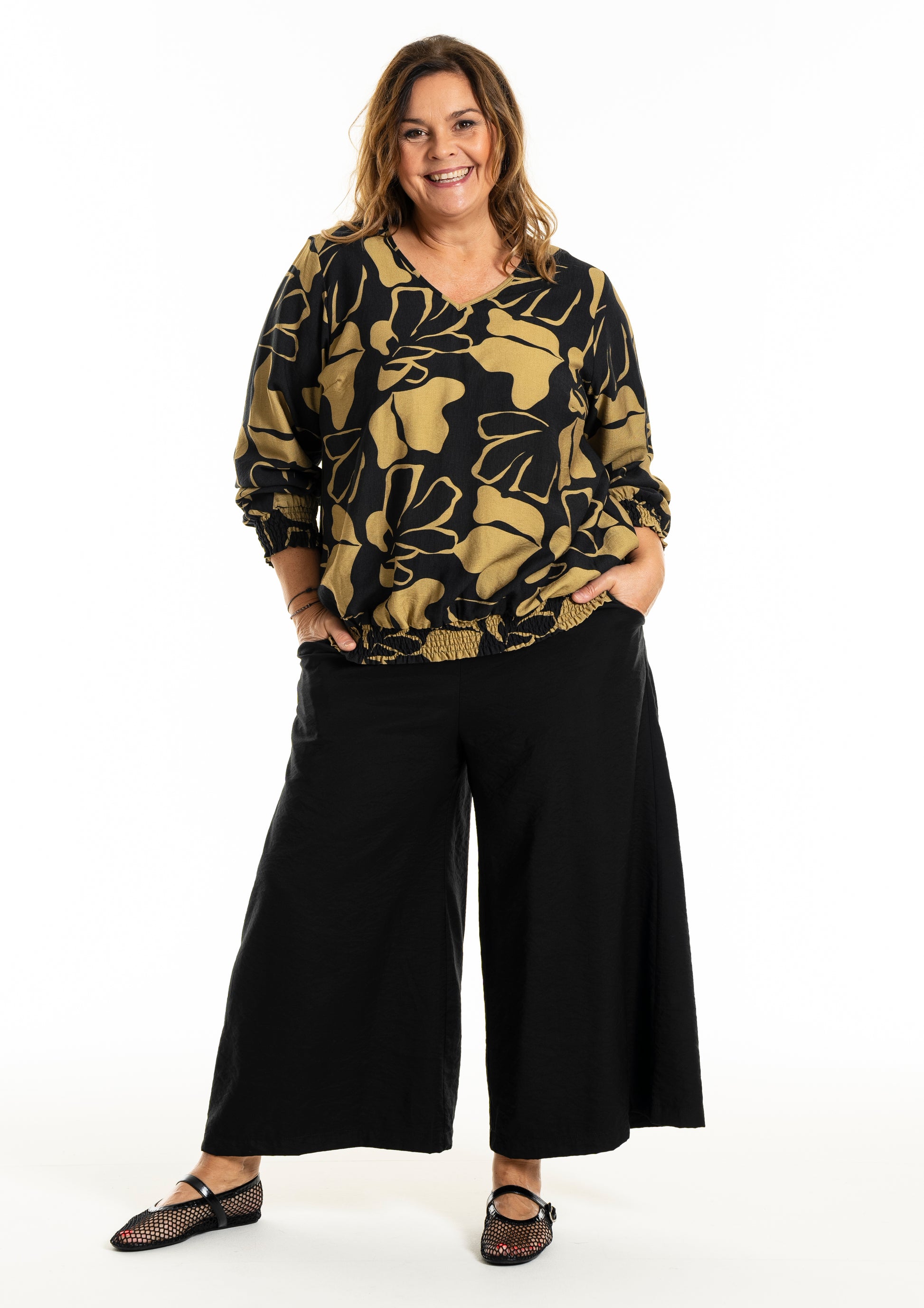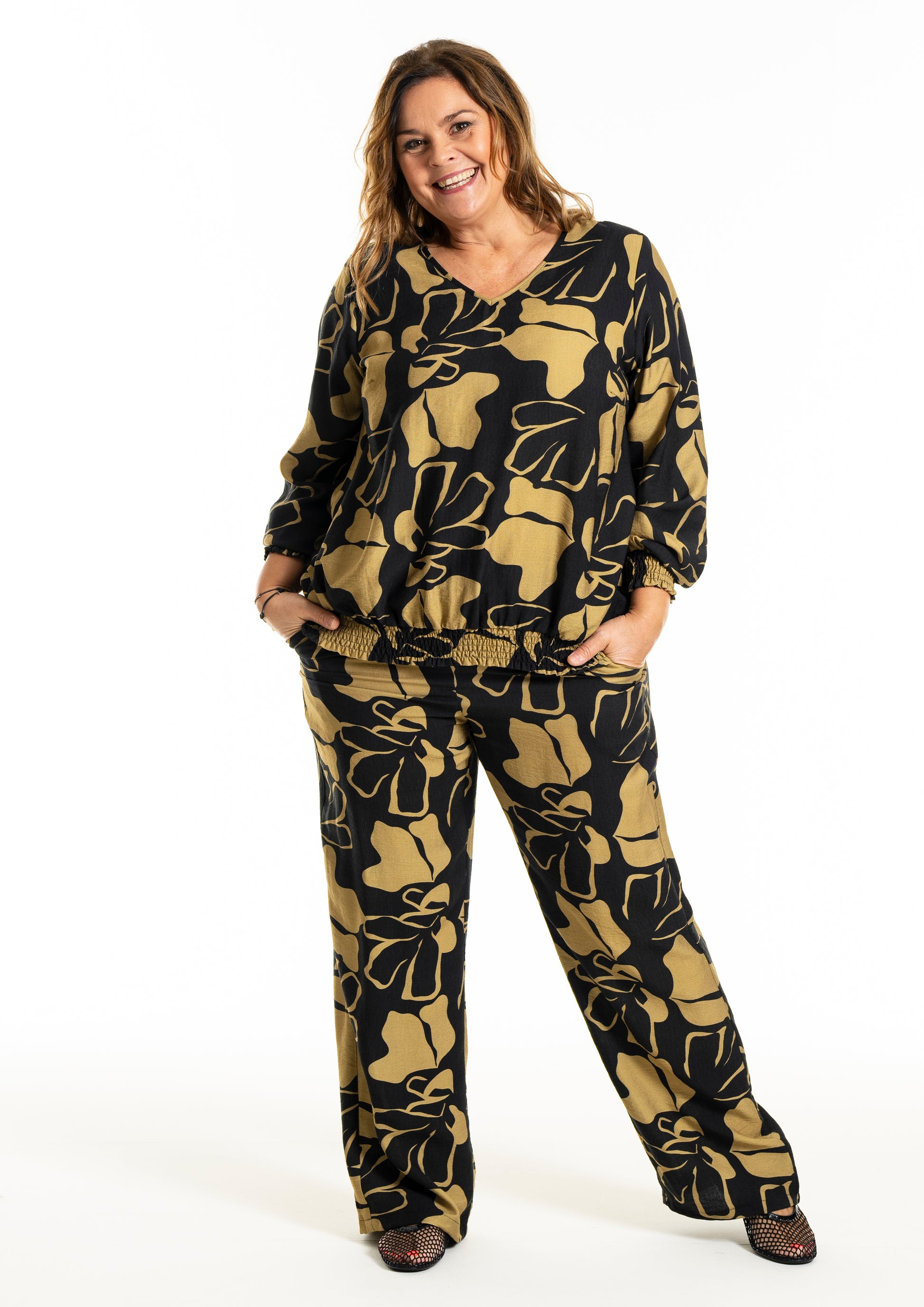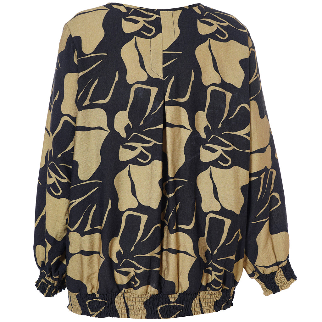 Blusen er dekoreret med markante blomsterlignende motiver, der skaber et moderne og elegant udtryk. Den elastiske kant nederst sikrer en god pasform og fleksibilitet i styling. Perfekt til både hverdag og festlige lejligheder, kan denne bluse let kombineres med forskellige plus size bukser eller nederdele for et komplet look.