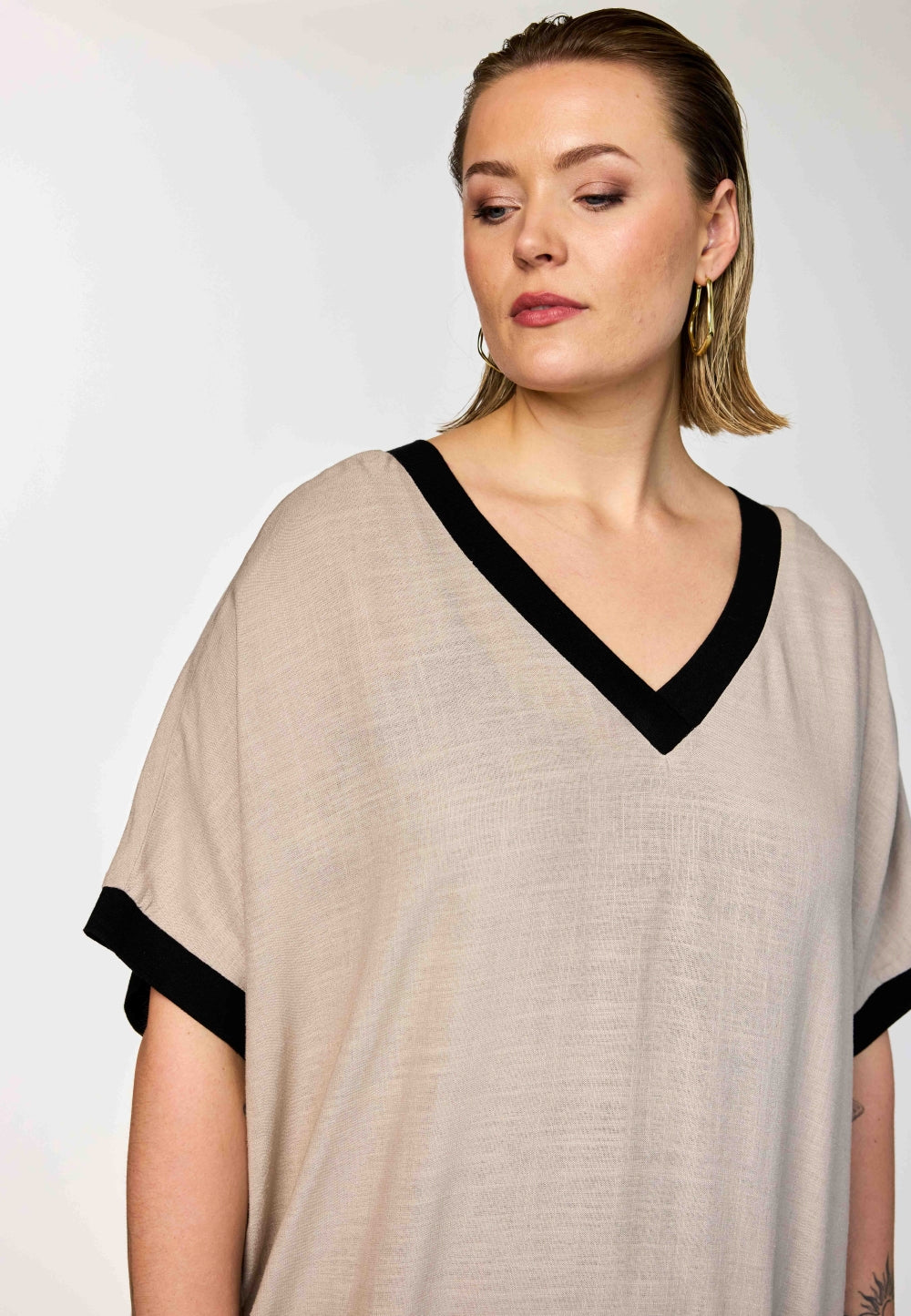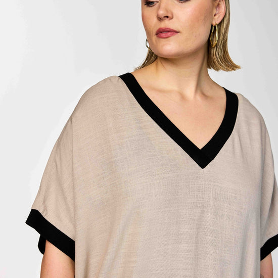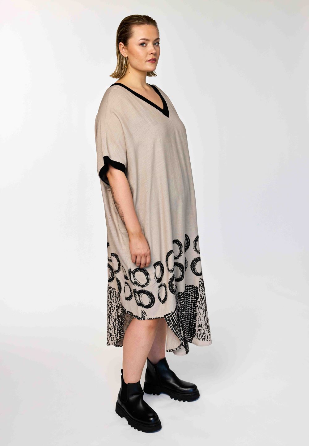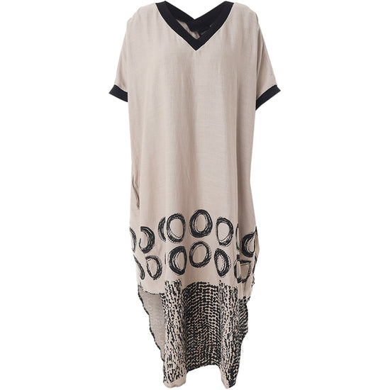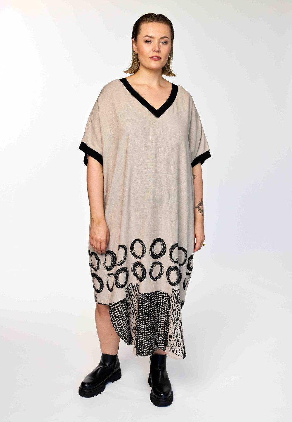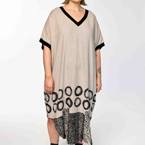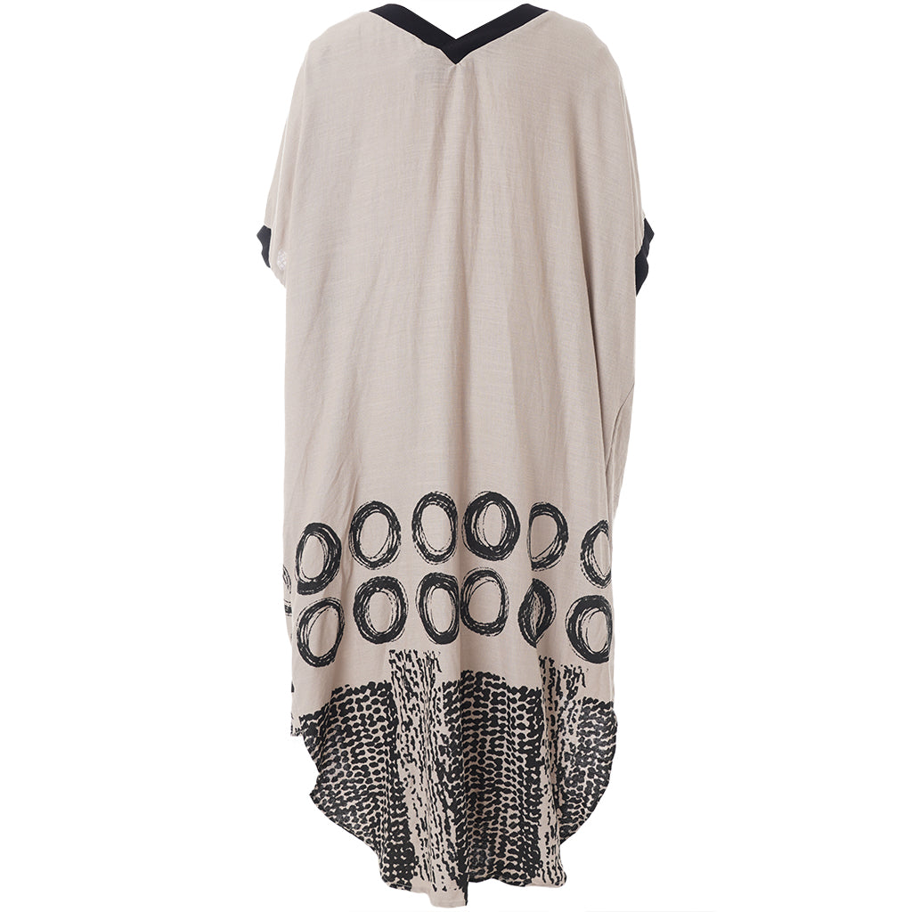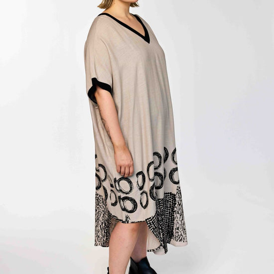Denne skønne GoNia kjole fra Gozzip Woman kombinerer en tidløs sandfarve med markante sorte kontrastdetaljer ved både V-halsen og ærmekanterne. Kjolen har en løs og ubesværet silhuet, der prydes af et iøjnefaldende sort print i bunden bestående af store åbne cirkler og et felt med små tætte prikker forneden.