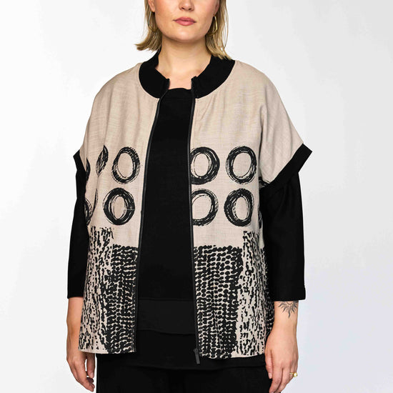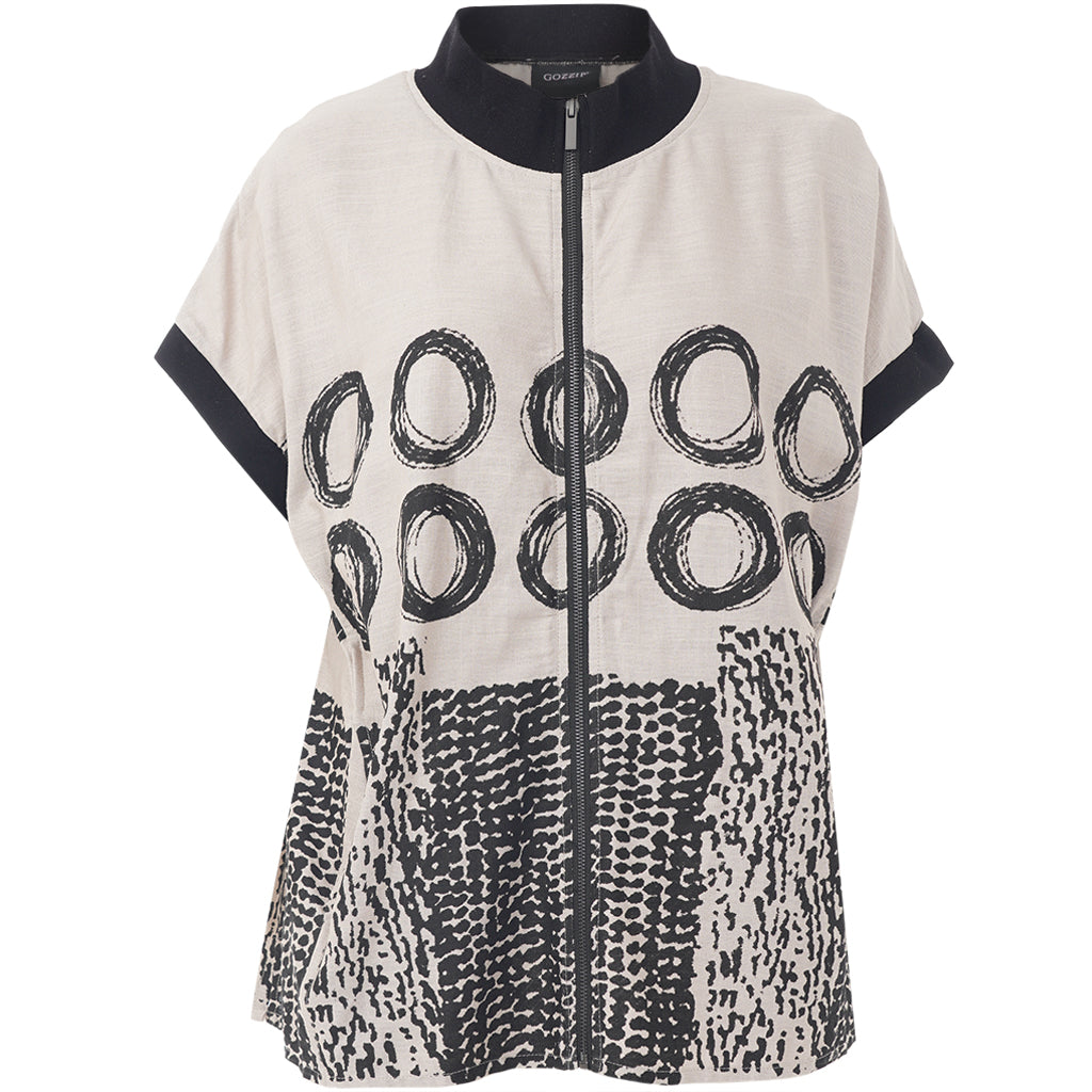 Denne GNynne vest fra Gozzip er en sandfarvet model, der prydes af et flot sort, grafisk print med cirkler og abstrakte mønstre. Den har en løs og rummelig pasform, der falder blødt omkring kroppen og giver et afslappet look. Vesten er udstyret med en praktisk lynlås foran og en sort ribkant i halsen, som skaber en fin kontrast til det lyse stof. De korte, brede ærmer giver silhuetten et let kimono-inspireret snit, der er behageligt at have på.