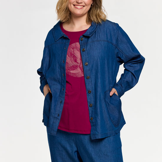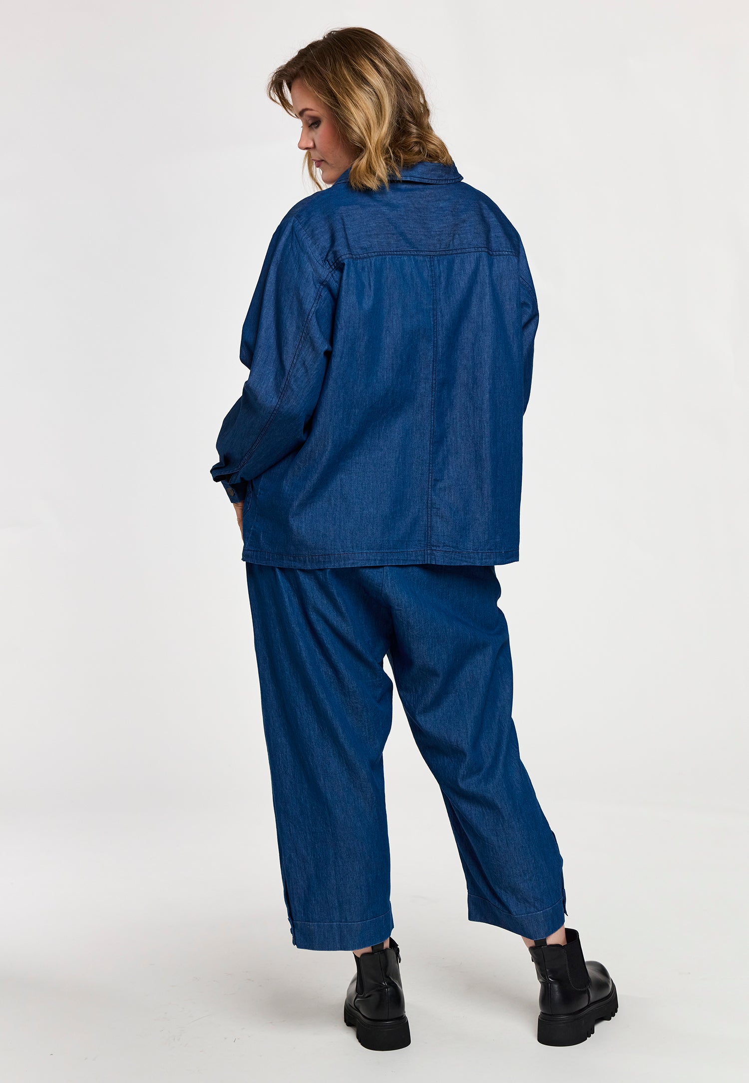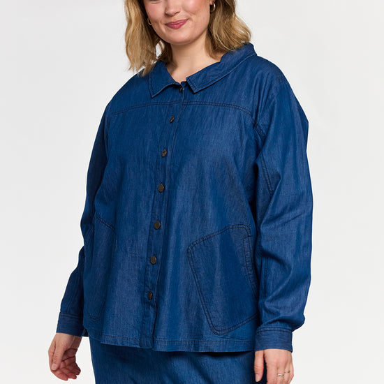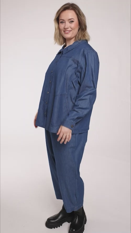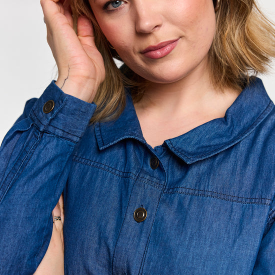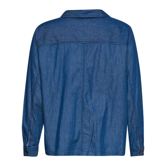 En let og afslappet denimjakke i 100% bomuld med rummelig pasform og et blødt, moderne udtryk. Modellen har en klassisk skjortekrave, gennemgående knaplukning og lange ærmer, som giver jakken et både feminint og komfortabelt look.