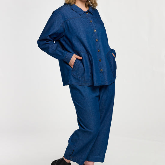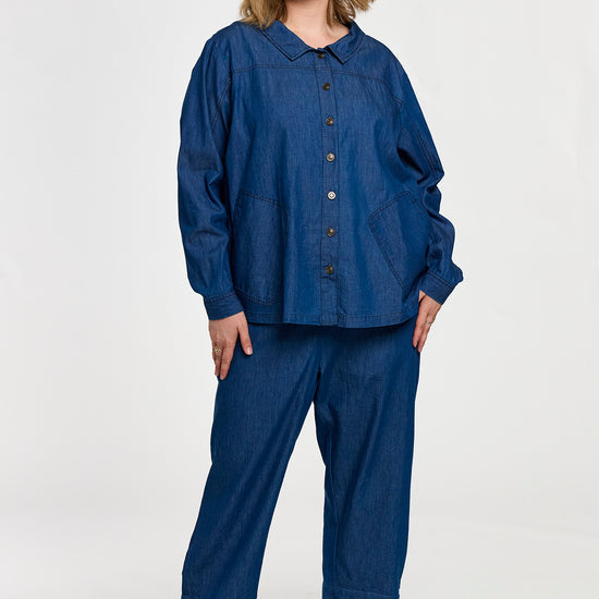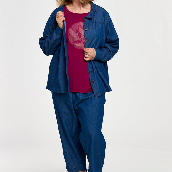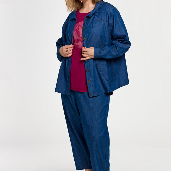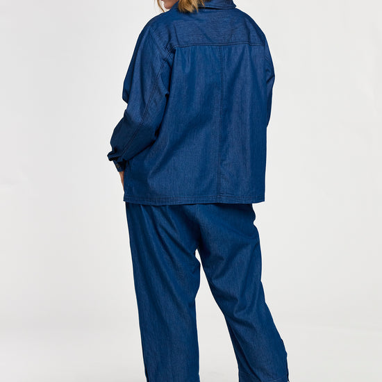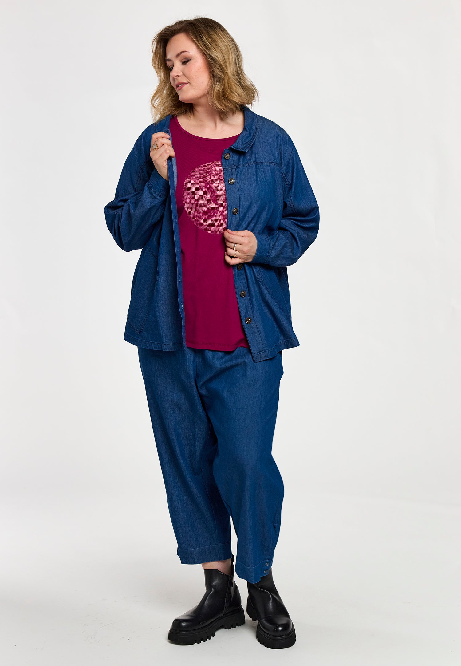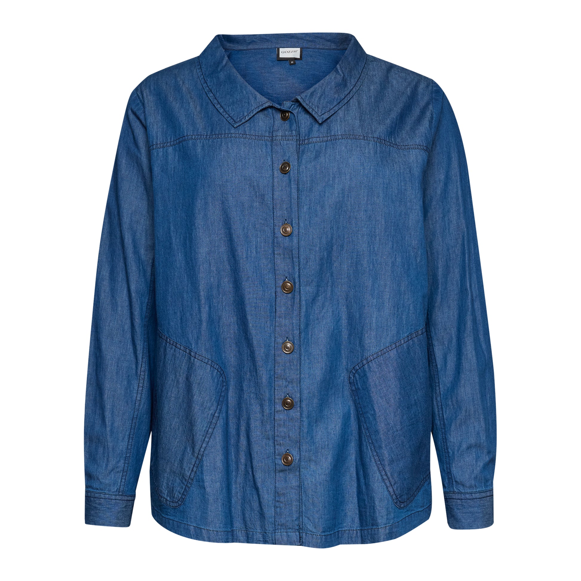 En let og afslappet denimjakke i 100% bomuld med rummelig pasform og et blødt, moderne udtryk. Modellen har en klassisk skjortekrave, gennemgående knaplukning og lange ærmer, som giver jakken et både feminint og komfortabelt look.
