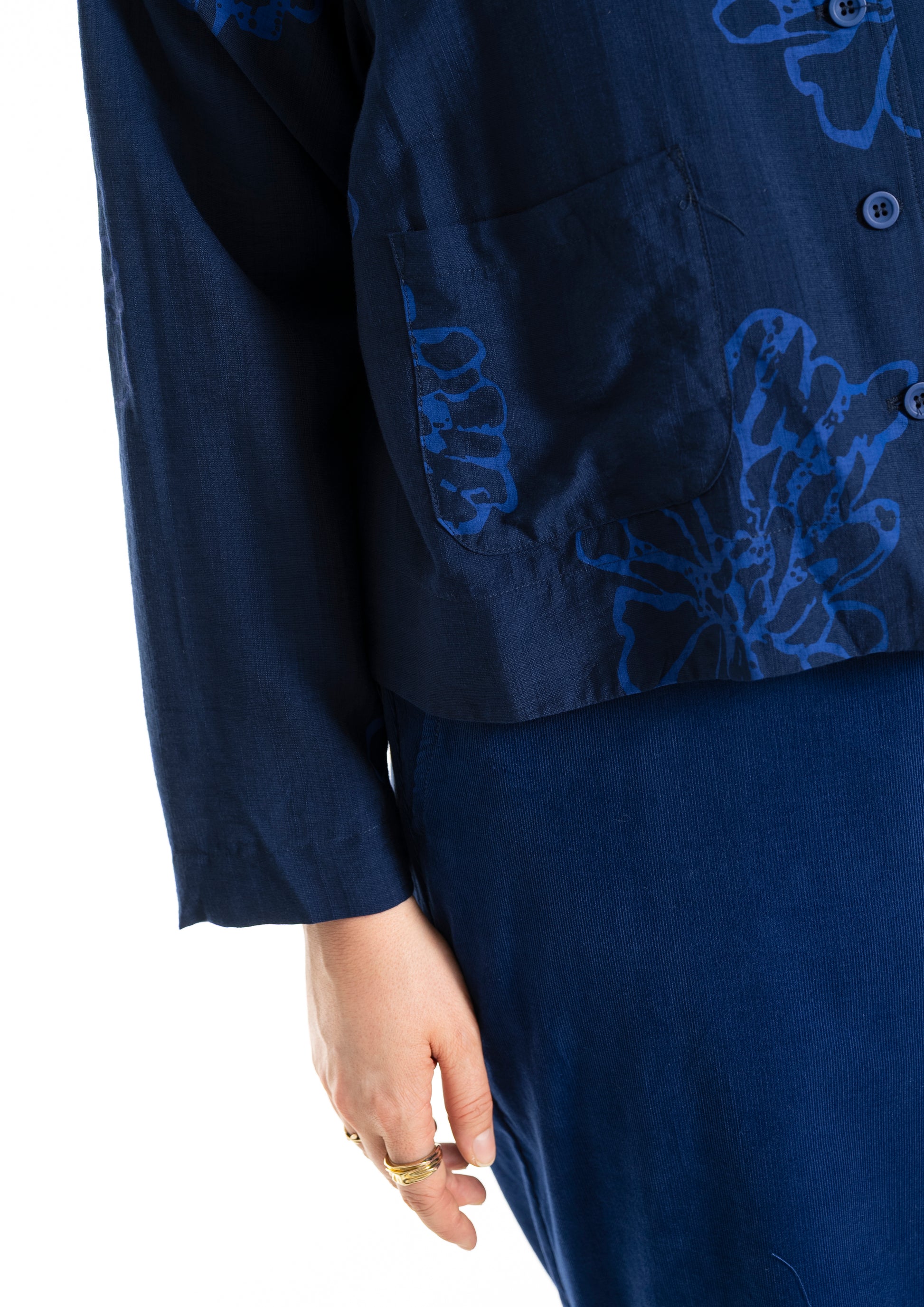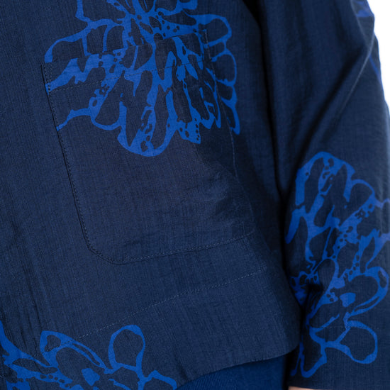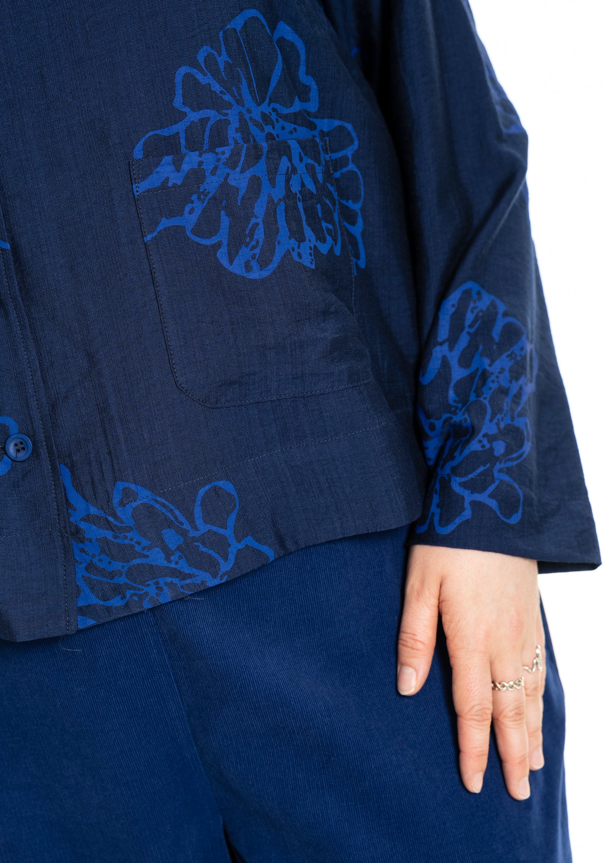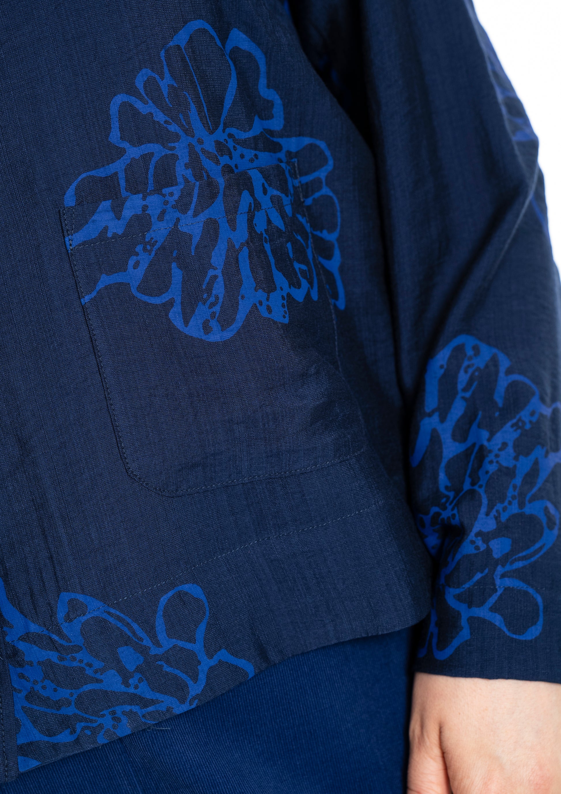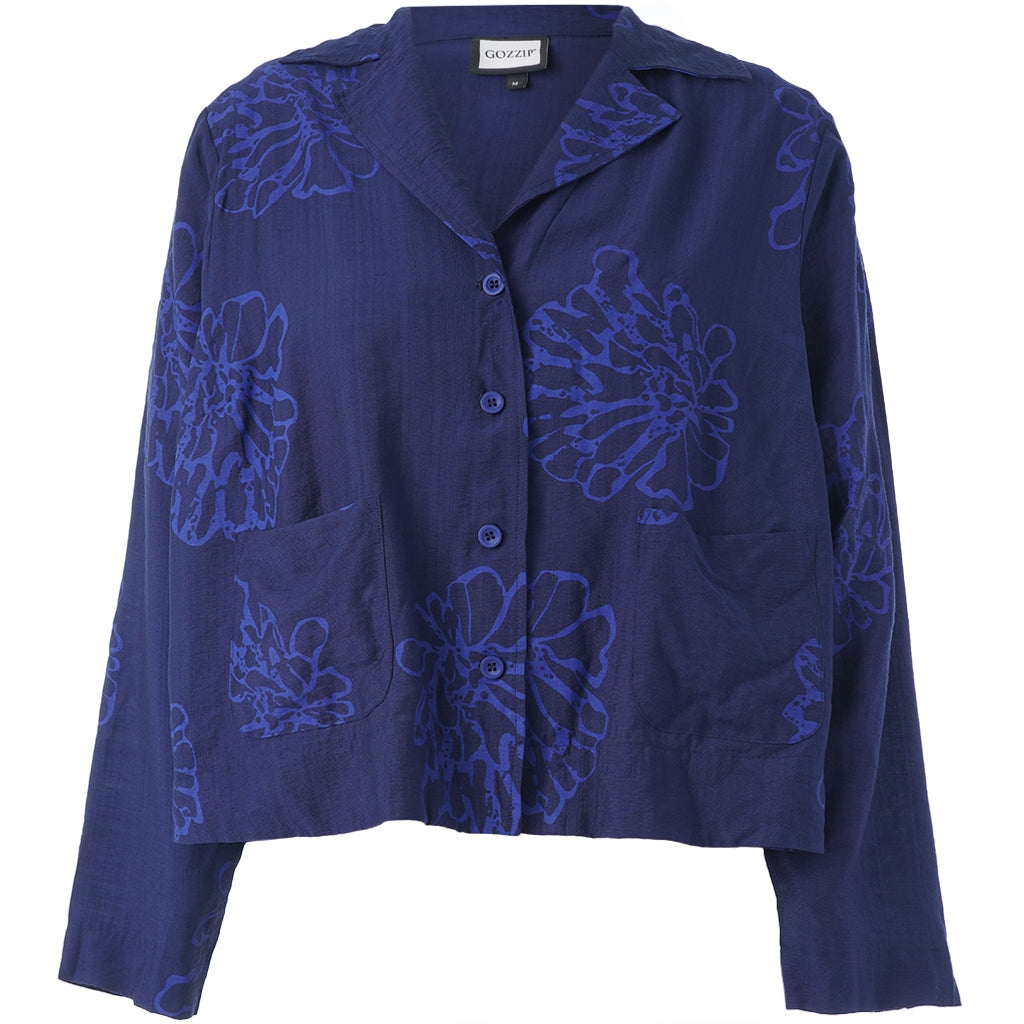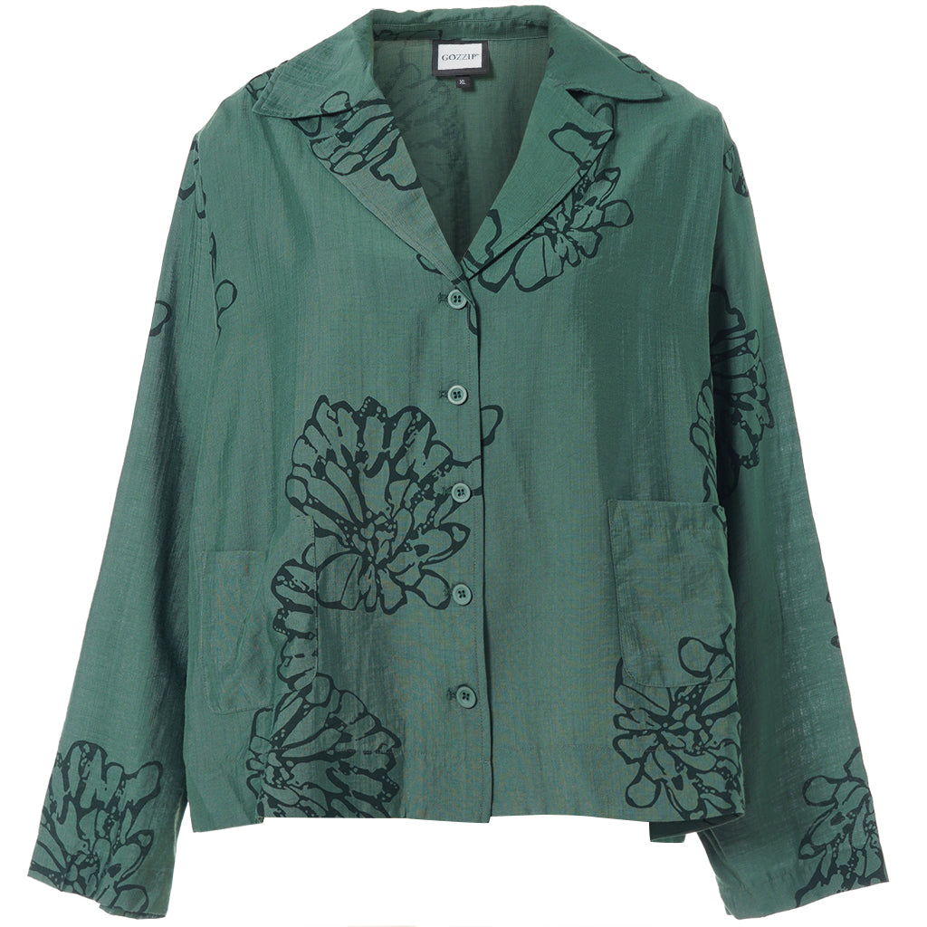 Denne moderne skjortejakke fra Gozzip kombinerer et stilrent design med et smukt, grafisk blomsterprint, der giver dybde til looket. Materialet består af en blød blanding af viskose og nylon, som falder let og behageligt omkring kroppen, mens de store lommer tilfører et praktisk og afslappet element.