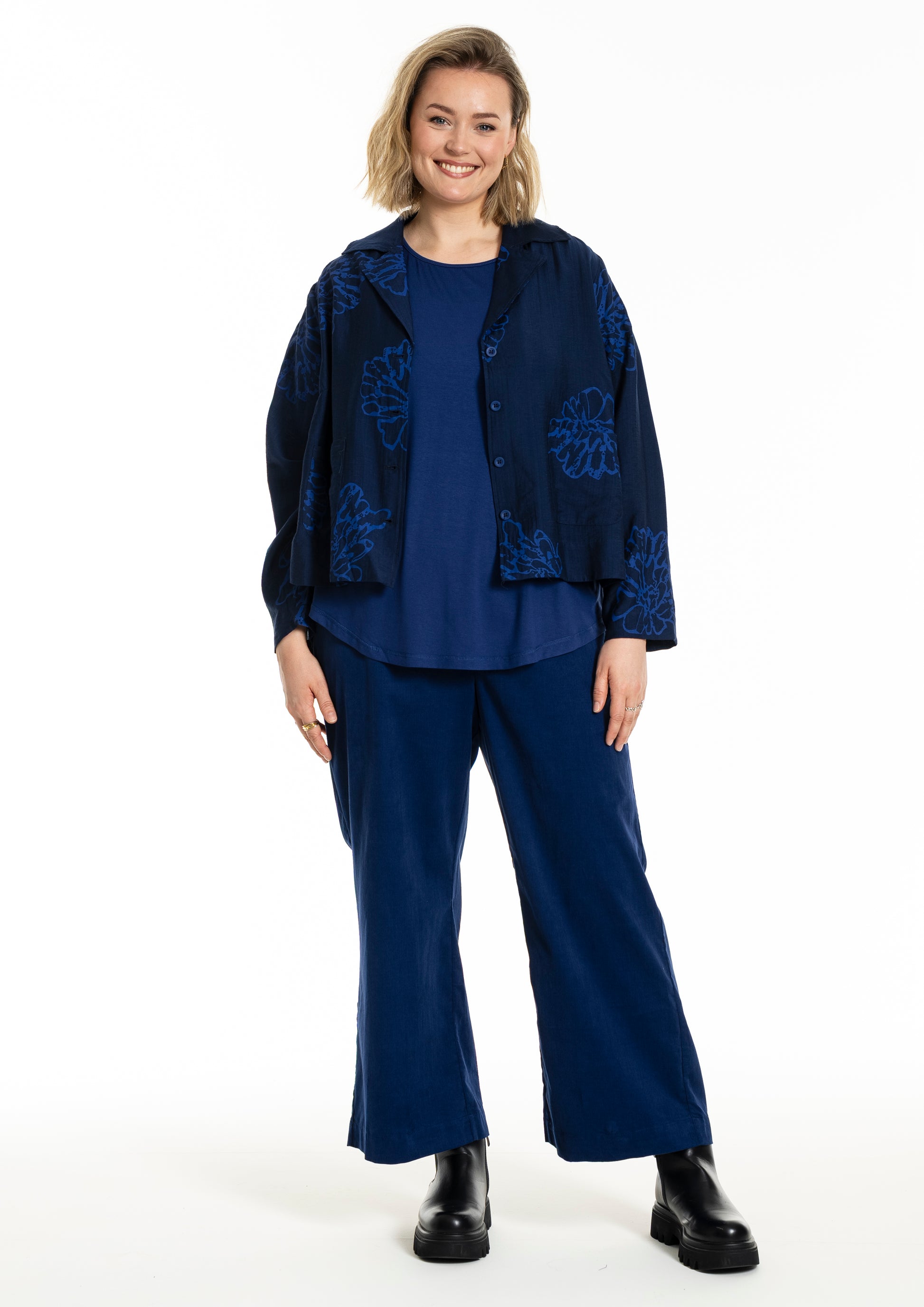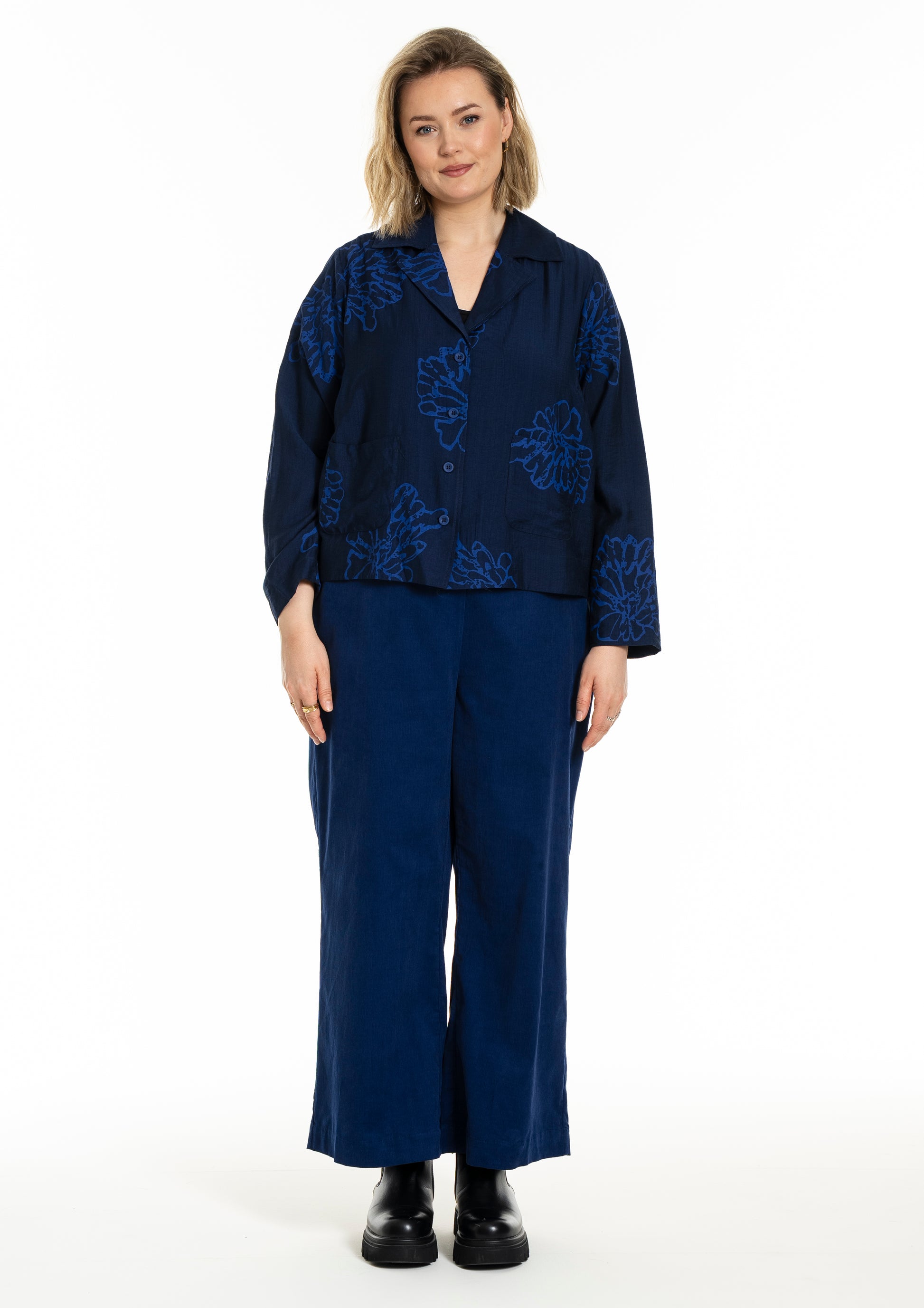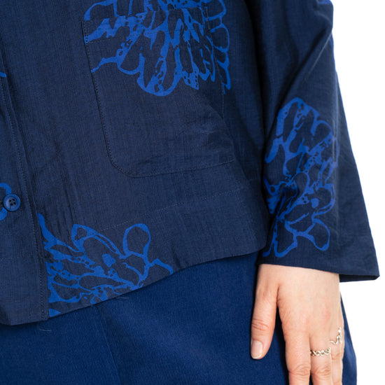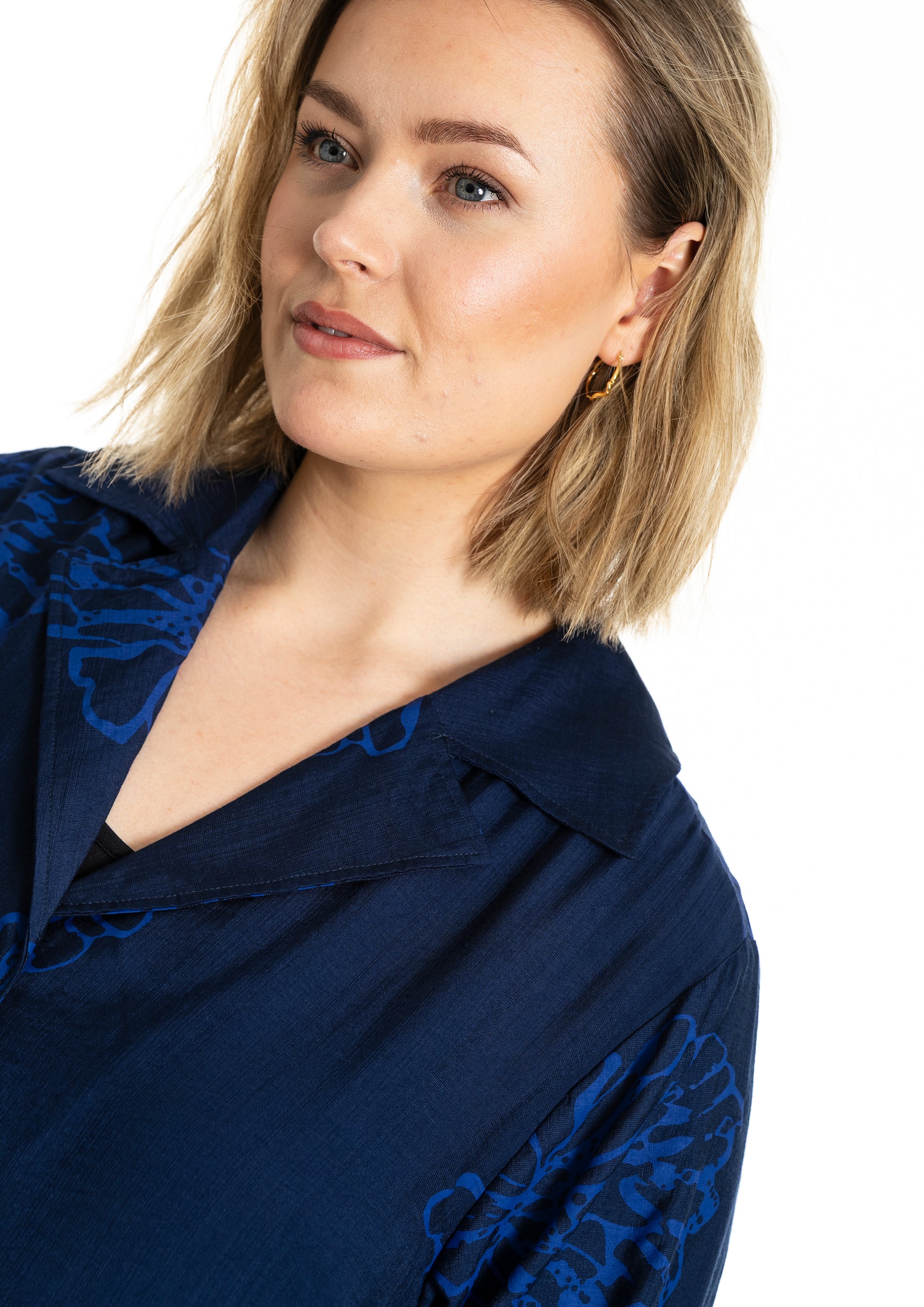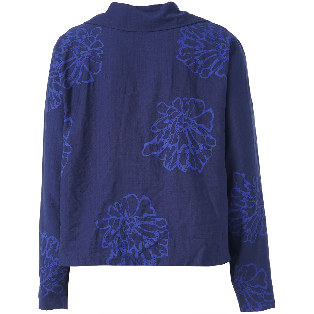 Denne moderne skjortejakke fra Gozzip kombinerer et stilrent design med et smukt, grafisk blomsterprint, der giver dybde til looket. Materialet består af en blød blanding af viskose og nylon, som falder let og behageligt omkring kroppen, mens de store lommer tilfører et praktisk og afslappet element.