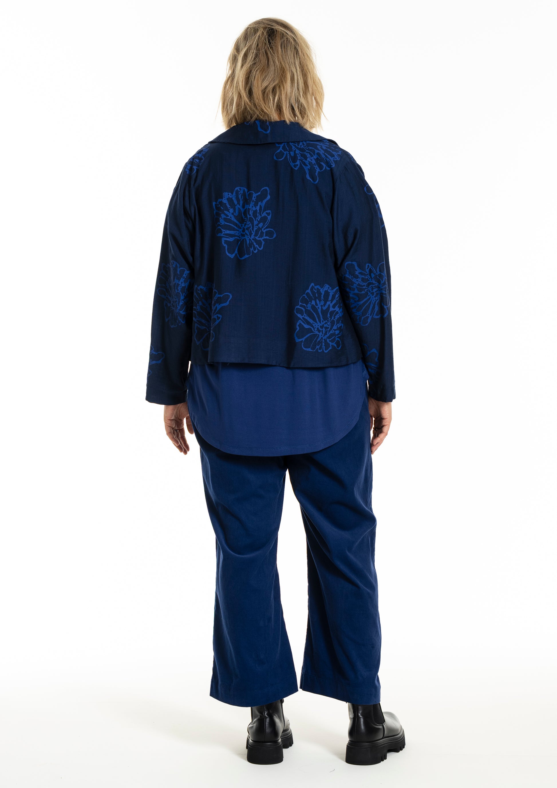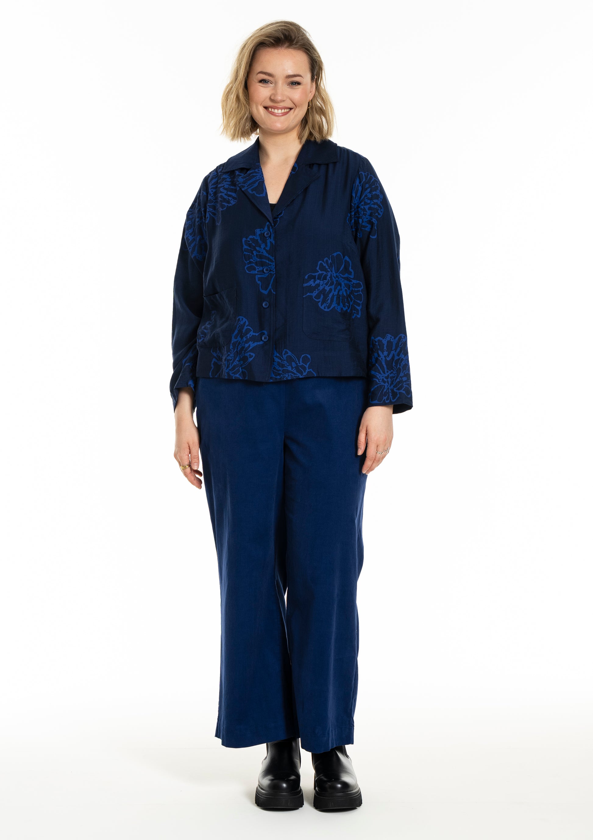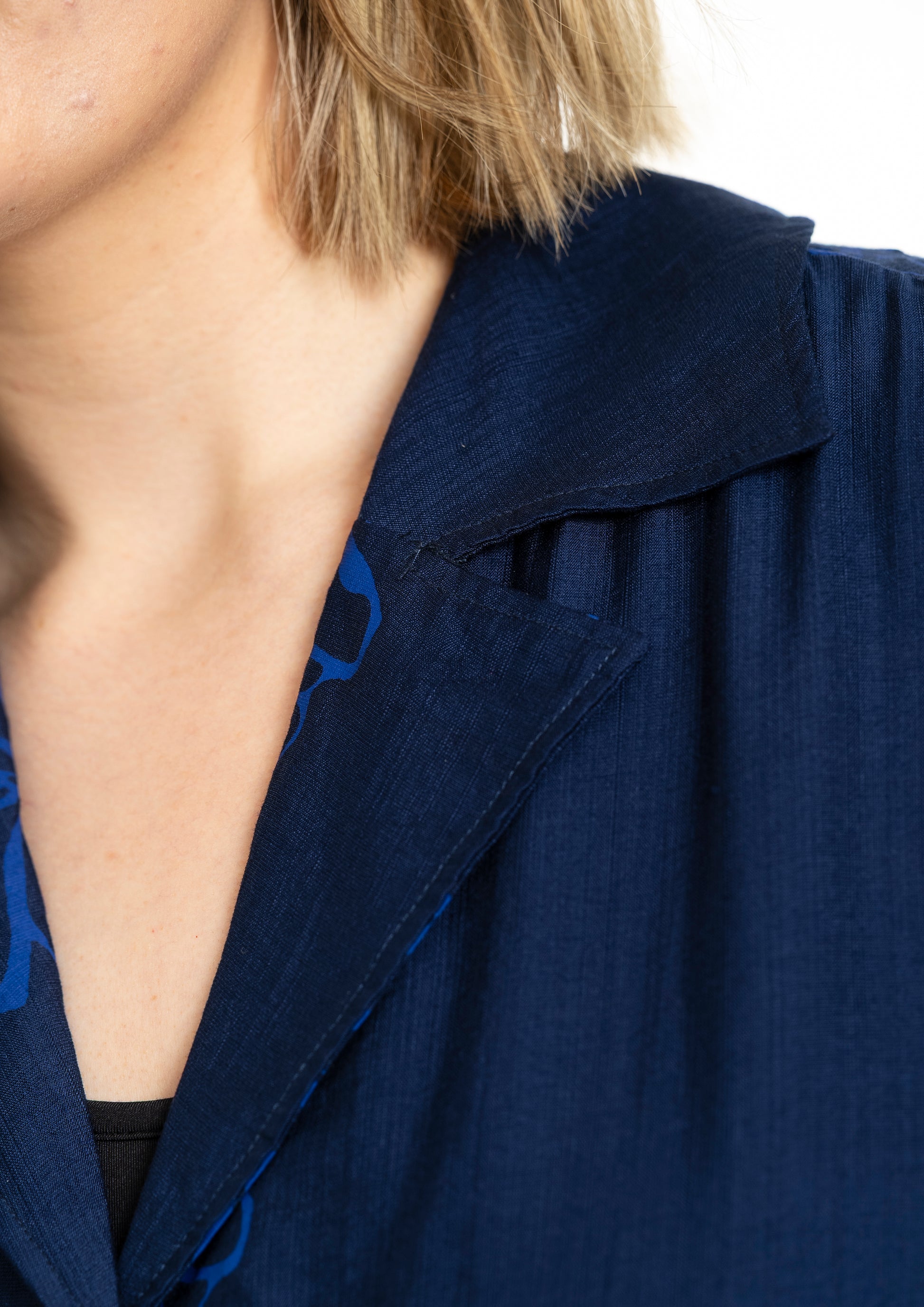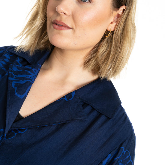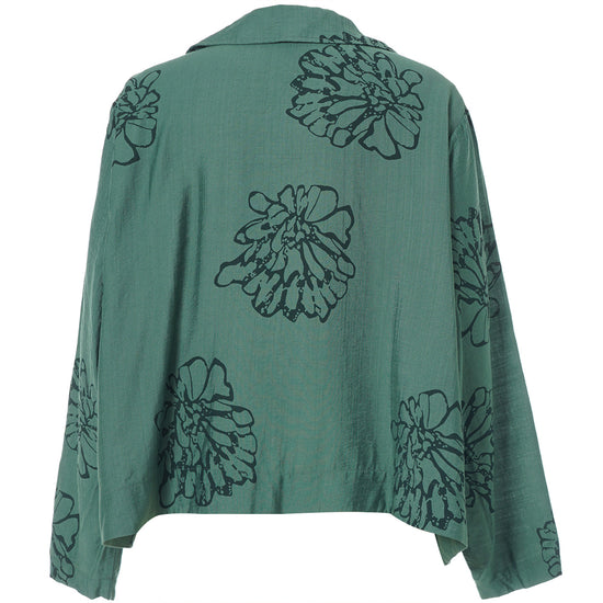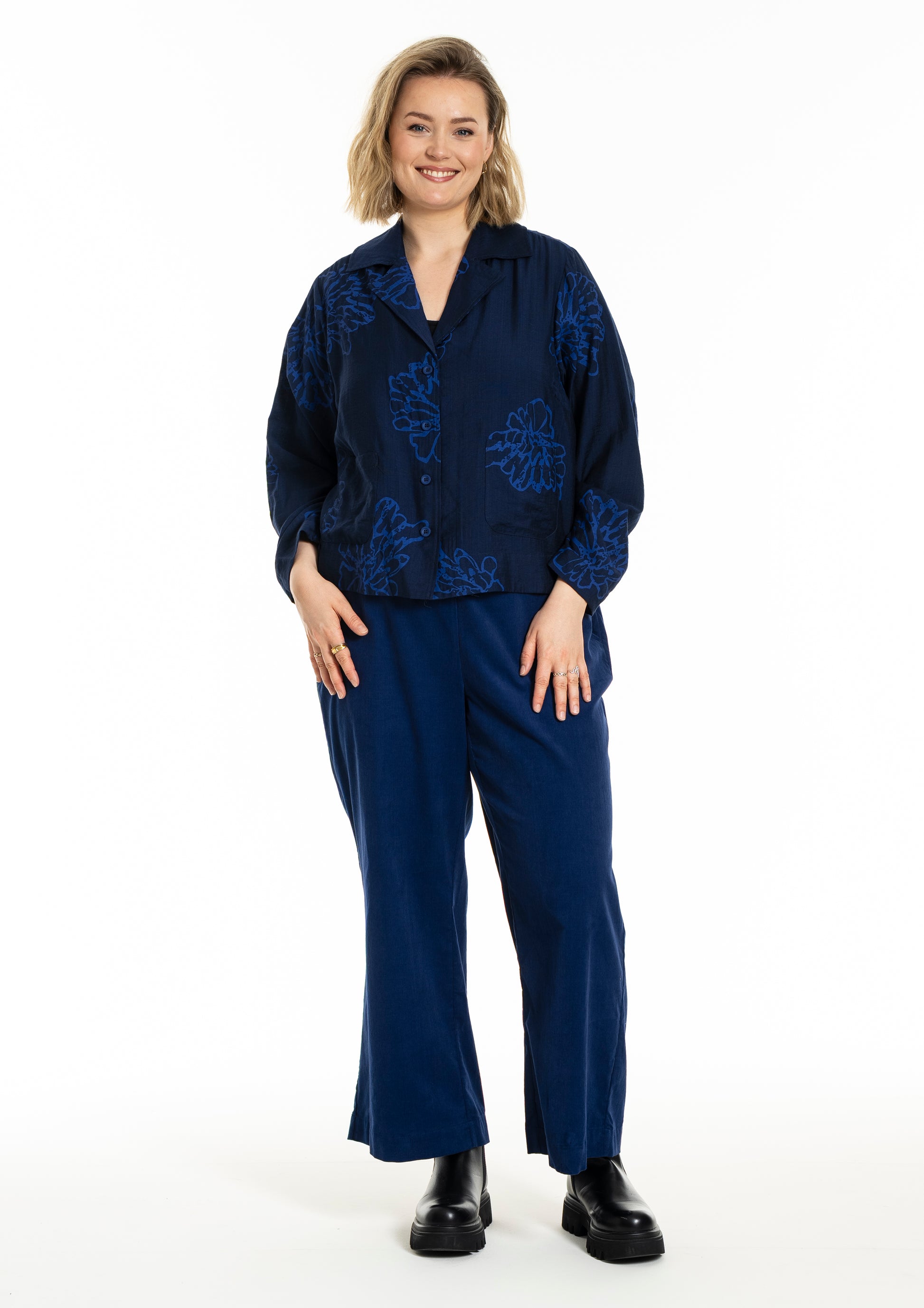 Denne moderne skjortejakke fra Gozzip kombinerer et stilrent design med et smukt, grafisk blomsterprint, der giver dybde til looket. Materialet består af en blød blanding af viskose og nylon, som falder let og behageligt omkring kroppen, mens de store lommer tilfører et praktisk og afslappet element.