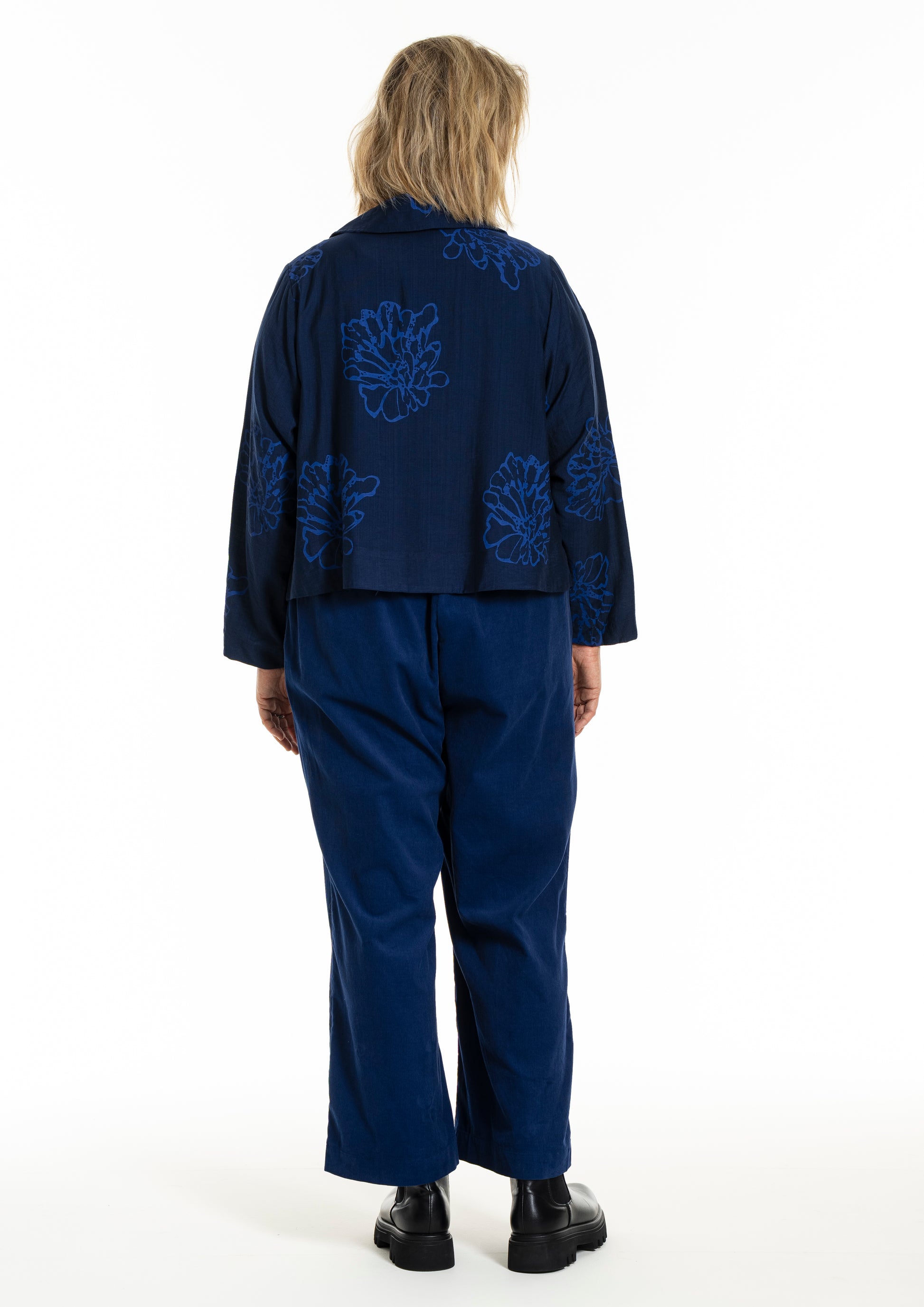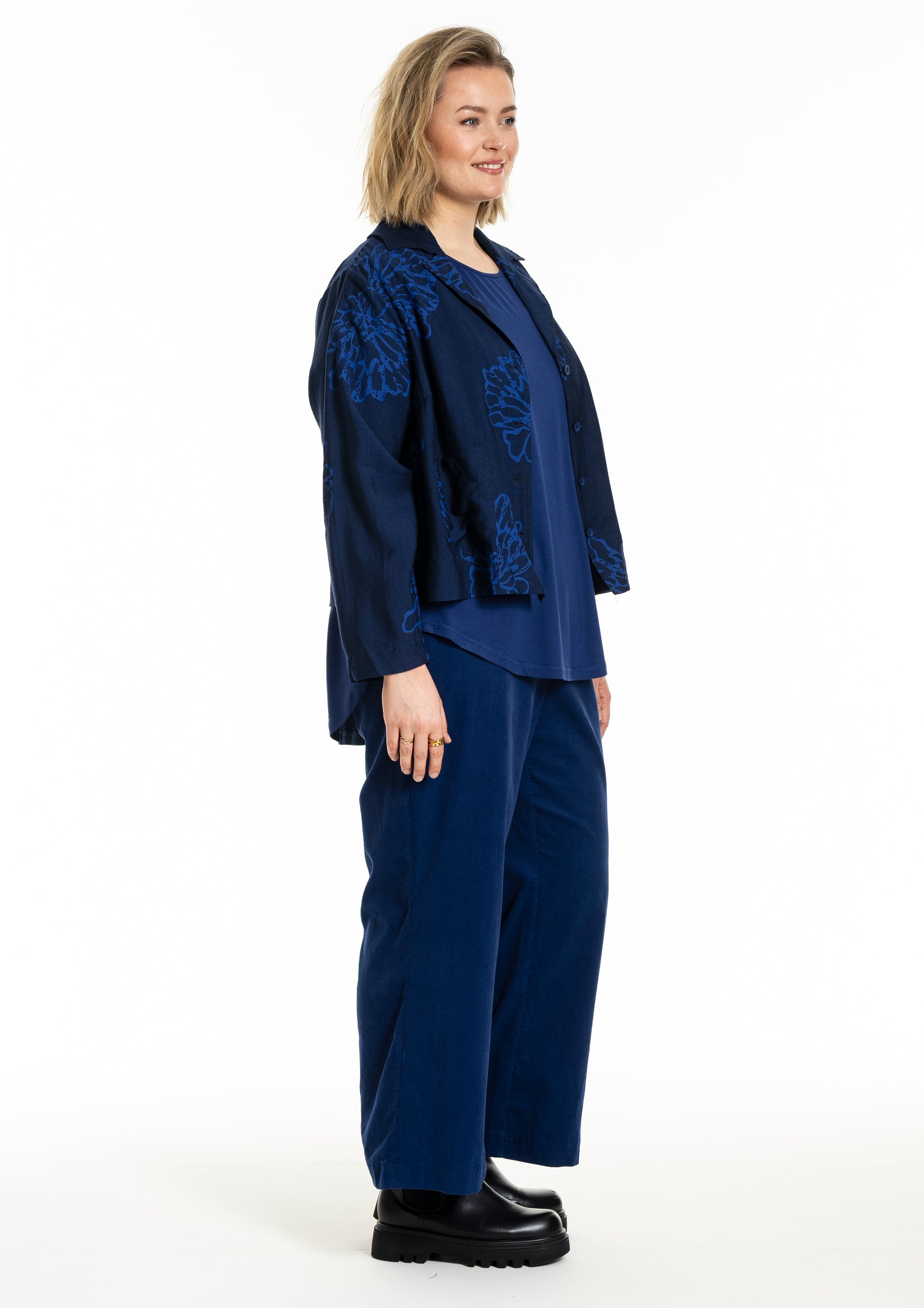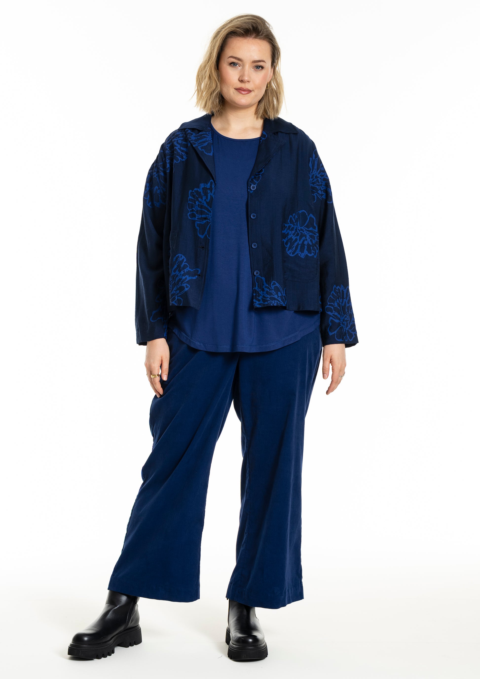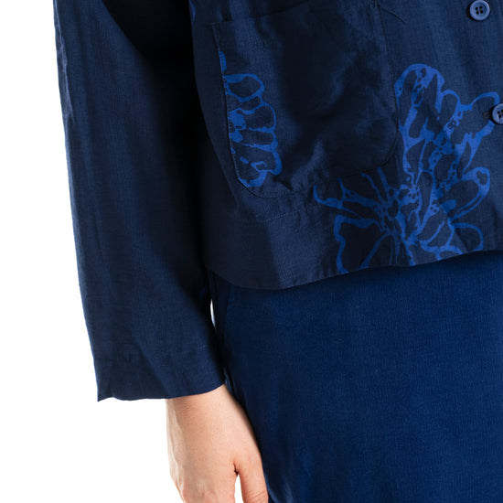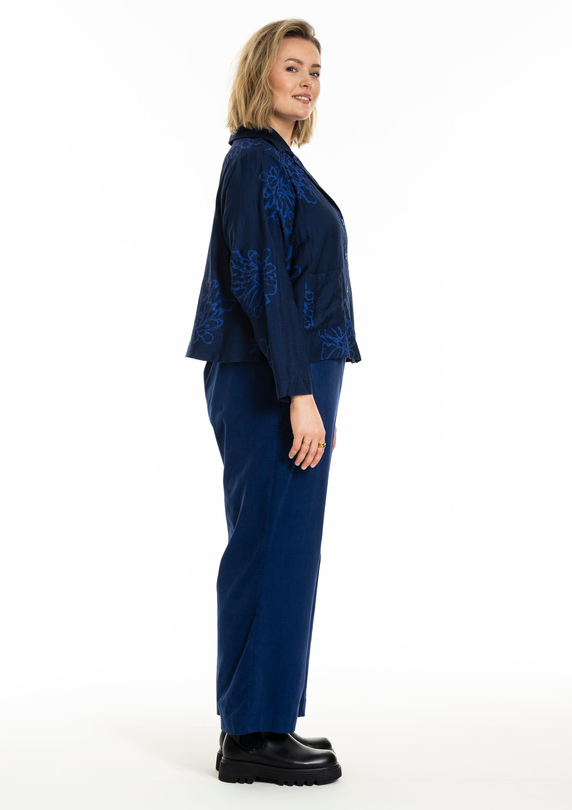 Denne moderne skjortejakke fra Gozzip kombinerer et stilrent design med et smukt, grafisk blomsterprint, der giver dybde til looket. Materialet består af en blød blanding af viskose og nylon, som falder let og behageligt omkring kroppen, mens de store lommer tilfører et praktisk og afslappet element.