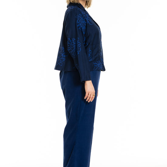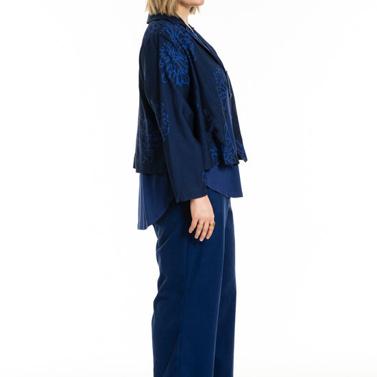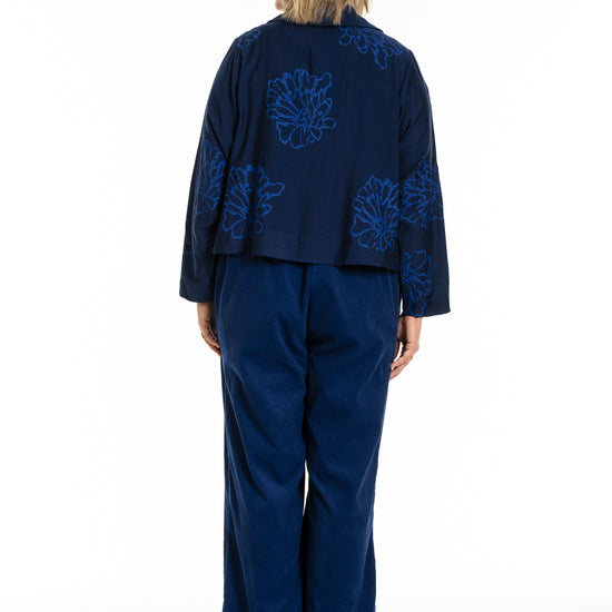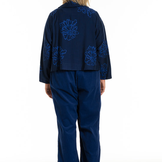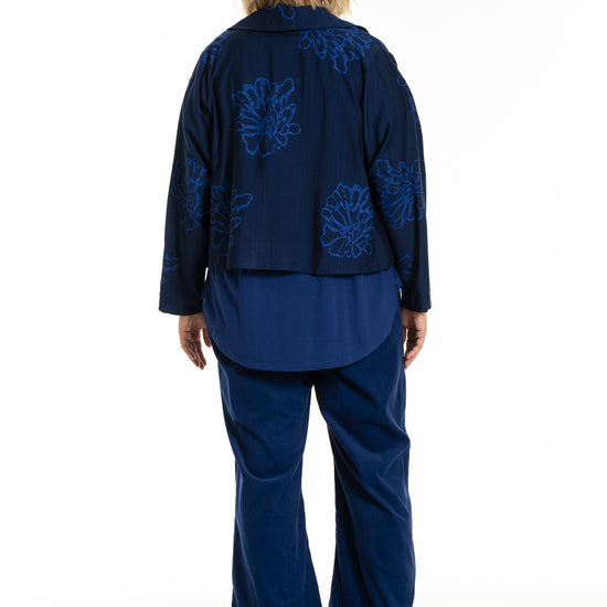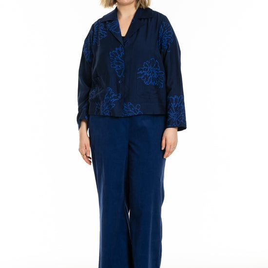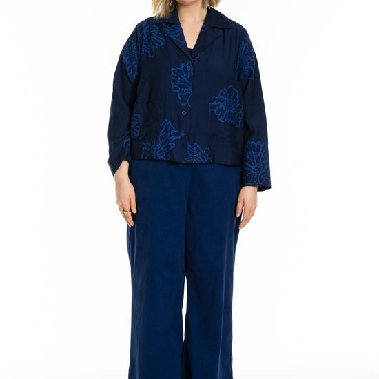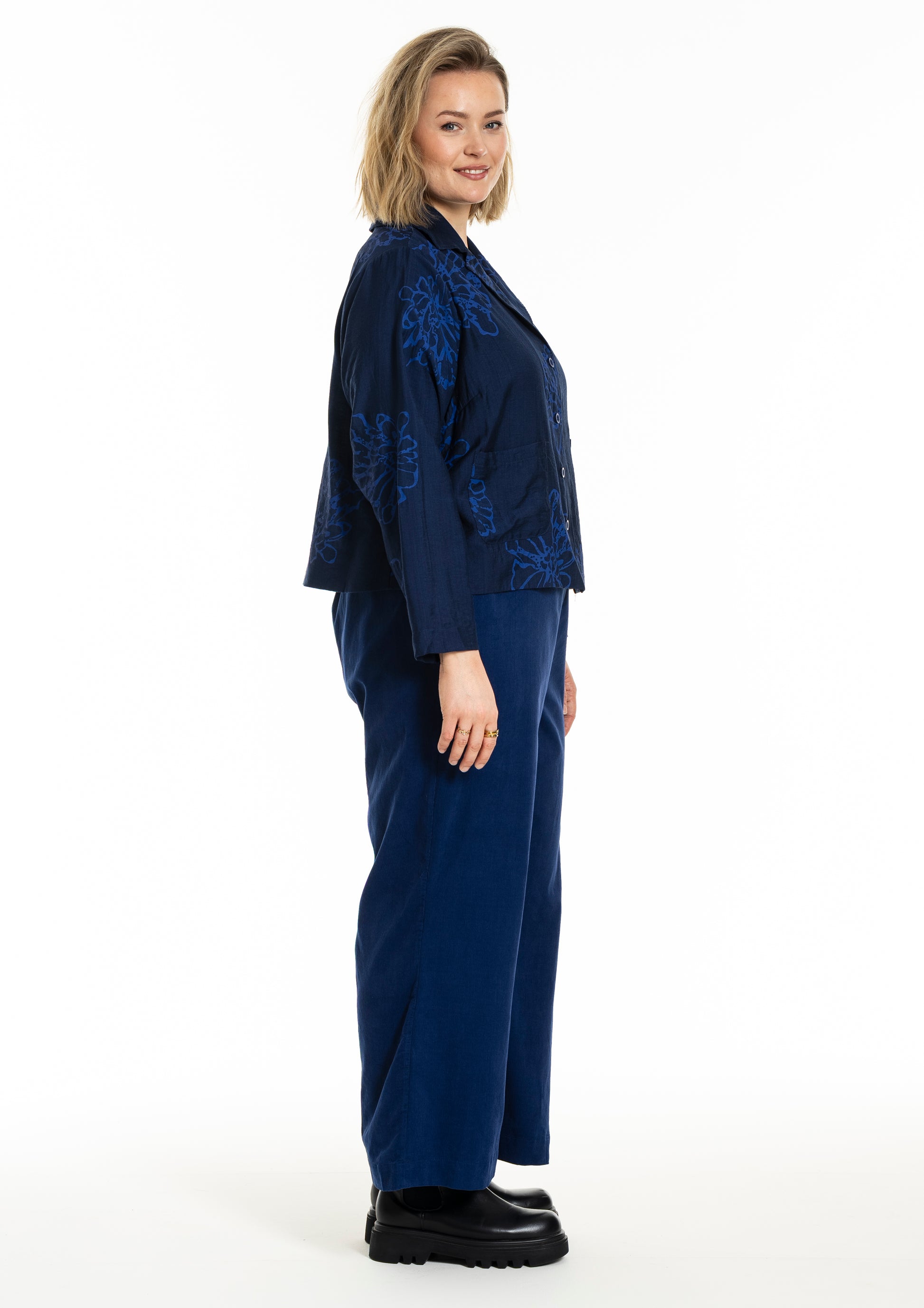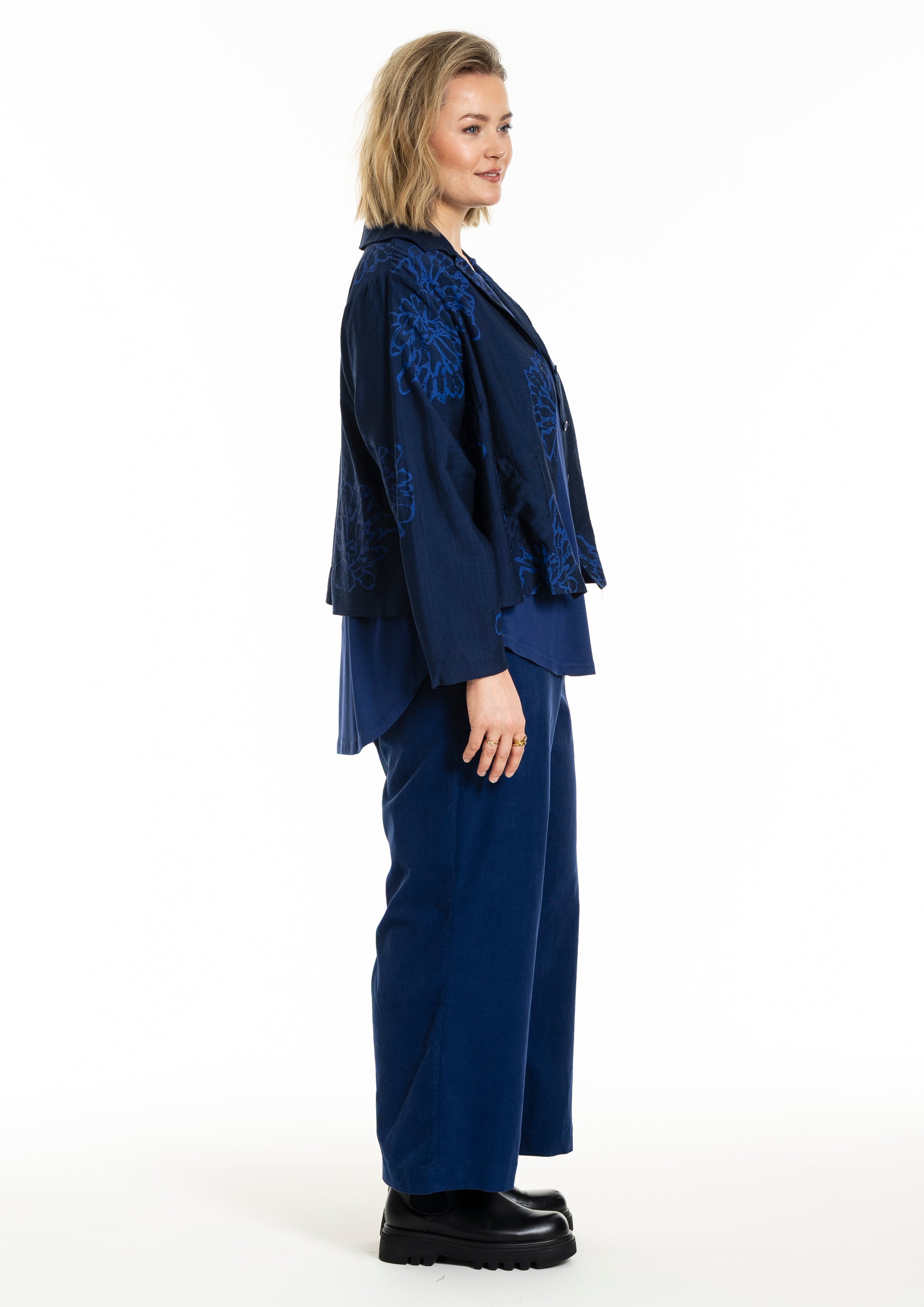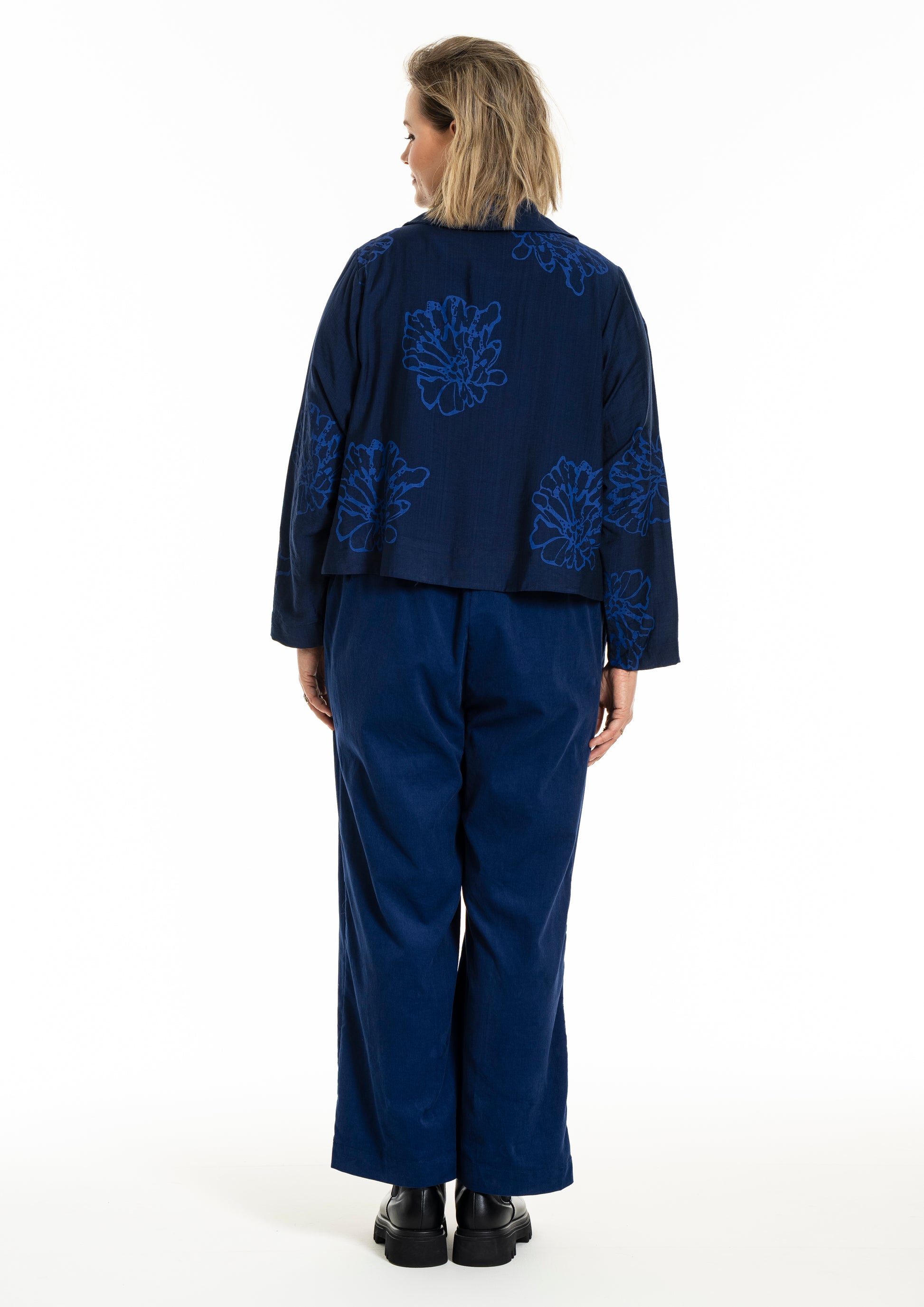 Denne moderne skjortejakke fra Gozzip kombinerer et stilrent design med et smukt, grafisk blomsterprint, der giver dybde til looket. Materialet består af en blød blanding af viskose og nylon, som falder let og behageligt omkring kroppen, mens de store lommer tilfører et praktisk og afslappet element.