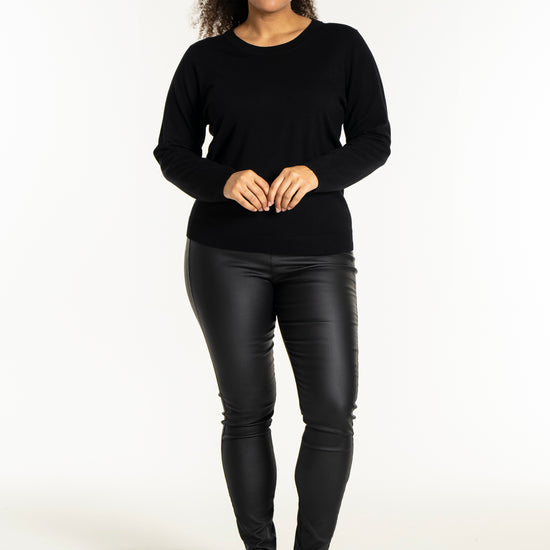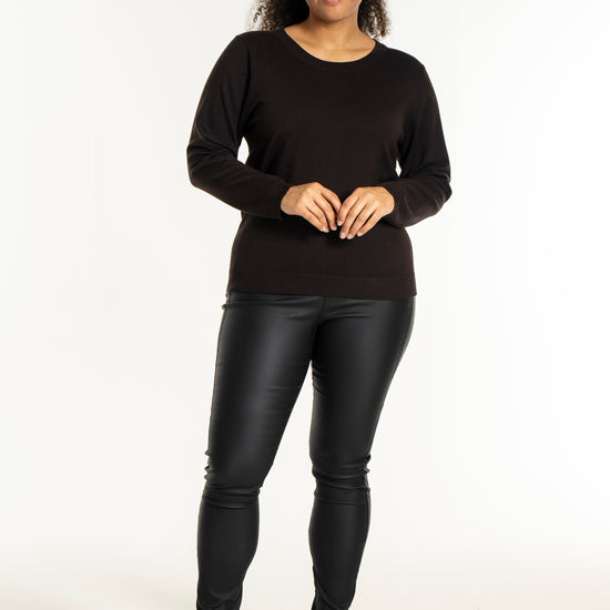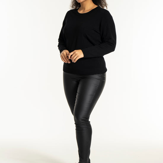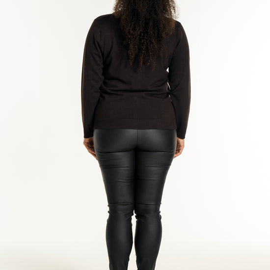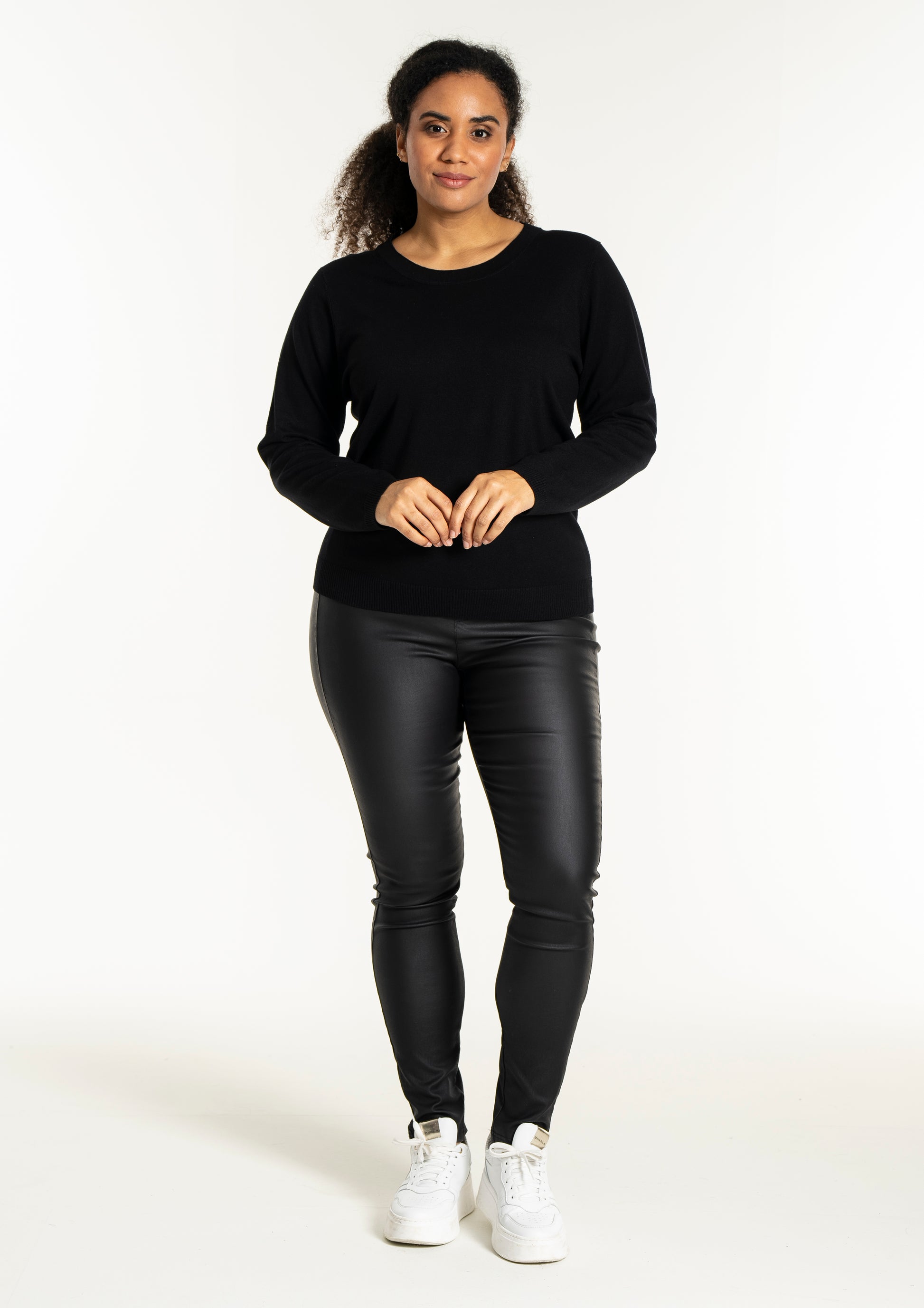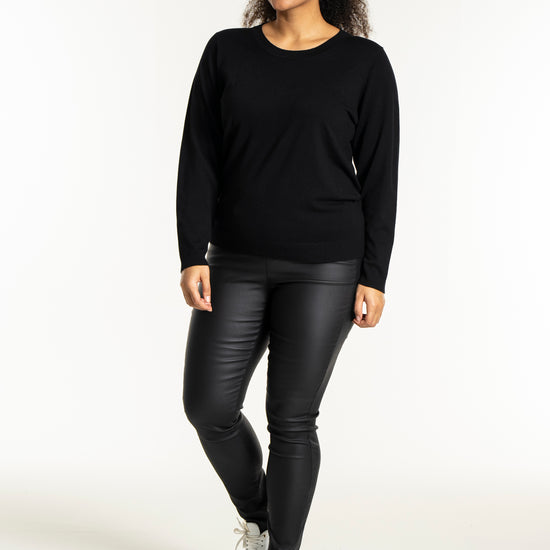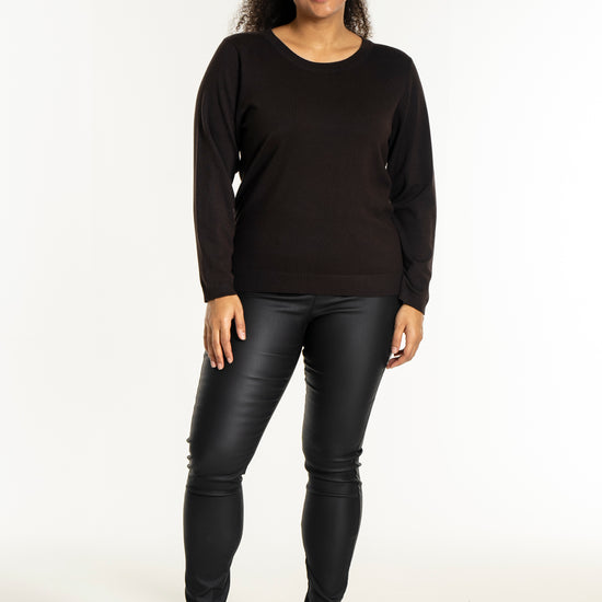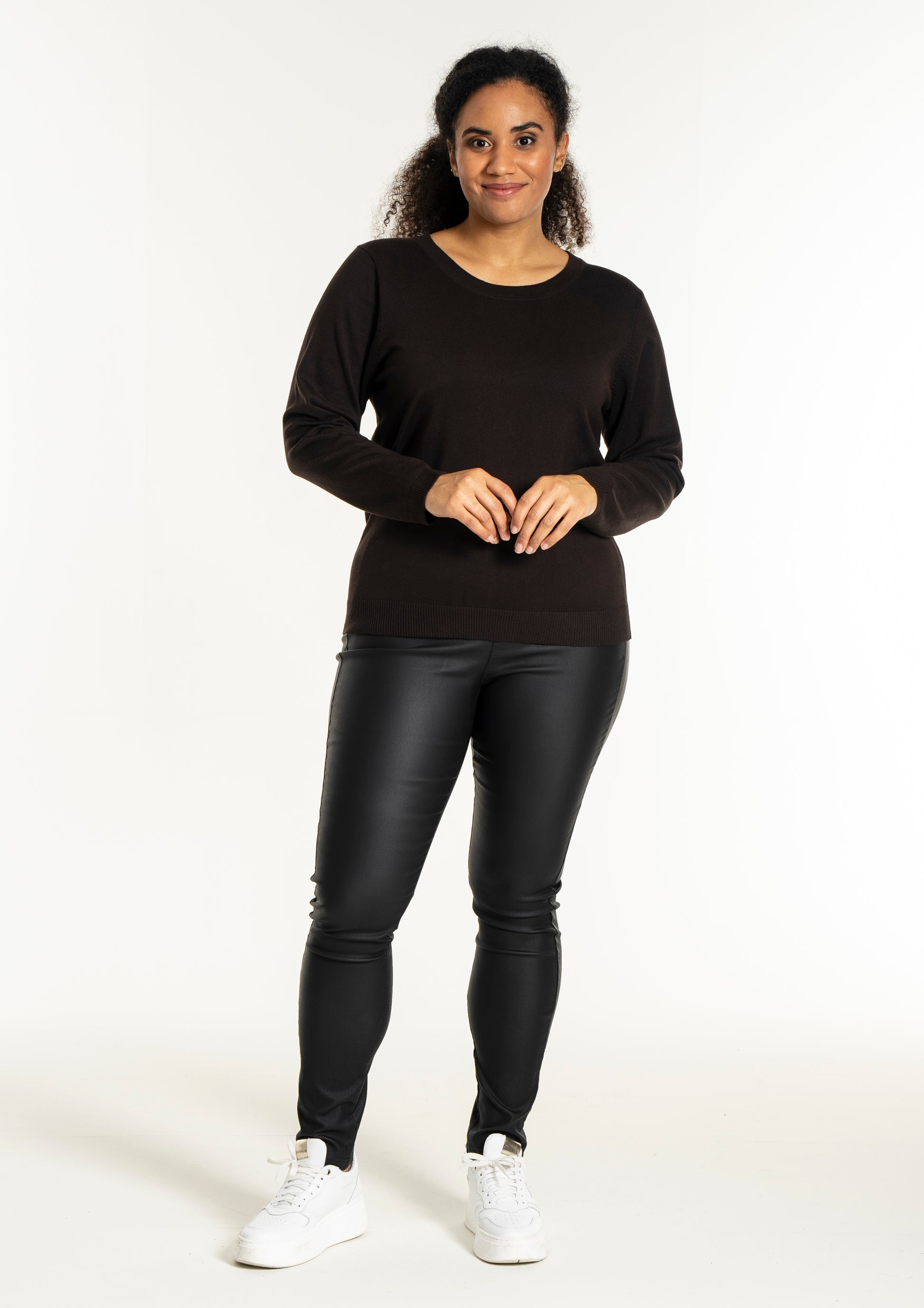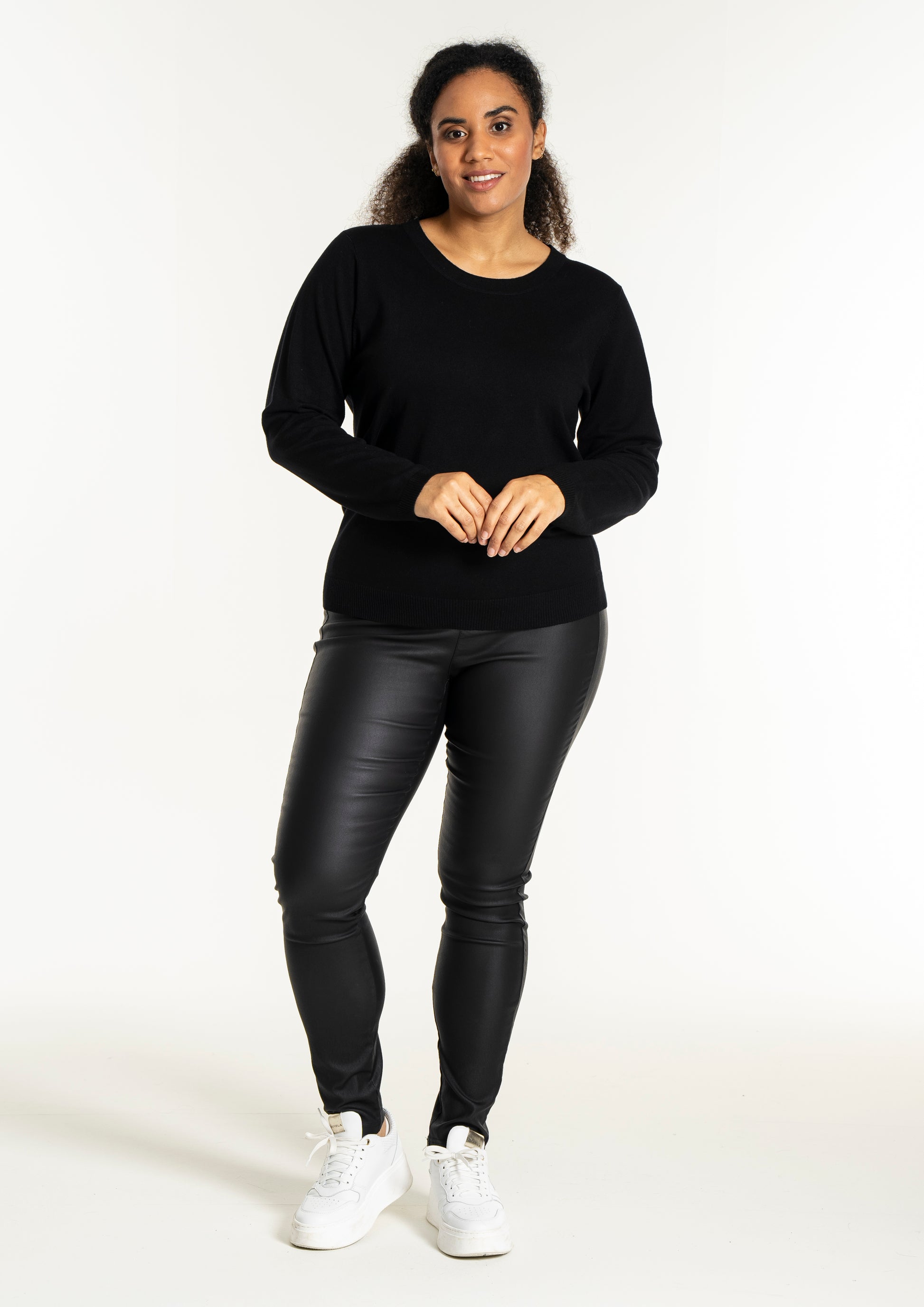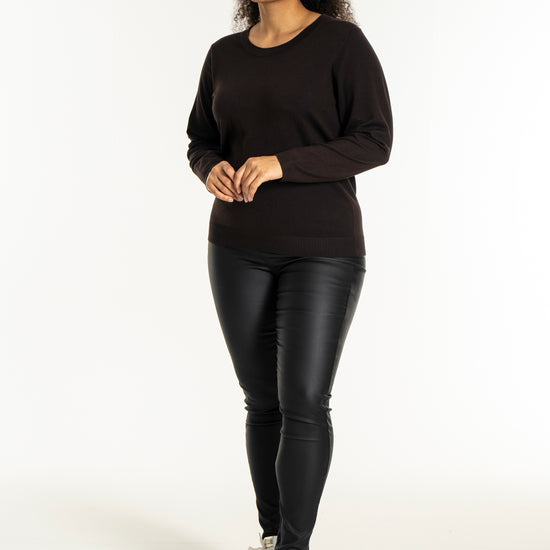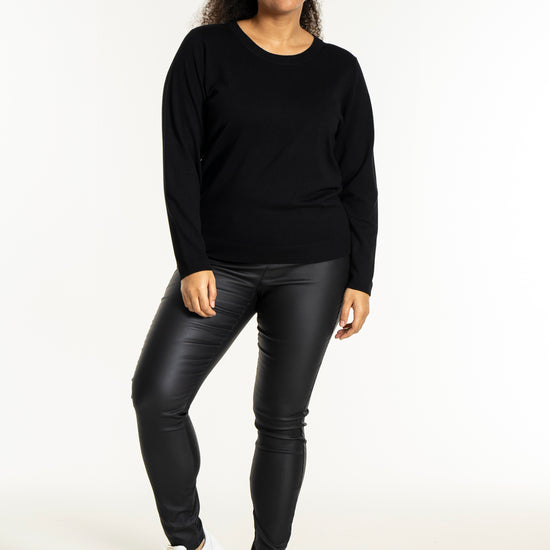 Med sit enkle snit kan denne model nemt sættes sammen med et par smarte bukser i læderlook og sneakers for et moderne hverdagsudtryk. Den hører til blandt de alsidige plus size bluser, der fungerer perfekt til både afslapning og job.