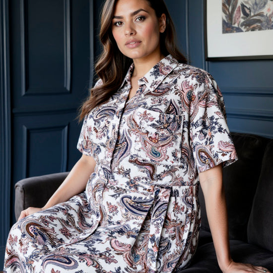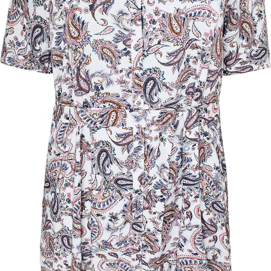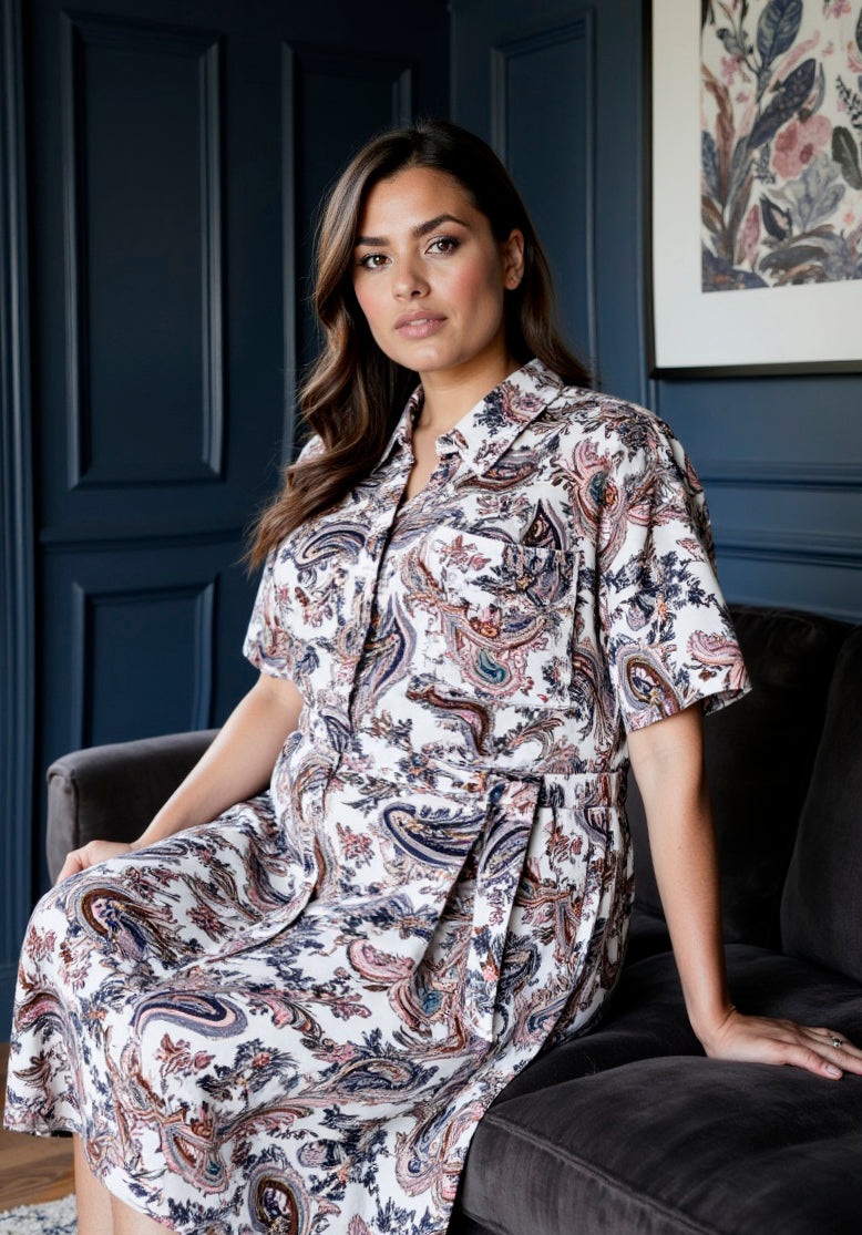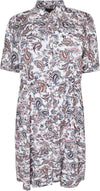 Med sit elegante paisley-mønster og lette materiale, tilbyder denne kjole en stilfuld og sofistikeret look. Den har korte ærmer og en praktisk knaplukning foran, samt et bælte i taljen for en flatterende silhuet.