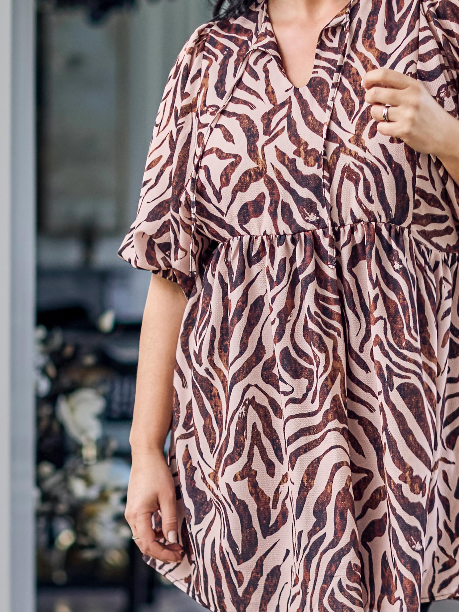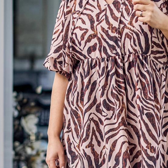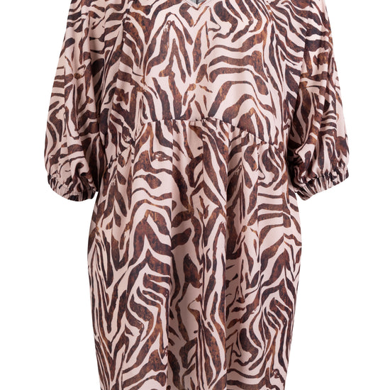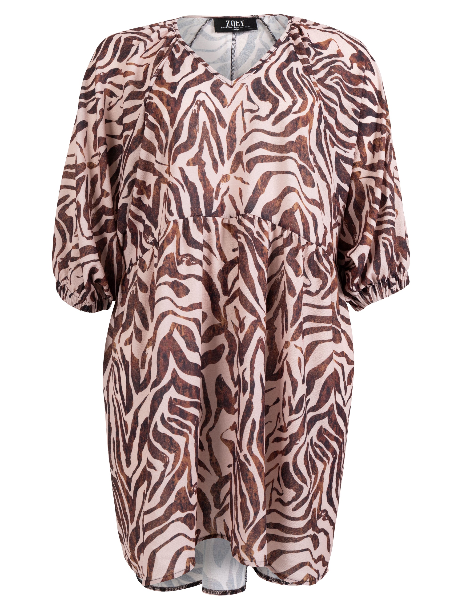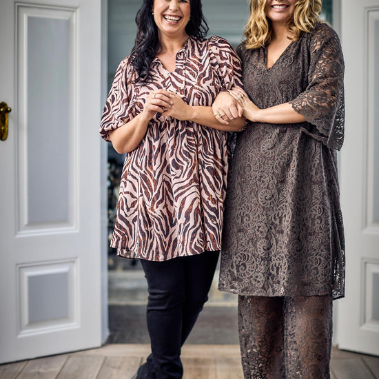 Denne elegante overdel fra ZOEY fanger straks øjet med sit abstrakte dyreprint i støvede, varme nuancer der giver glød til ansigtet. Modellen er fremstillet i en blød kvalitet, som falder let om kroppen, og den er designet med en flatterende V-hals samt mellemlange ærmer, der afsluttes med en elastikkant for et feminint udtryk.