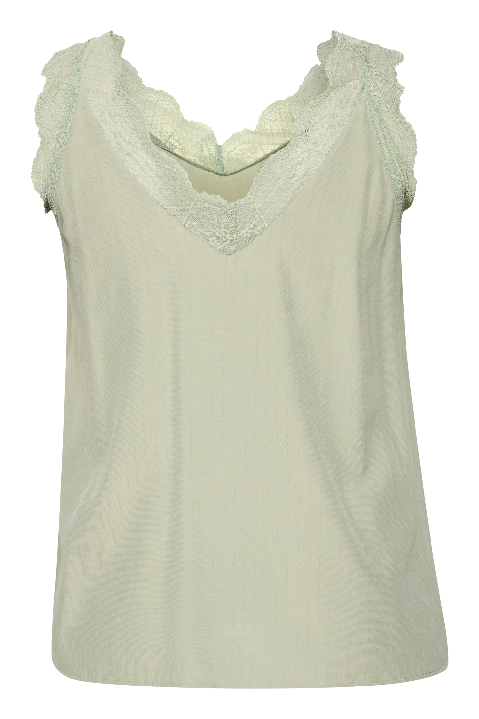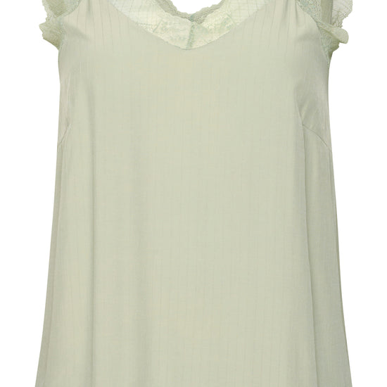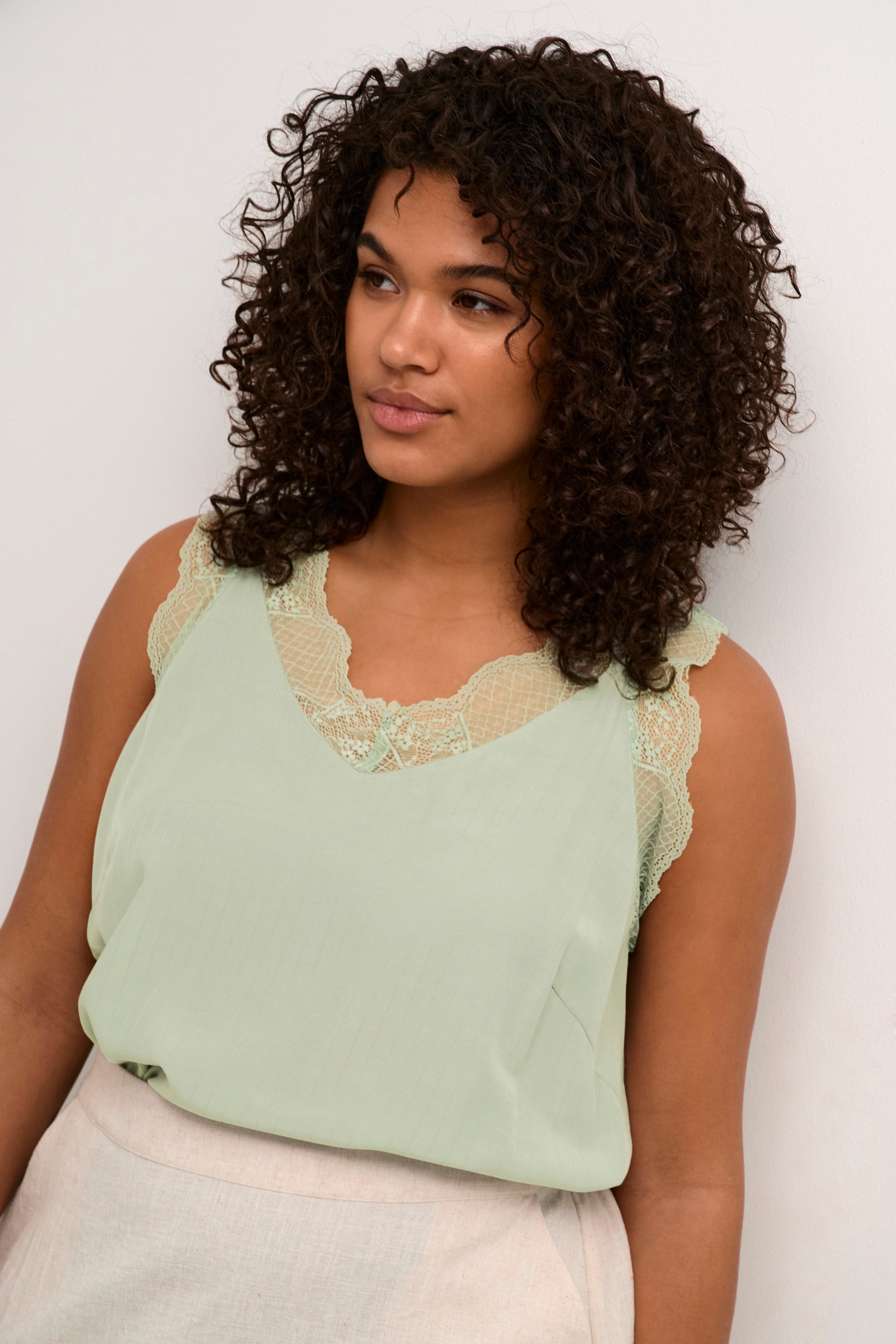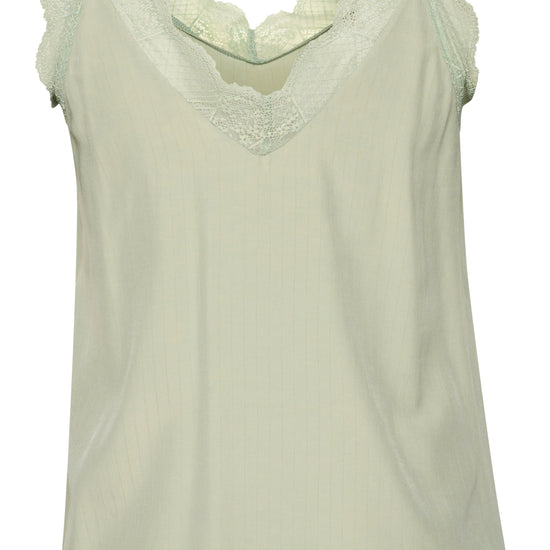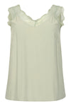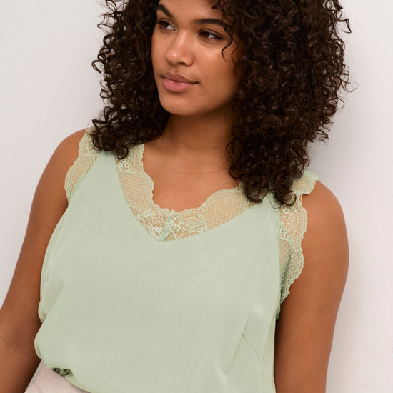 Med sine blondekanter og den smukke mintgrønne farve, udstråler denne top et feminint og sofistikeret look. Den dybe V-udskæring prydet med delikate blondekanter fremhæver halsudskæringen på en elegant måde, hvilket gør toppen perfekt til både hverdag og særlige anledninger.