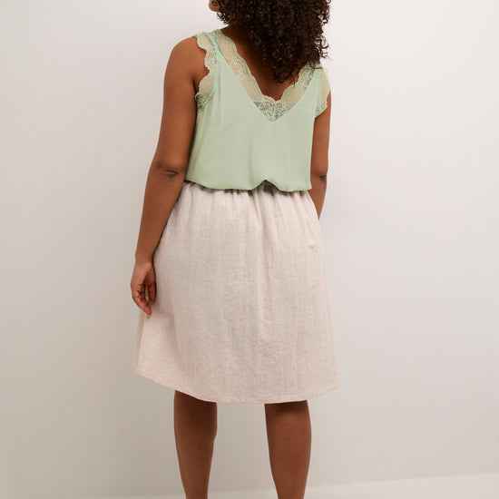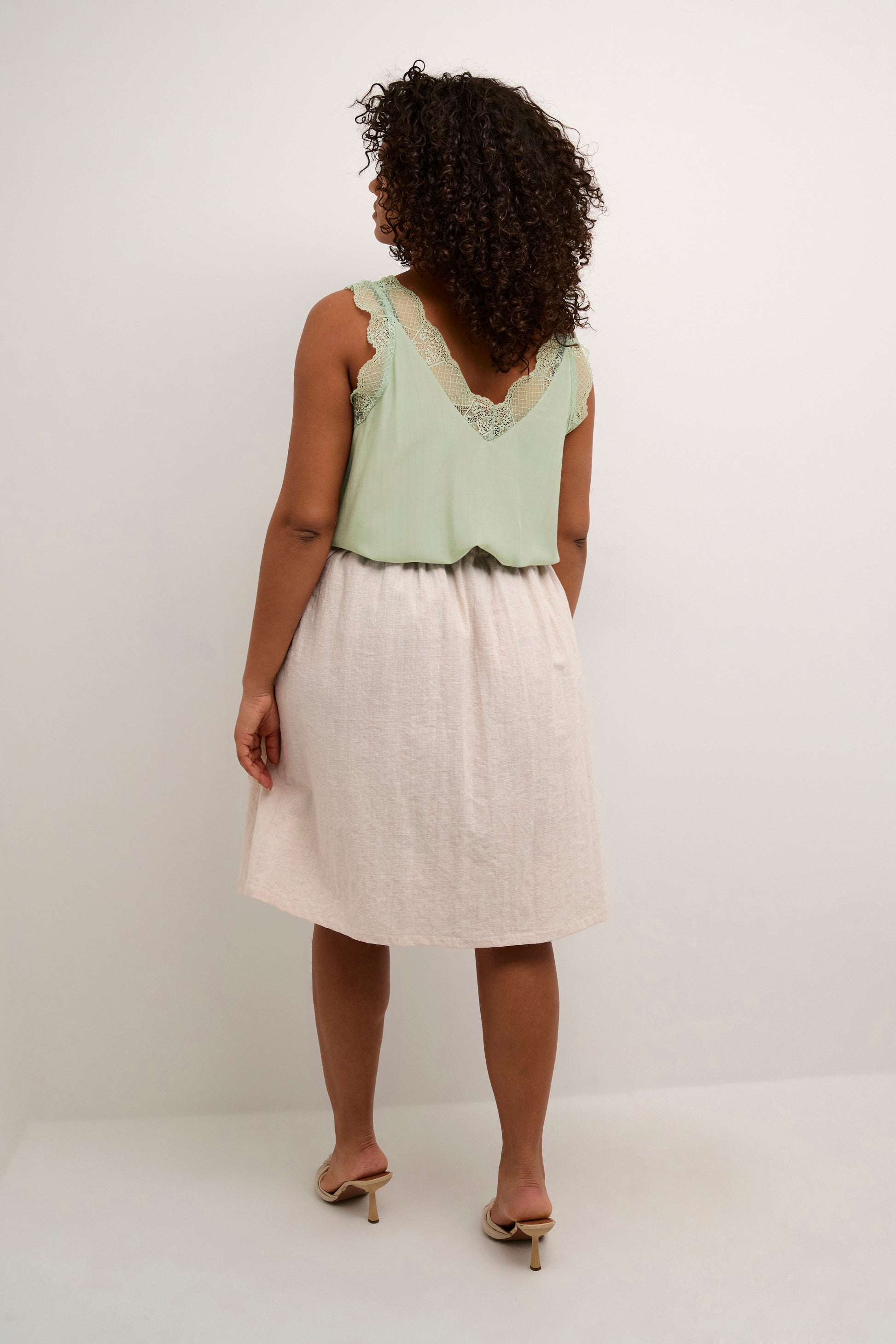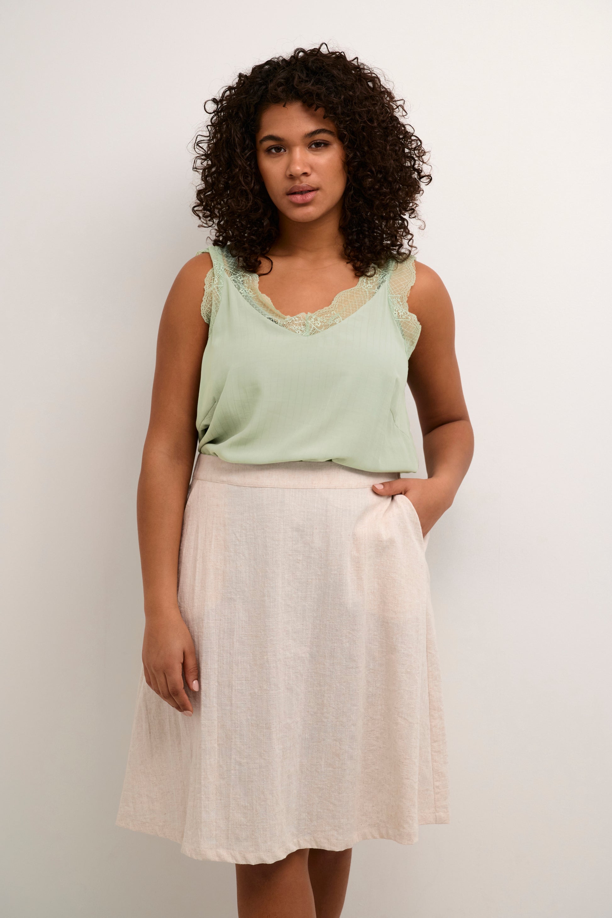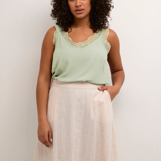 Med sine blondekanter og den smukke mintgrønne farve, udstråler denne top et feminint og sofistikeret look. Den dybe V-udskæring prydet med delikate blondekanter fremhæver halsudskæringen på en elegant måde, hvilket gør toppen perfekt til både hverdag og særlige anledninger.