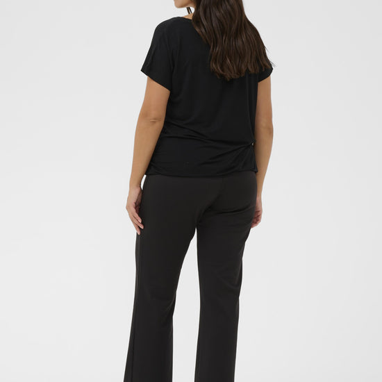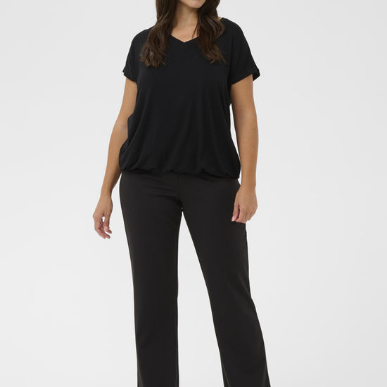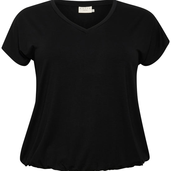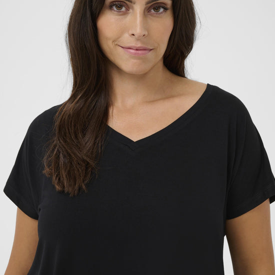 Denne sorte t-shirt fra Kaffe Curve er en uundværlig del af basisgarderoben og byder på et enkelt men stilfuldt design præget af rene linjer. Modellen har en flatterende v-udskæring, der giver et feminint udtryk, samt korte ærmer der falder let og ubesværet om skuldrene. Pasformen er afslappet, hvilket sikrer, at den ikke sidder for stramt, men i stedet falder pænt ned over kroppen med en flot silhuet.