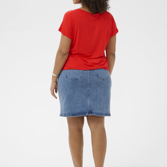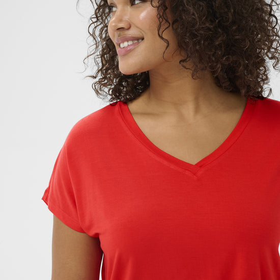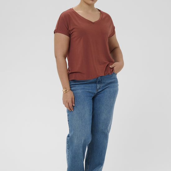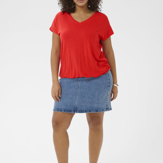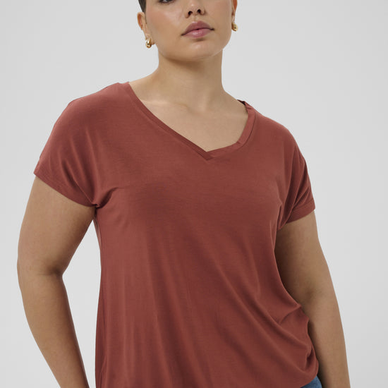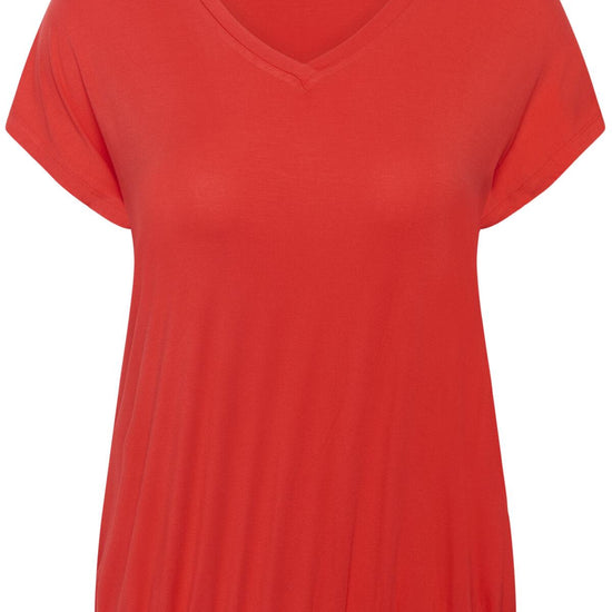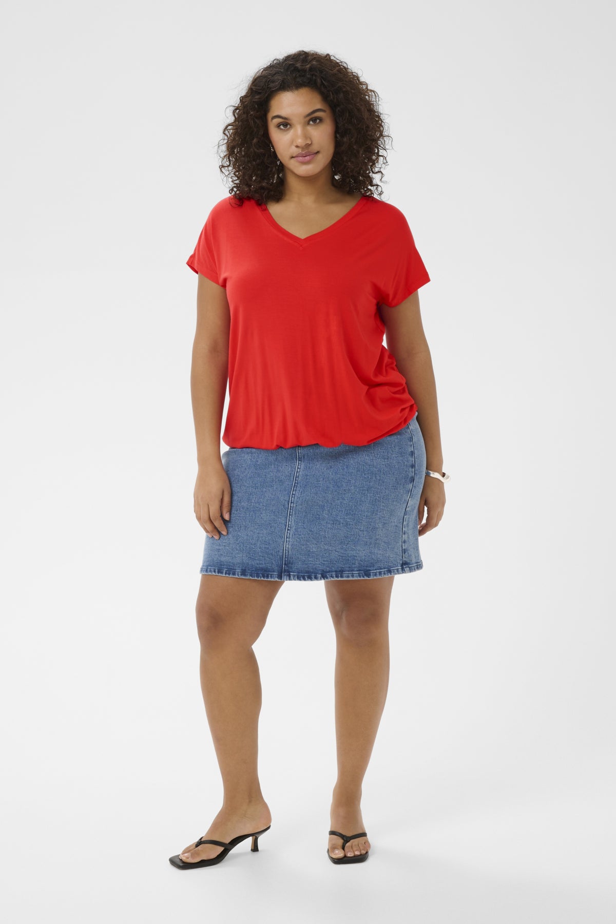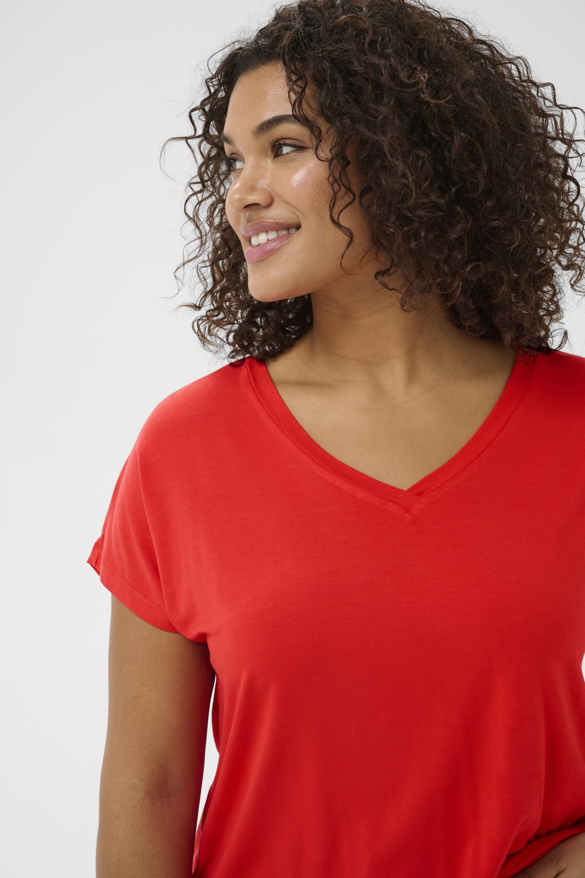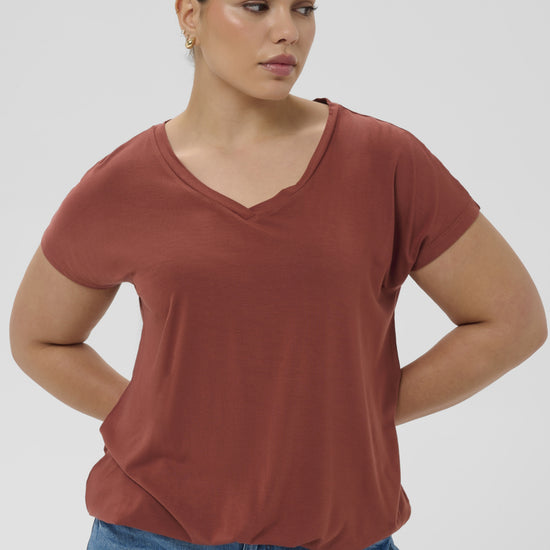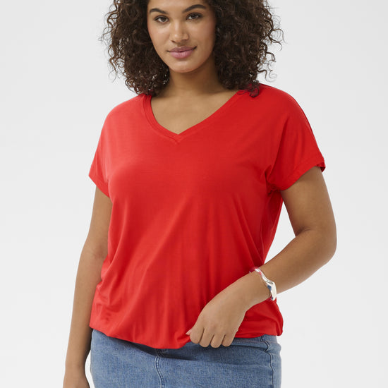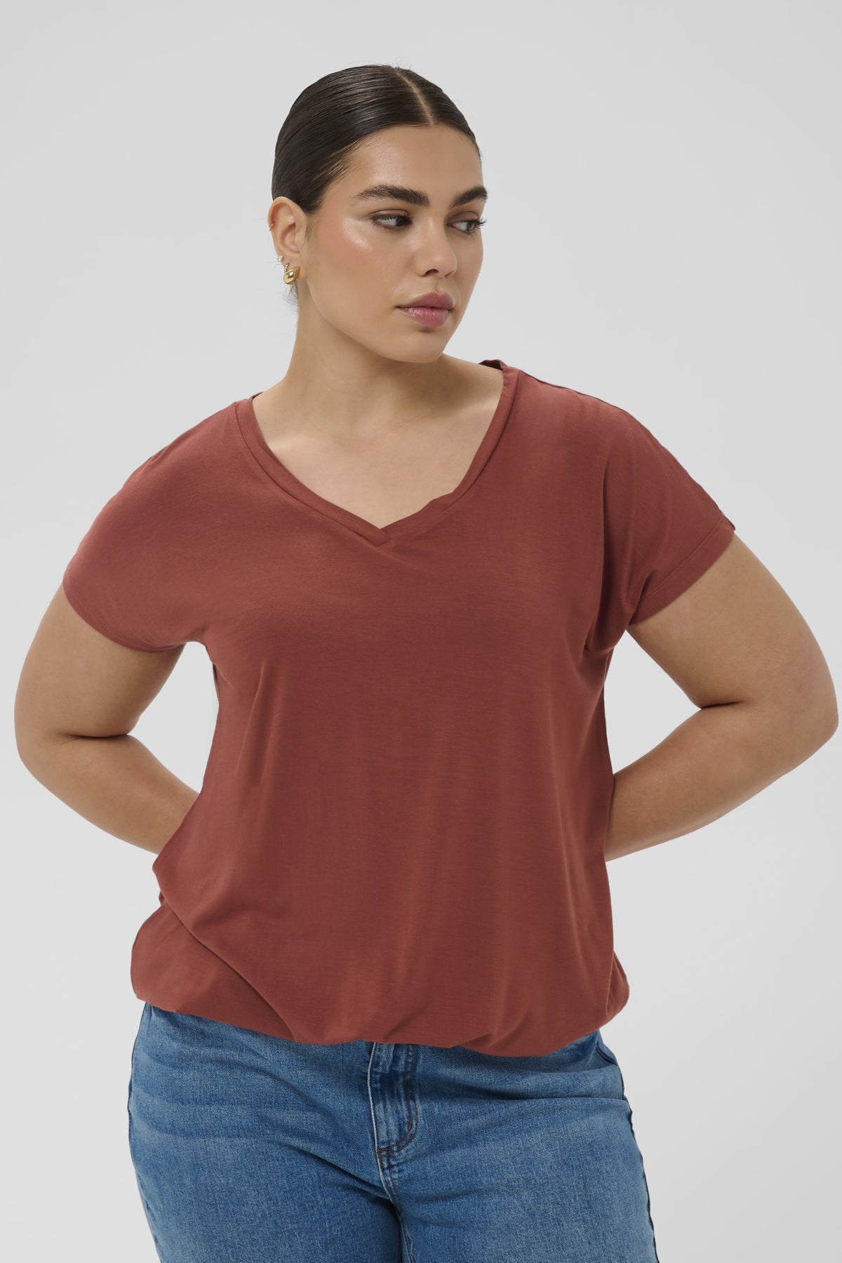 Denne bløde og utroligt lækre overdel er et musthave i enhver garderobe, når komfort og stil skal gå op i en højere enhed. Den besidder en smuk og feminin v-udskæring, der fremhæver halsen og kravebenene på fineste vis. Modellen byder desuden på pæne korte ærmer og et løst, let fald, der smyger sig flot om kroppen helt uden at stramme. Du får her et skønt og velsiddende design fra det populære mærke kaffe curve, som altid leverer fantastiske pasformer til kvindelige kurver.