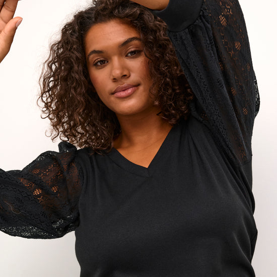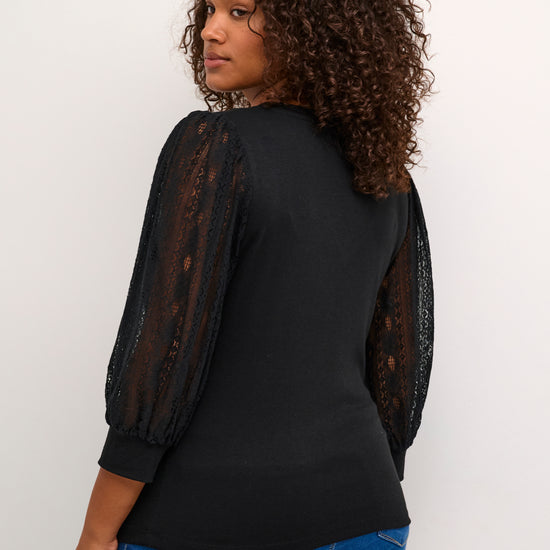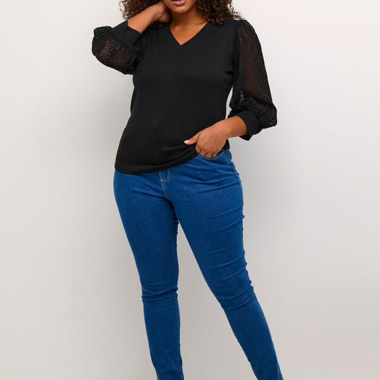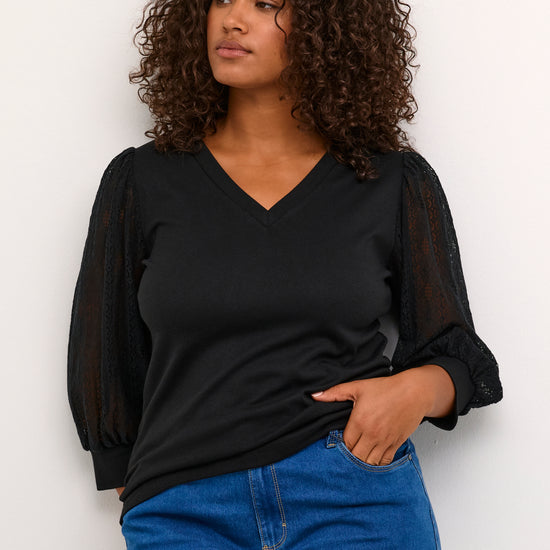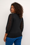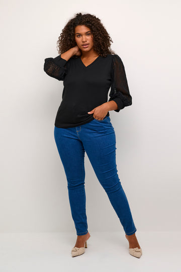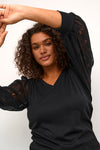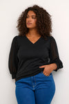 Denne elegante bluse med 3/4 lange ærmer fra Kaffe Curve er designet til at fremhæve din figur med stil og komfort. Fremstillet i en blød og strækbar blanding tilbyder denne bluse en behagelig pasform, der bevæger sig med dig gennem dagen.