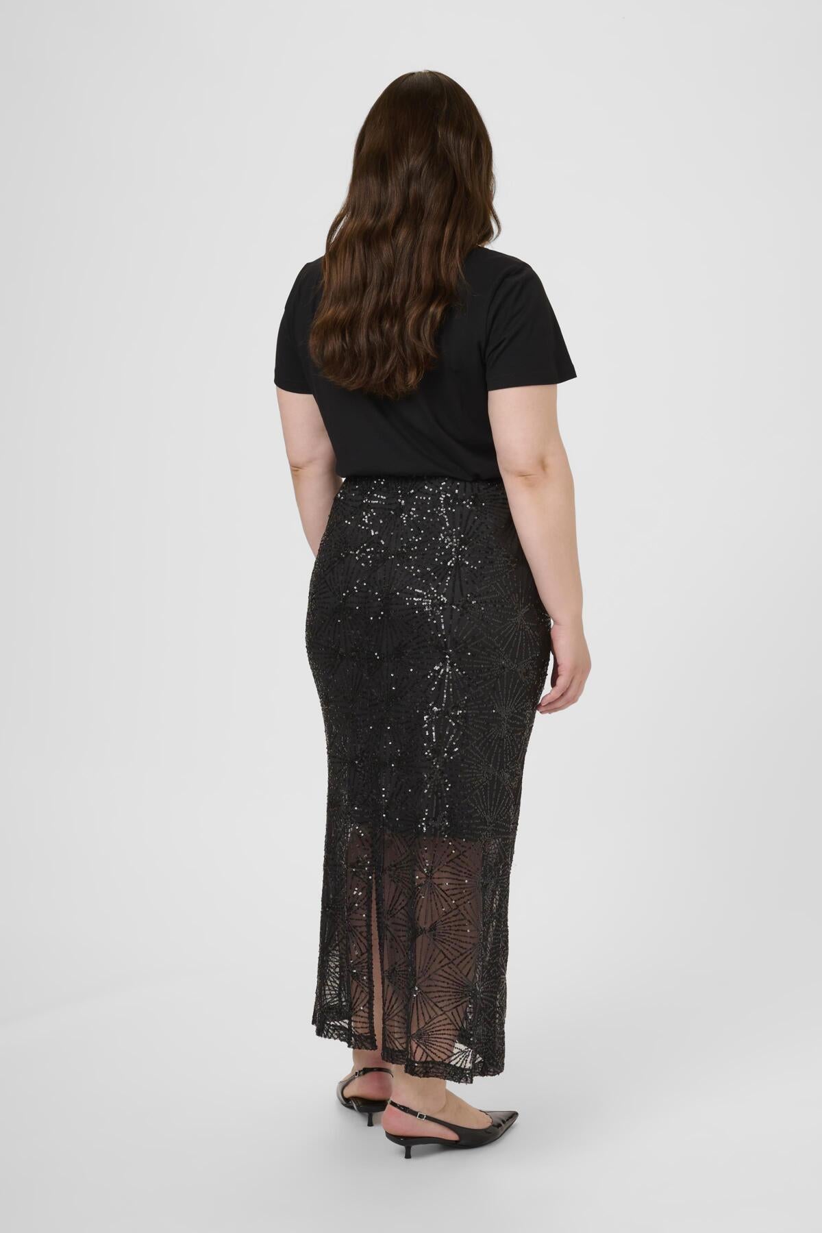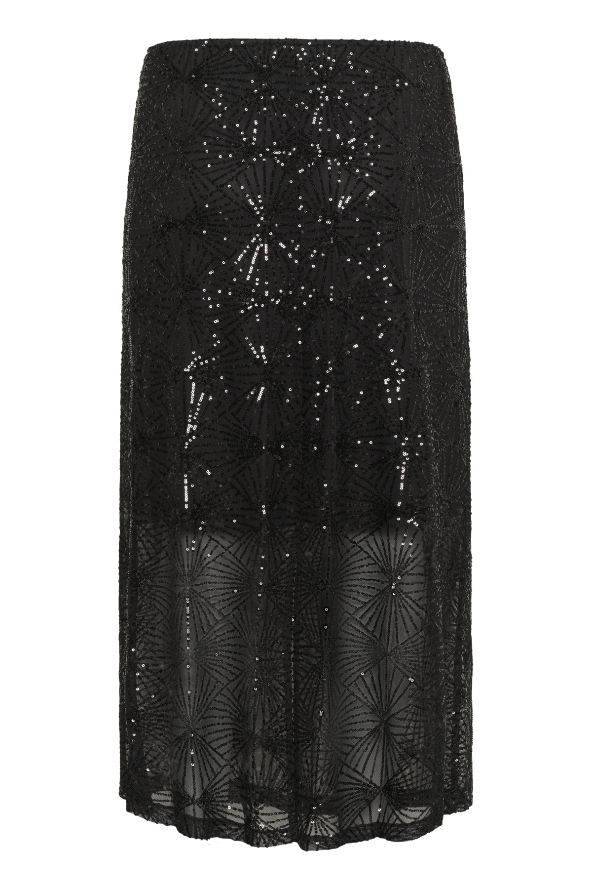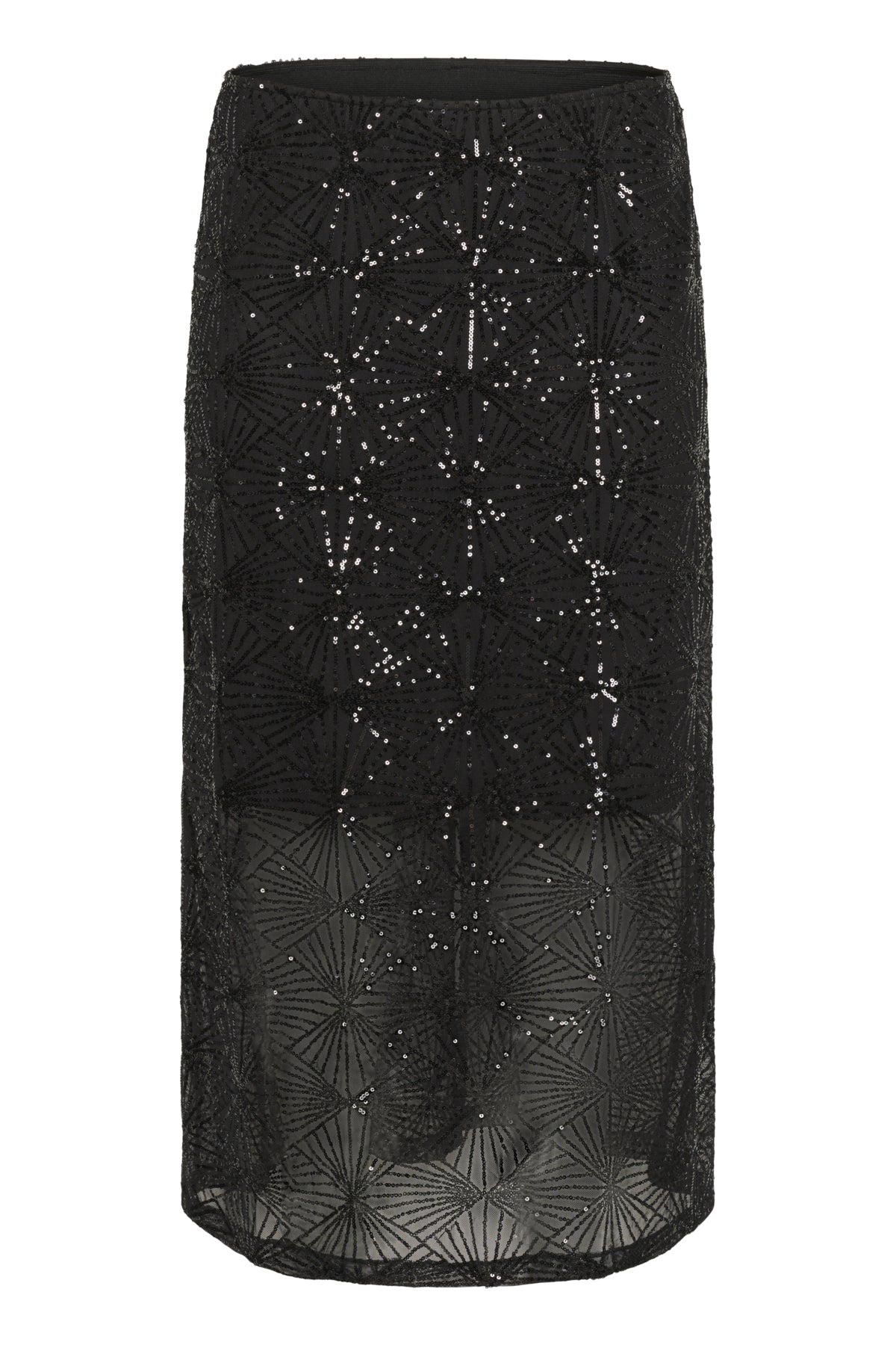 Skab et sofistikeret og eksklusivt look med denne lange nederdel fra Kaffe Curve. Nederdelen er udført i 100% polyester og har et gennemsigtigt yderlag med dekorative stjerne- eller blomstermotiver samt glitrende detaljer, der giver et ekstra festligt udtryk. En sort undernederdel sikrer komfort og diskretion, mens den klassiske sorte farve og det lange snit giver en elegant silhuet.