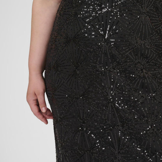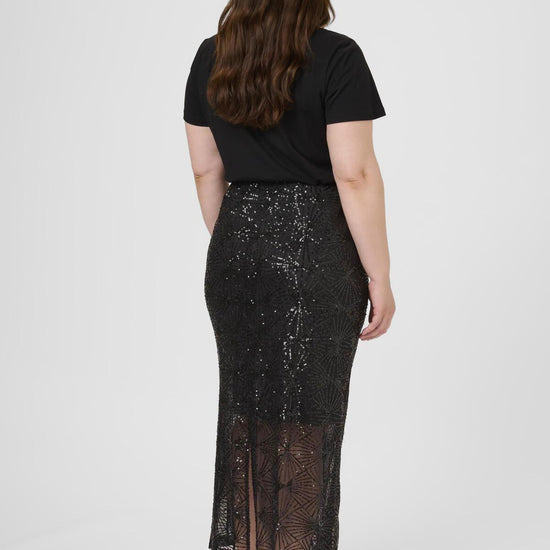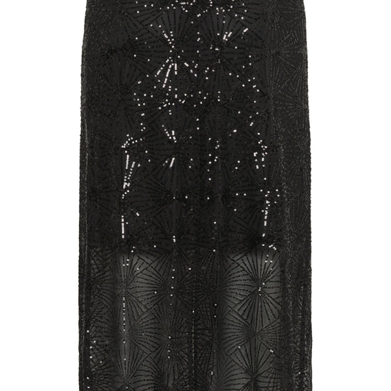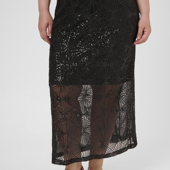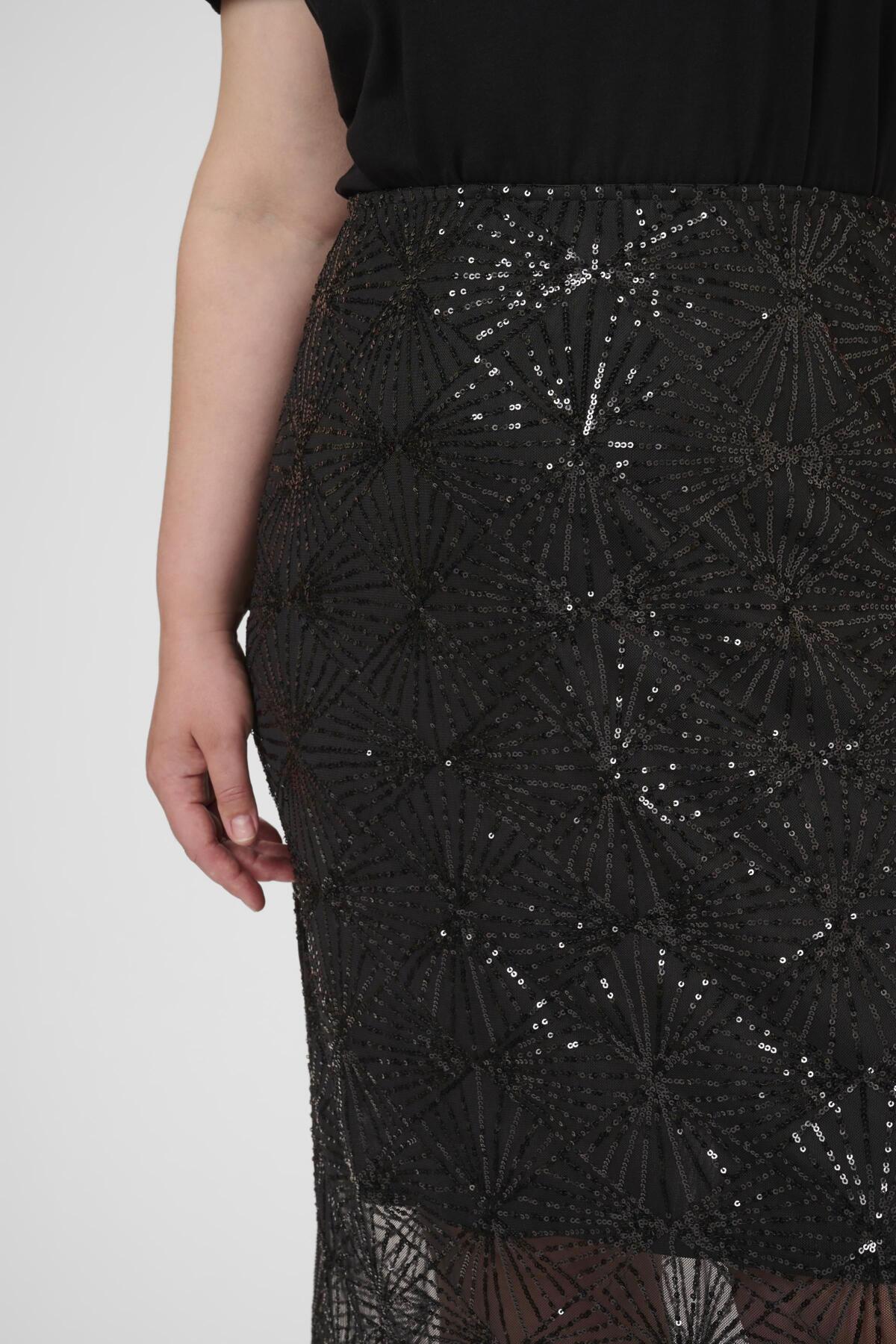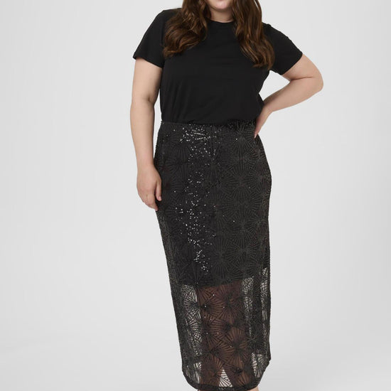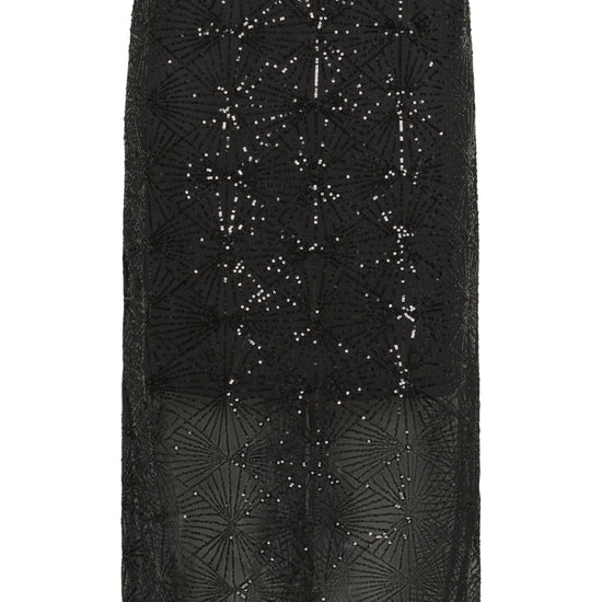Skab et sofistikeret og eksklusivt look med denne lange nederdel fra Kaffe Curve. Nederdelen er udført i 100% polyester og har et gennemsigtigt yderlag med dekorative stjerne- eller blomstermotiver samt glitrende detaljer, der giver et ekstra festligt udtryk. En sort undernederdel sikrer komfort og diskretion, mens den klassiske sorte farve og det lange snit giver en elegant silhuet.