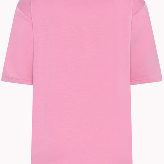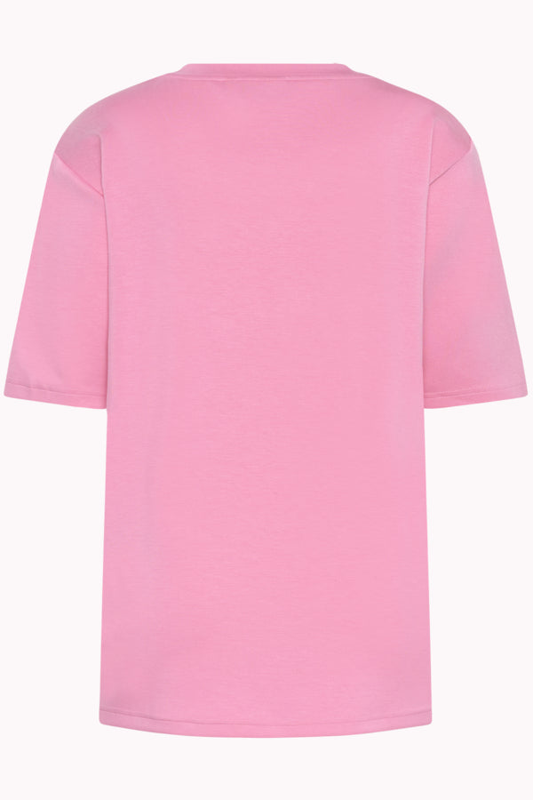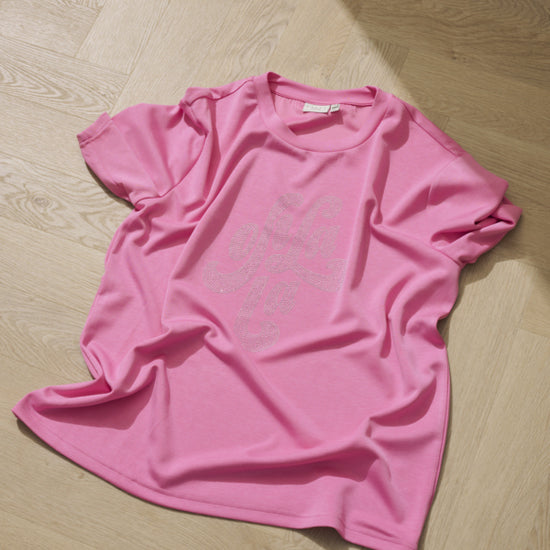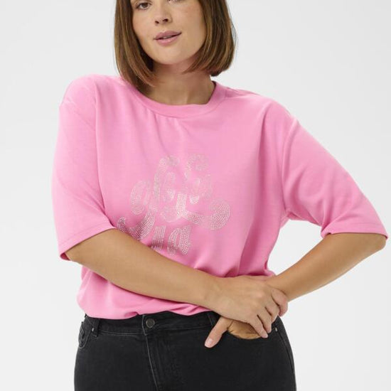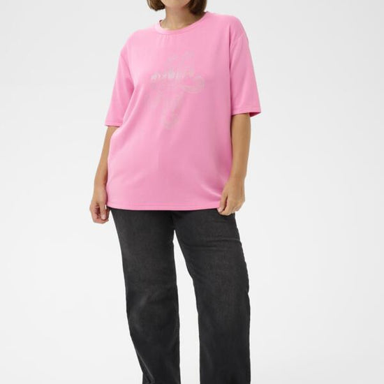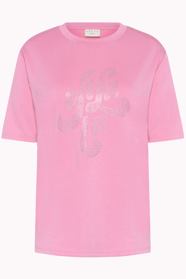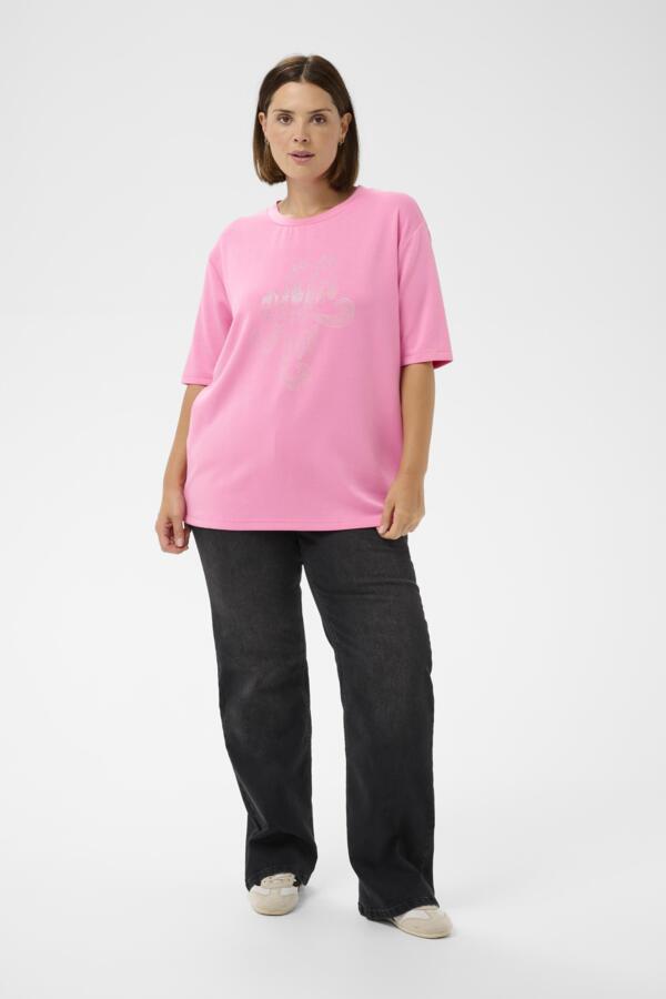 Denne flotte model i farven Pink Power er perfekt til at sætte kulør på garderoben, da den har et friskt og feminint udtryk. På fronten ses teksten "Oh la la" skrevet med små, fine rhinsten, der giver et diskret spil i lyset, hvilket gør den til en af de mere iøjnefaldende t-shirts fra Kaffe Curve. Toppen er lavet i en blød blanding med stræk, der sikrer høj komfort dagen lang.