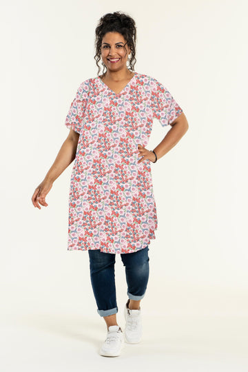Forvandl din garderobe med denne kjole fra Studio, der kombinerer et afslappet snit med et livligt blomsterprint. Denne kjole er fremstillet i 100% viskose, hvilket sikrer en let og luftig følelse, perfekt til de varmere dage. Med sin A-facon og korte ærmer er kjolen både flatterende og komfortabel at have på.