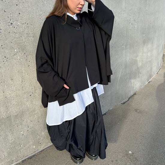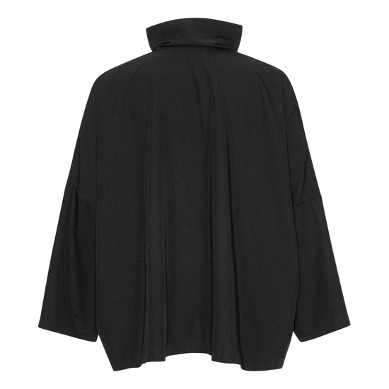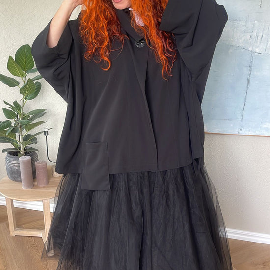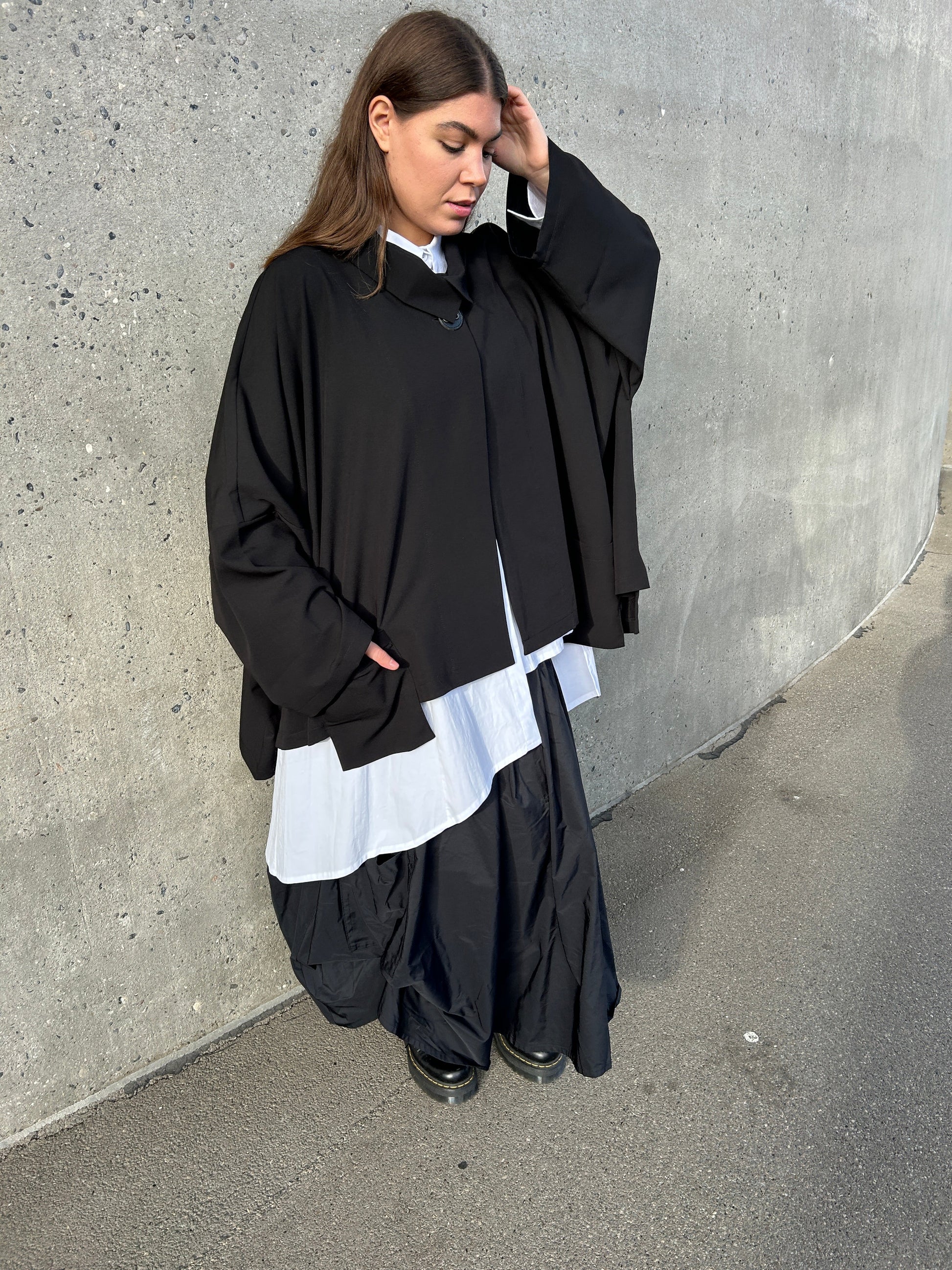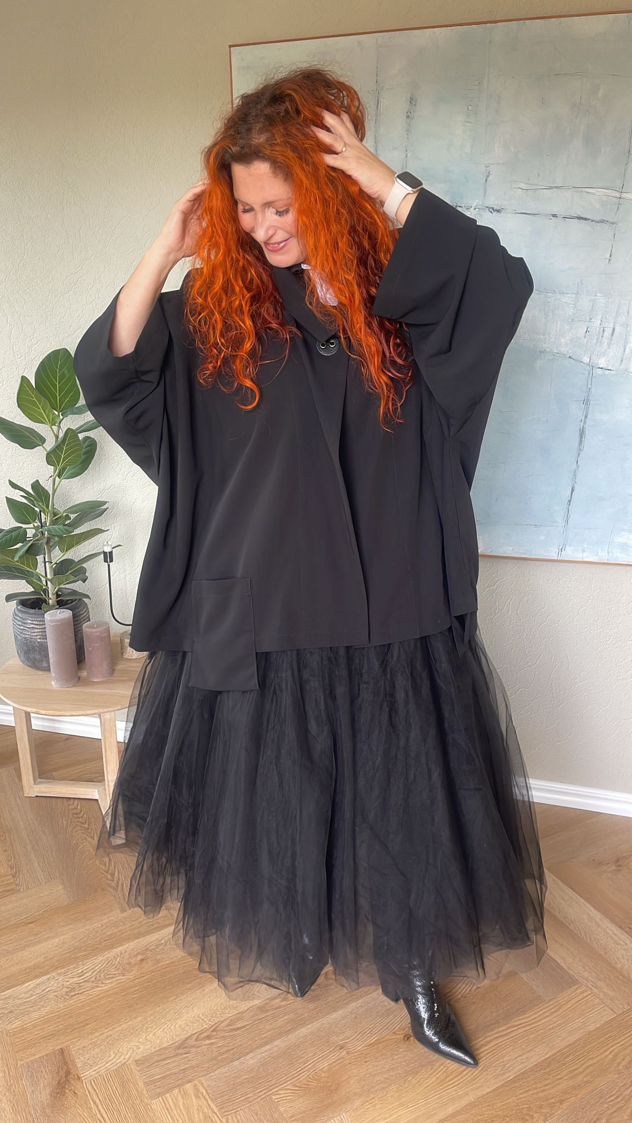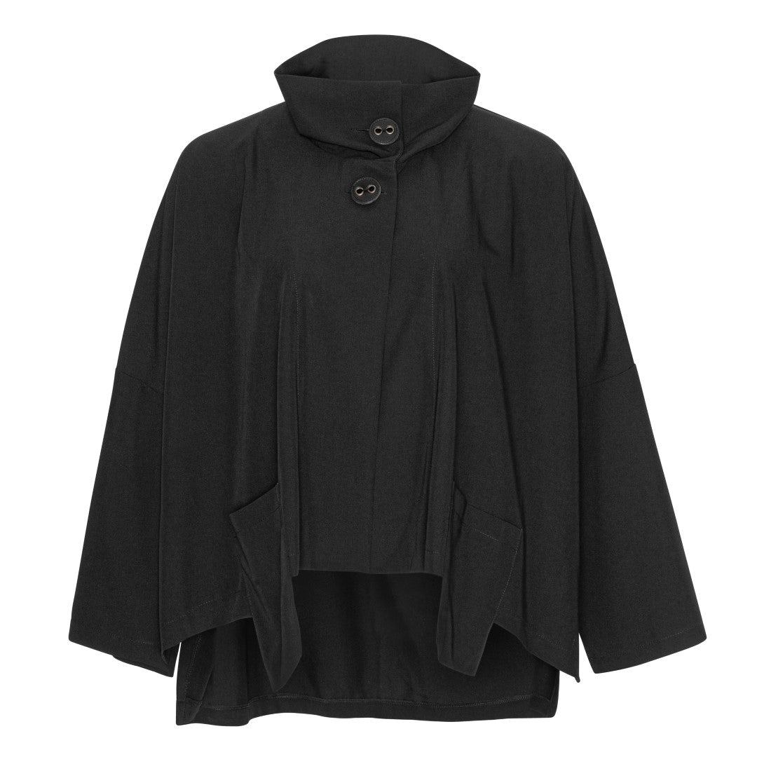 Denne sorte jakke er perfekt til enhver lejlighed. Fremstillet med fokus på detaljer. Lukkes med to store flotte knapper i halsen og kan selvfølgelig styles åben. Længere bagpå end foran og to store løsthængende lommer foran. Denne jakke er perfekt til enhver lejlighed, om det er en afslappet eller en særlig begivenhed. Dens elegante design og sorte farve gør den alsidig og nem at style.