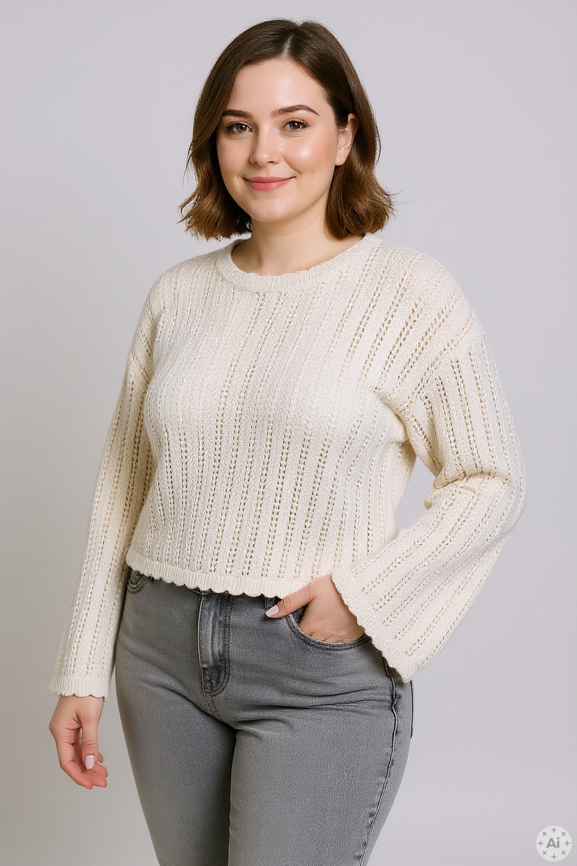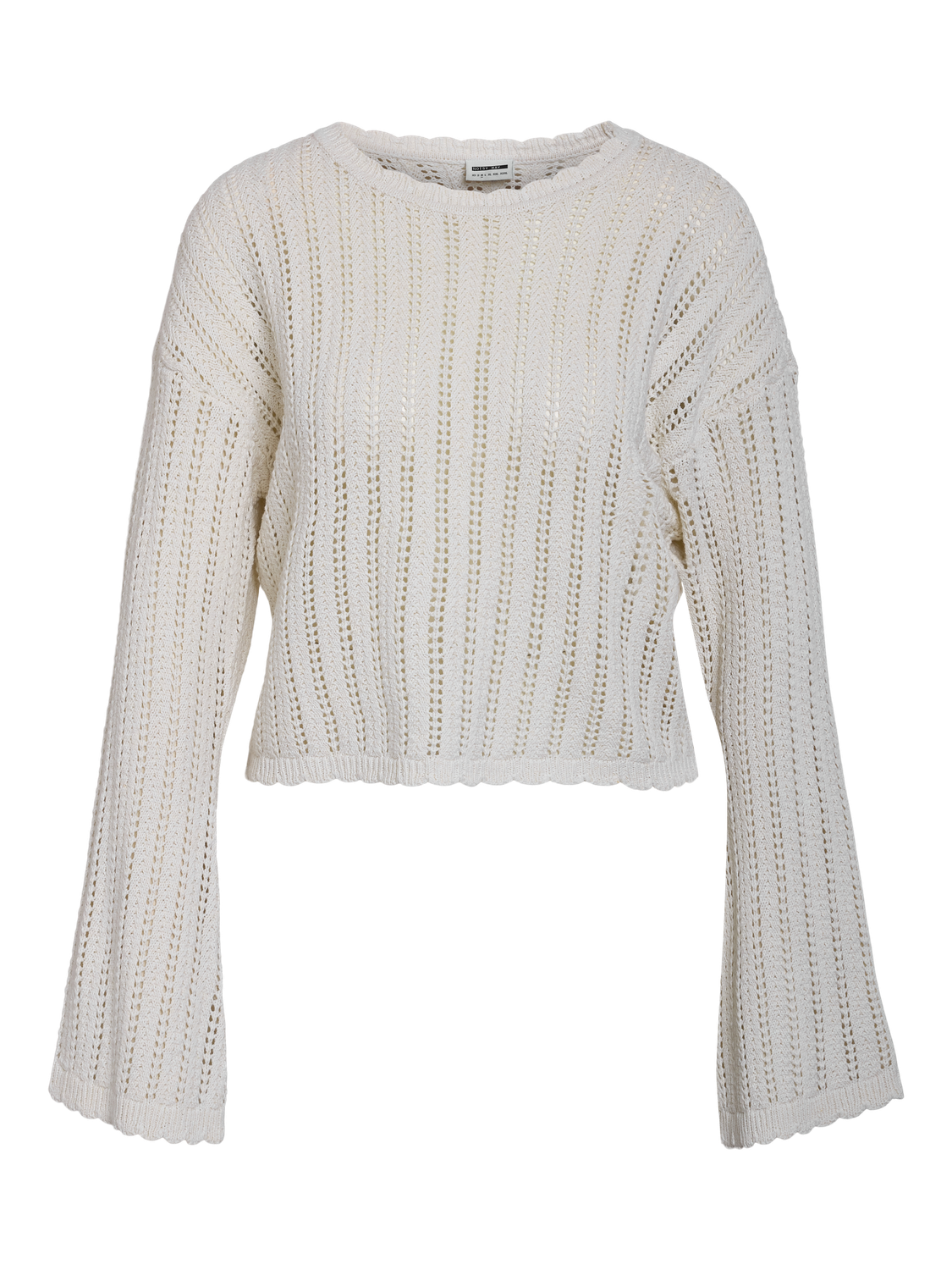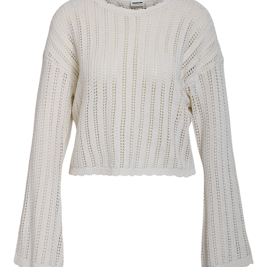 - Detaljer: Rund hals, luftigt strik og bølgede afslutninger
