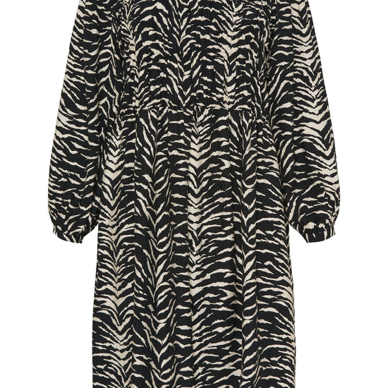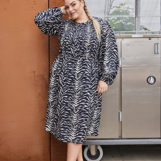 Denne No. 1 by Ox kjole er en sikker vinder i garderoben med sit smukke sorte og cremefarvede print, der giver et moderne og livligt udtryk. Modellen er designet med elastisk smock over brystet samt en rund halsudskæring, hvilket sikrer en både komfortabel og feminin pasform, der fremhæver dine former på fineste vis. De lange ærmer har en let volumen og afsluttes elegant ved håndleddet, hvilket tilføjer et tidløst element til den moderne stil.