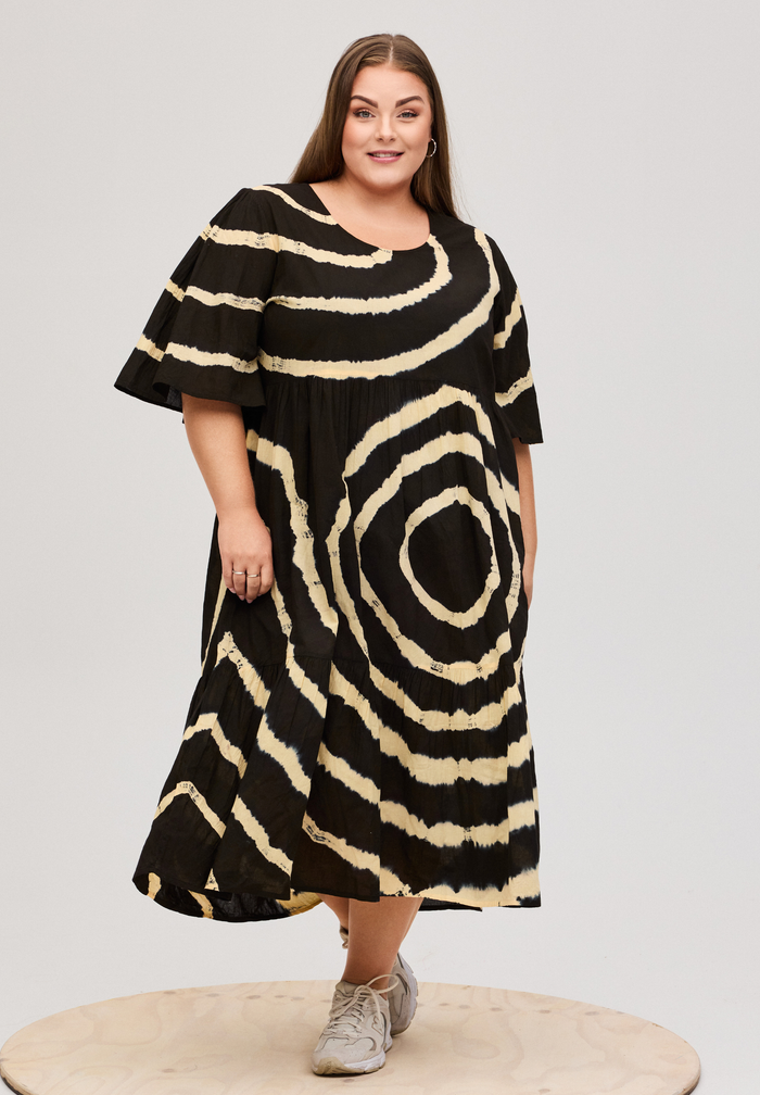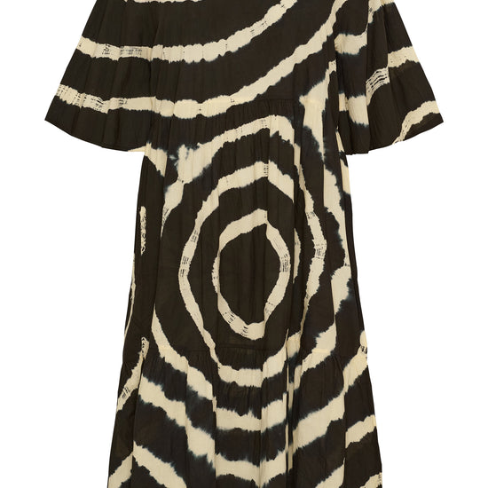 Denne smukke model fra No. 1 by OX er fremstillet i en lækker 100% bomulds kvalitet, der føles blød og åndbar mod huden. Designet er præget af et iøjnefaldende grafisk cirkelmønster i sort og hvid tie-dye, som skaber et moderne og kunstnerisk udtryk. Kjolen er konstrueret med elegante etageinddelinger i skørtet, der giver en flot vidde og et feminint fald, mens de løse, korte ærmer og den runde halsudskæring understreger det afslappede look. Det er en ideel kjole der kombinerer stil med høj komfort.