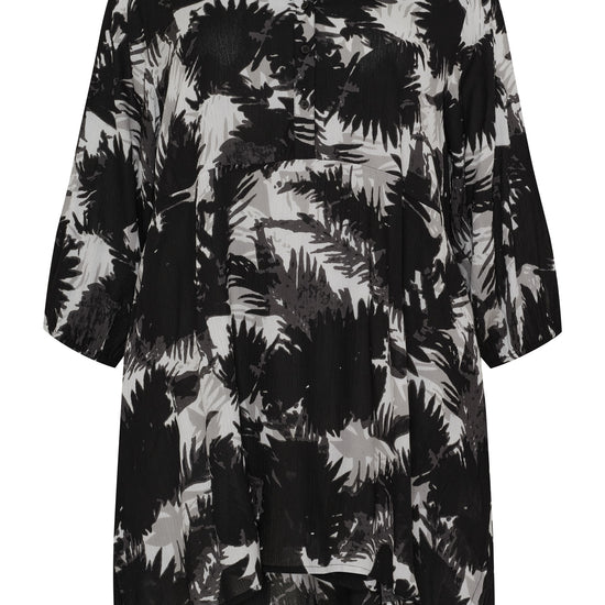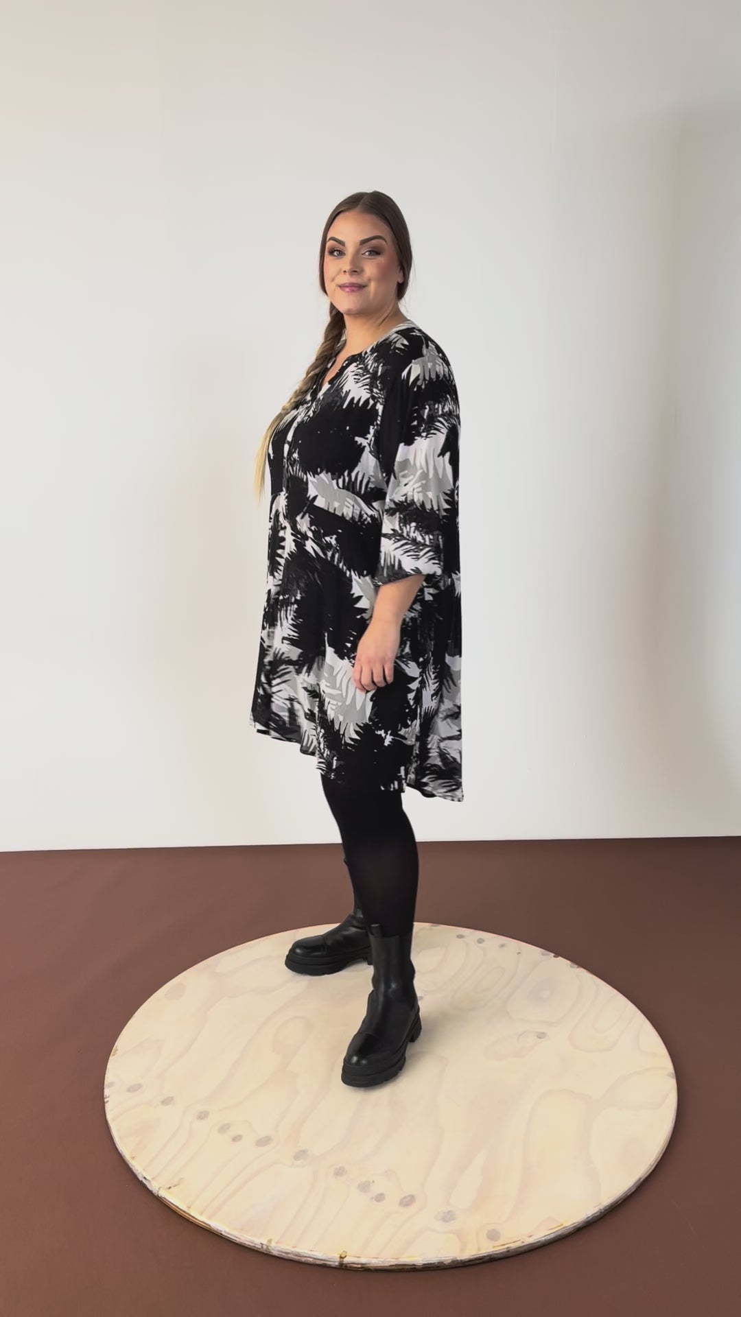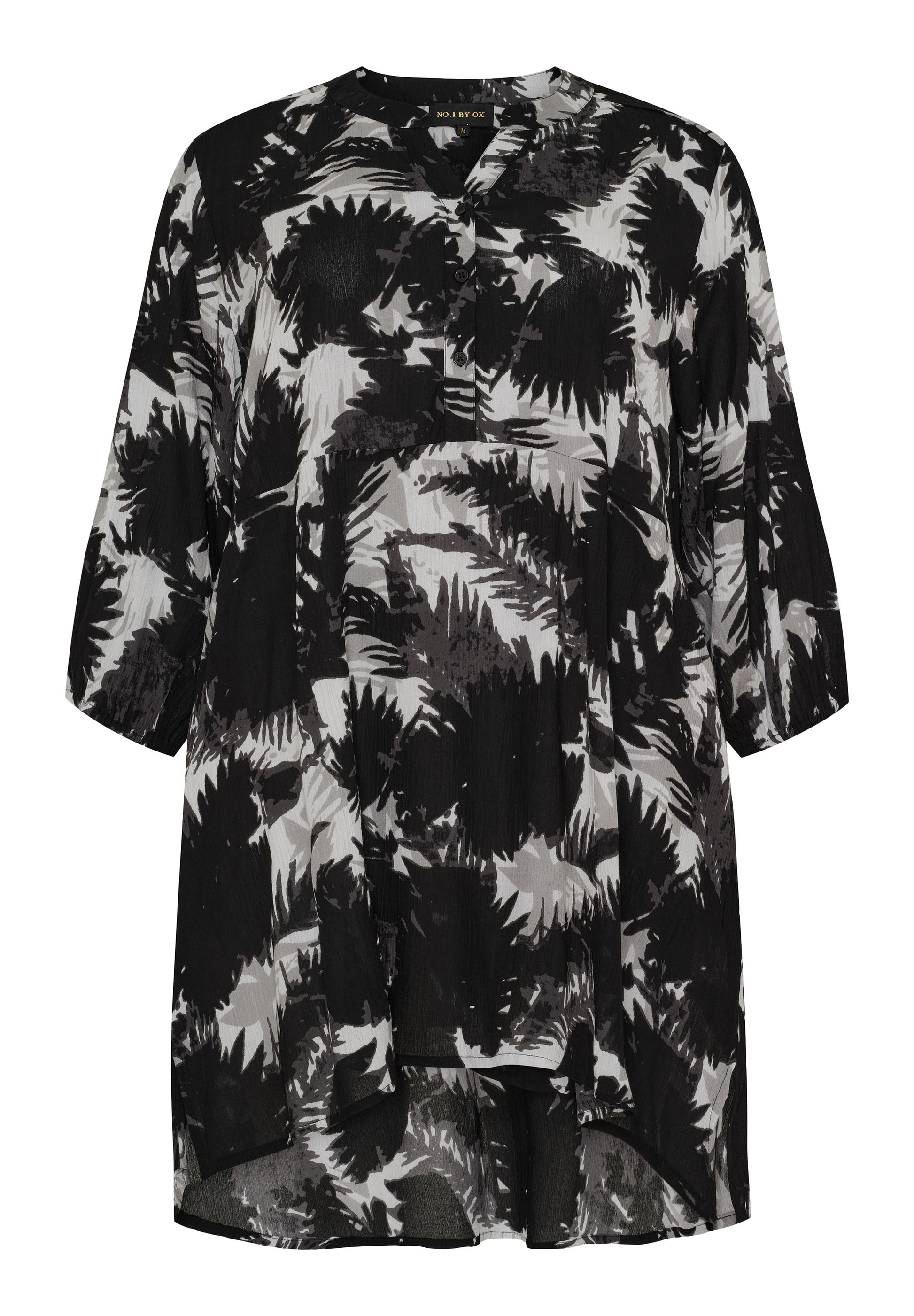Oplev den perfekte kombination af elegance og komfort med denne luftige kjole fra NO. 1 BY OX. Kjolen er lavet af 100% viskose, der sikrer en let og behagelig pasform. Den har et klassisk og elegant print med hvide, sorte og grå blomster, der gør den velegnet til både hverdag og festlige lejligheder. Med 3/4-ærmer, der har elastikkant for en let ballon-effekt, samt en rund halsudskæring med V-åbning, får du et feminint og stilfuldt look.